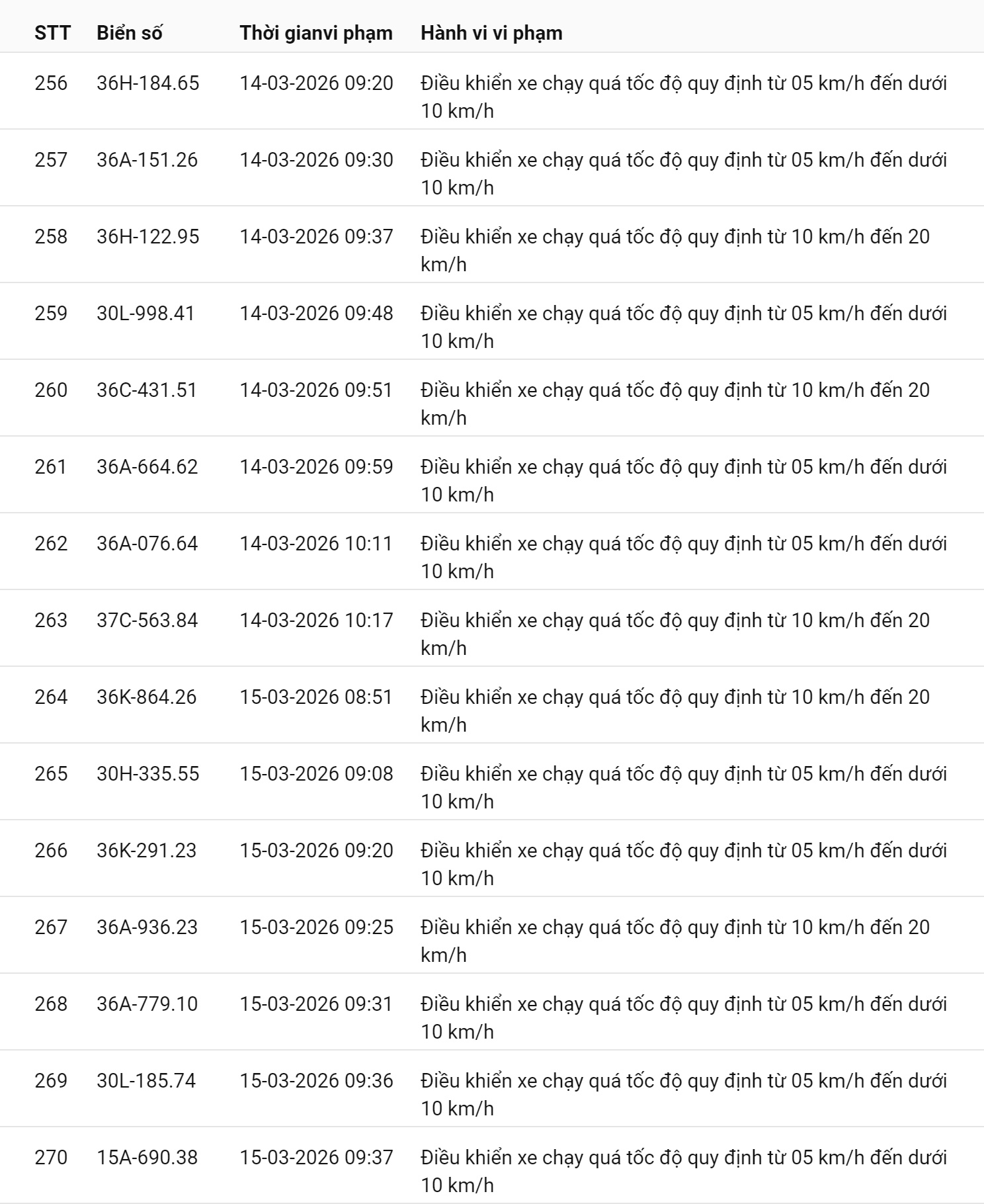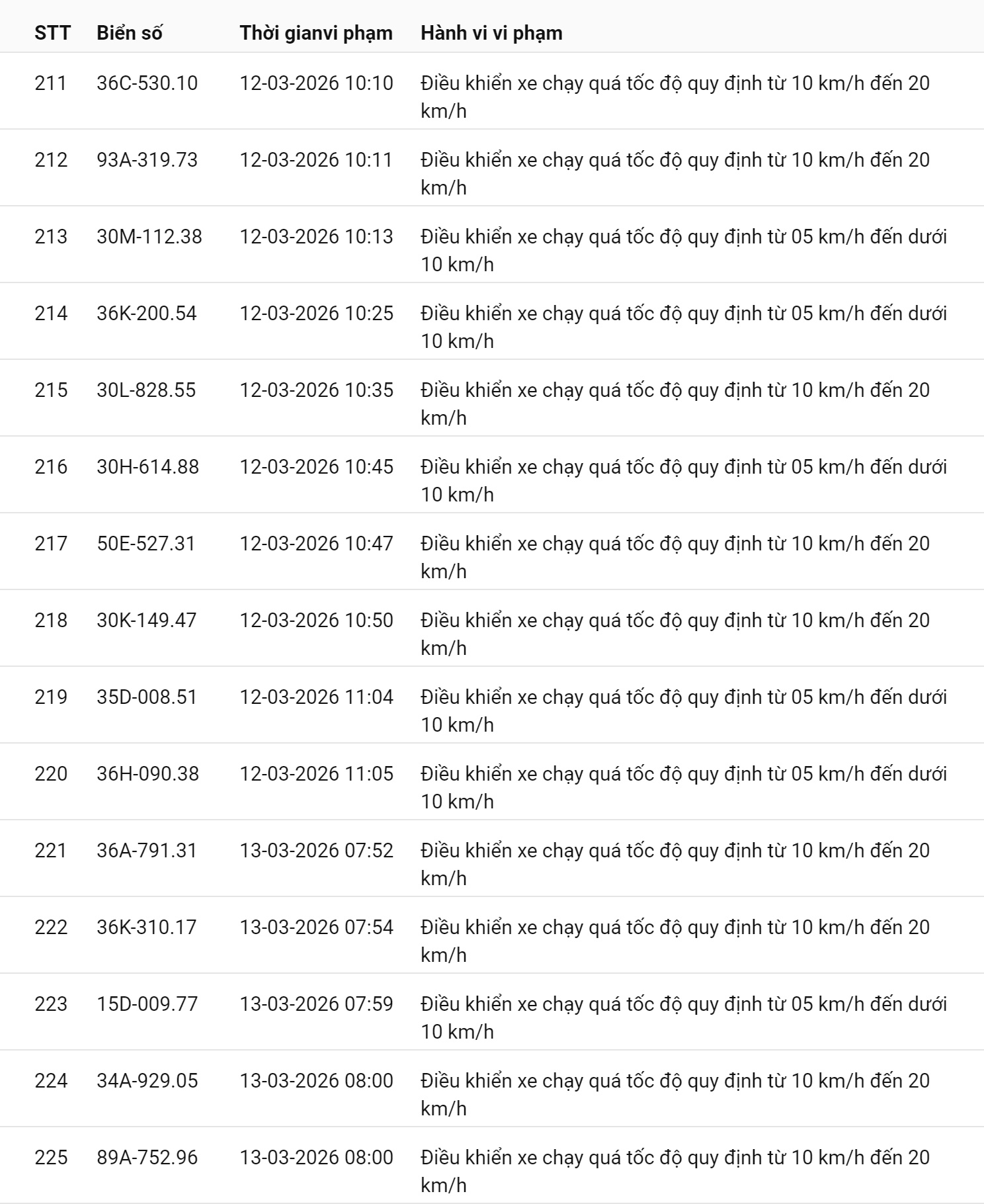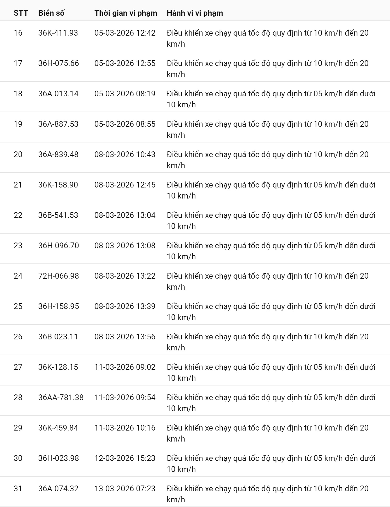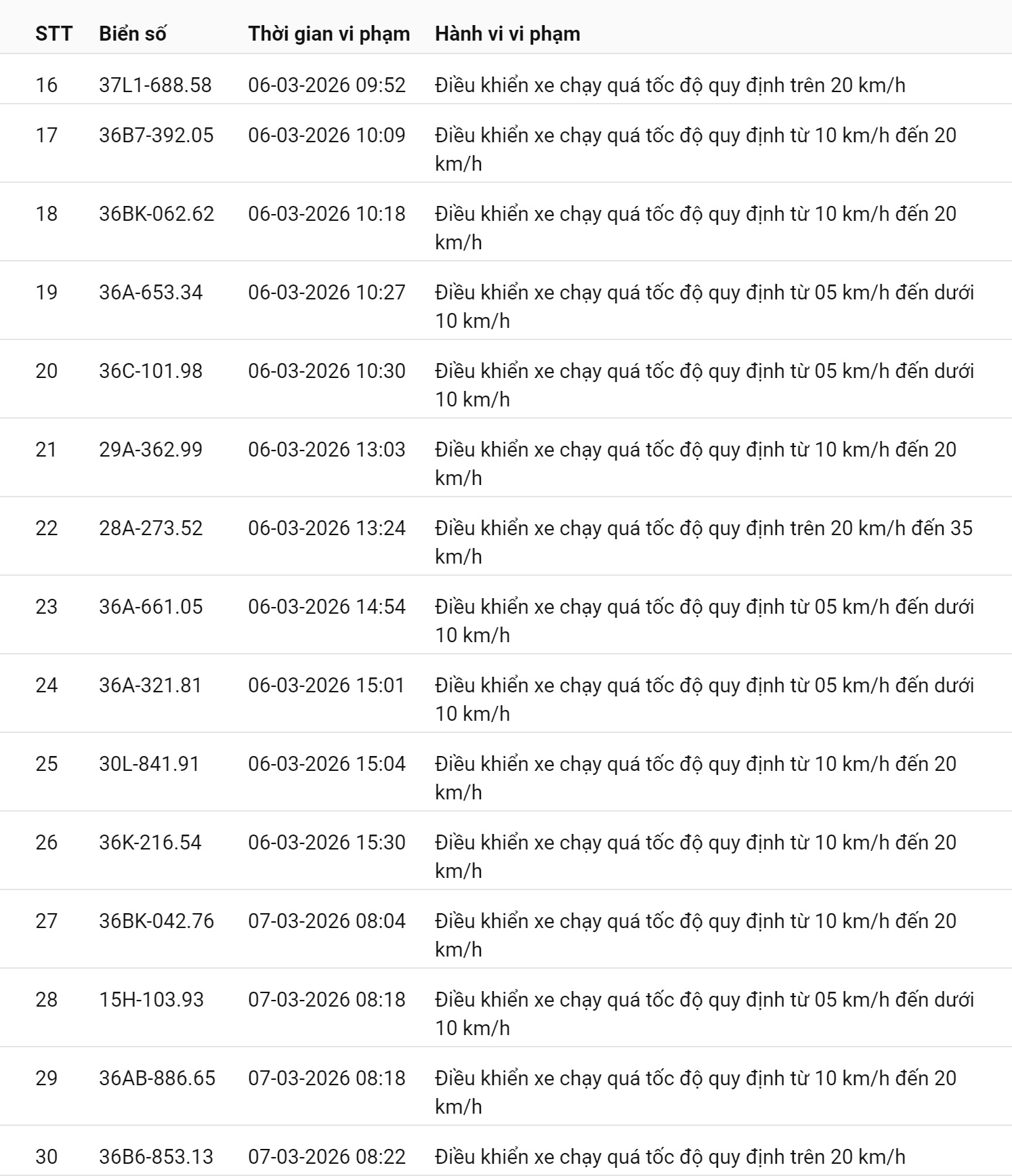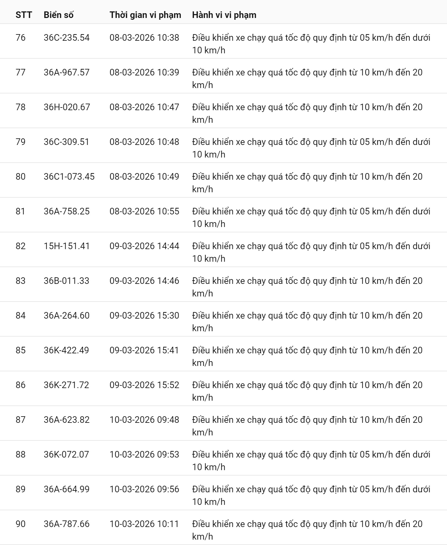 thông báo từ Công an tỉnh Thanh Hóa đăng tải ngày 6/4, thông qua thiết bị kỹ thuật nghiệp vụ, các tổ công tác của phòng CSGT đã phát hiện, ghi nhận bằng hình ảnh đối với tổng số 745 trường hợp phương tiện vi phạm quy định về tốc độ trên các tuyến Quốc lộ trong thời gian từ ngày 01/03/2026 đến ngày 15/03/2026. Danh sách biển số vi phạm cụ thể như sau: