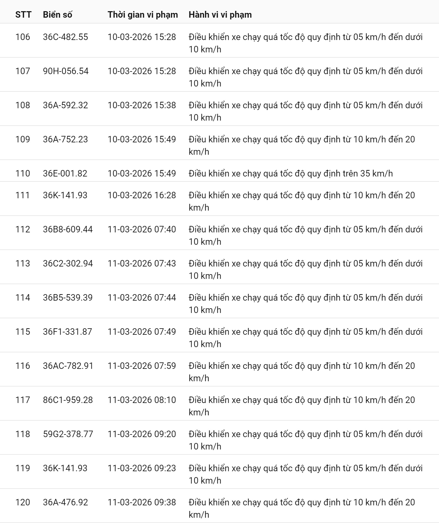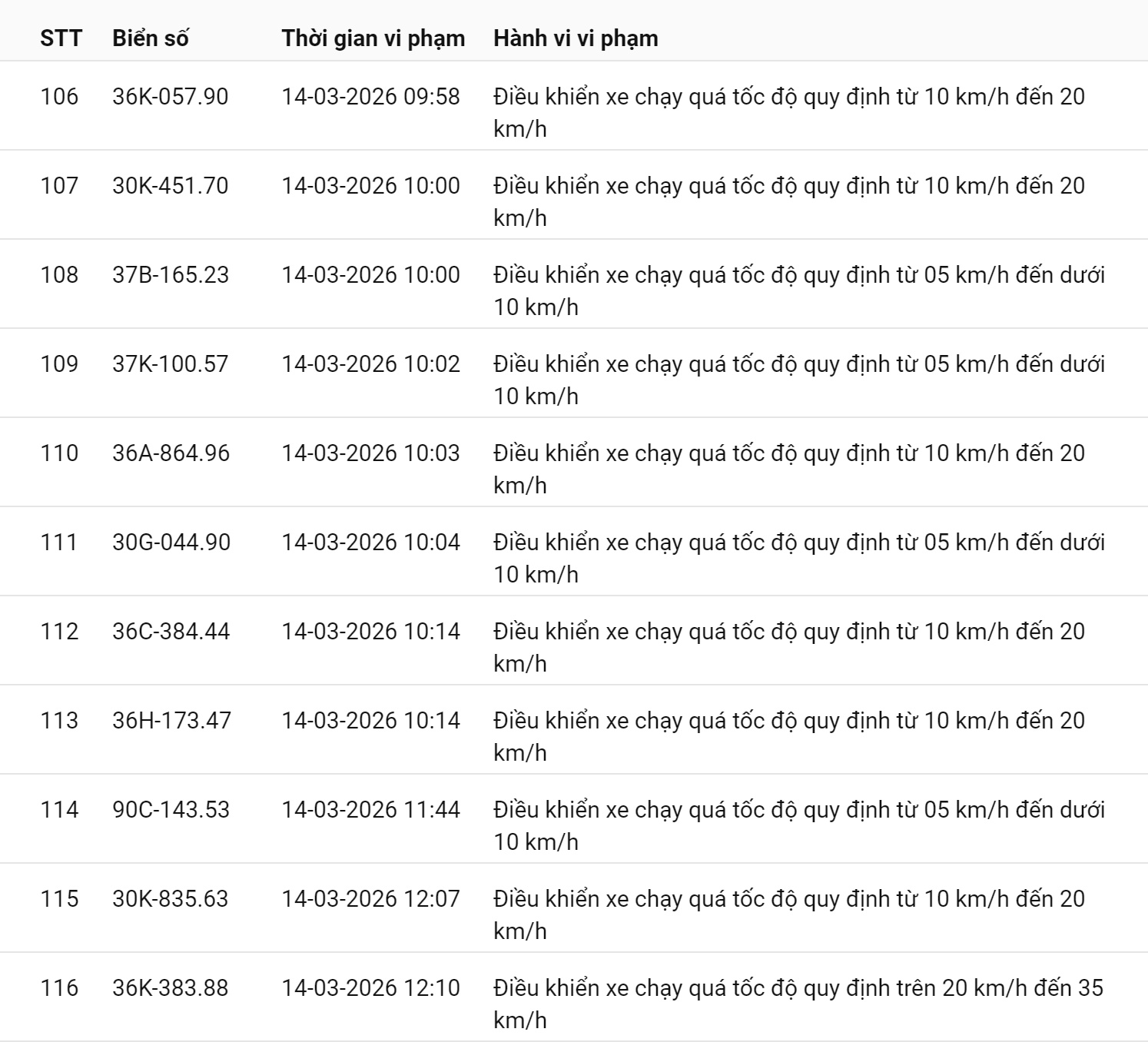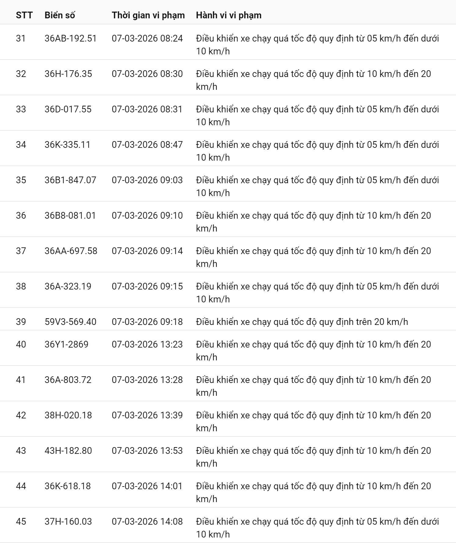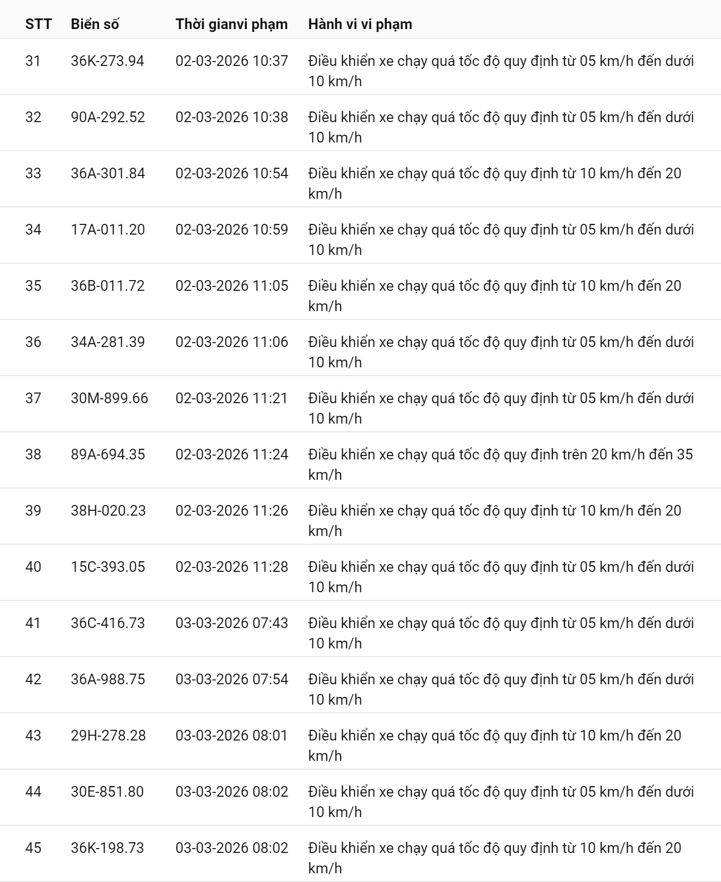 thông báo từ Công an tỉnh Thanh Hóa đăng tải ngày 6/4, thông qua thiết bị kỹ thuật nghiệp vụ, các tổ công tác của phòng CSGT đã phát hiện, ghi nhận bằng hình ảnh đối với tổng số 745 trường hợp phương tiện vi phạm quy định về tốc độ trên các tuyến Quốc lộ trong thời gian từ ngày 01/03/2026 đến ngày 15/03/2026. Danh sách biển số vi phạm cụ thể như sau: