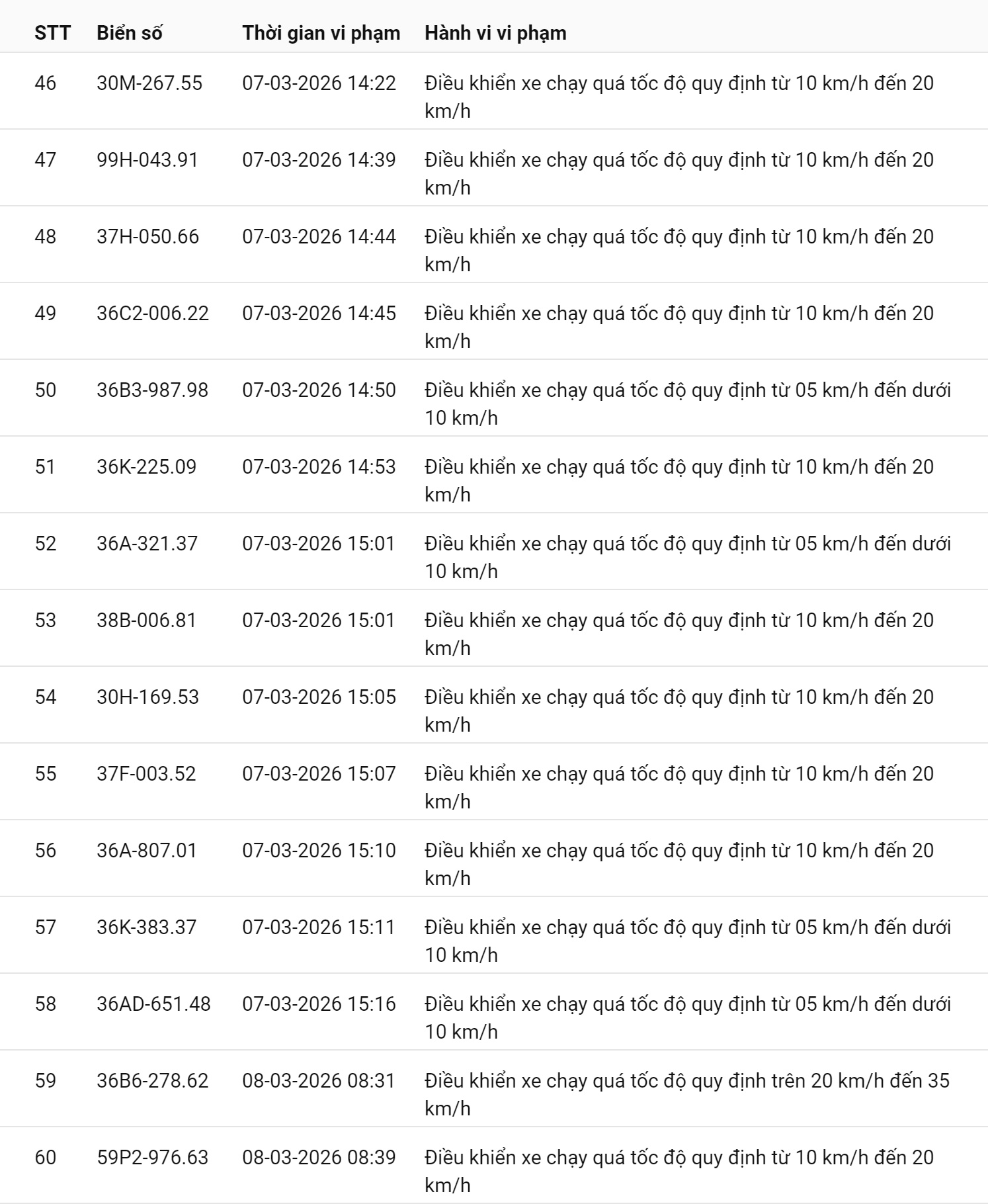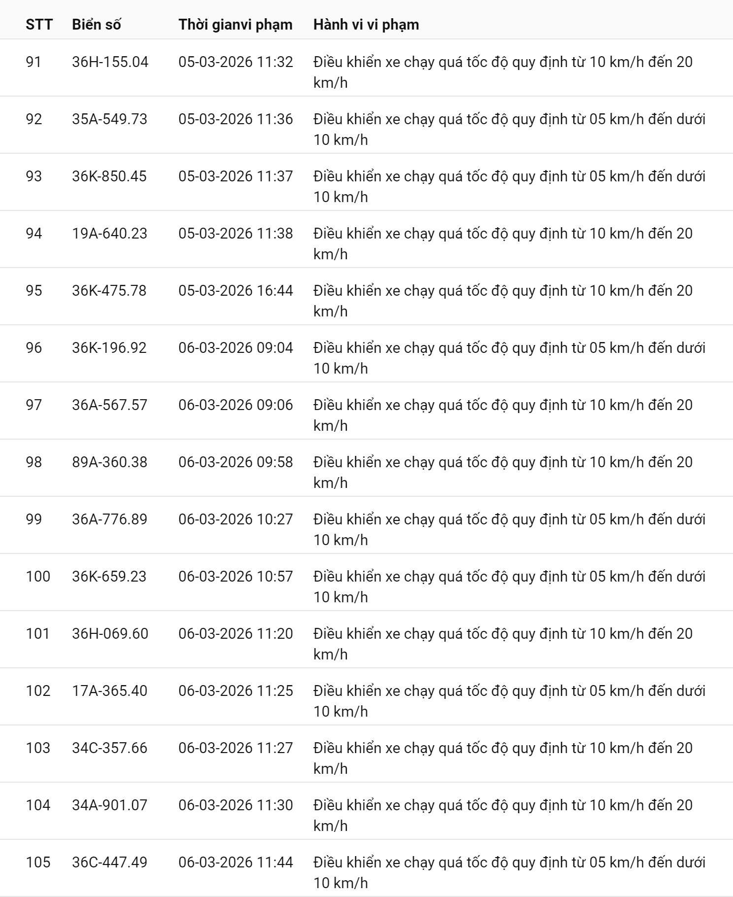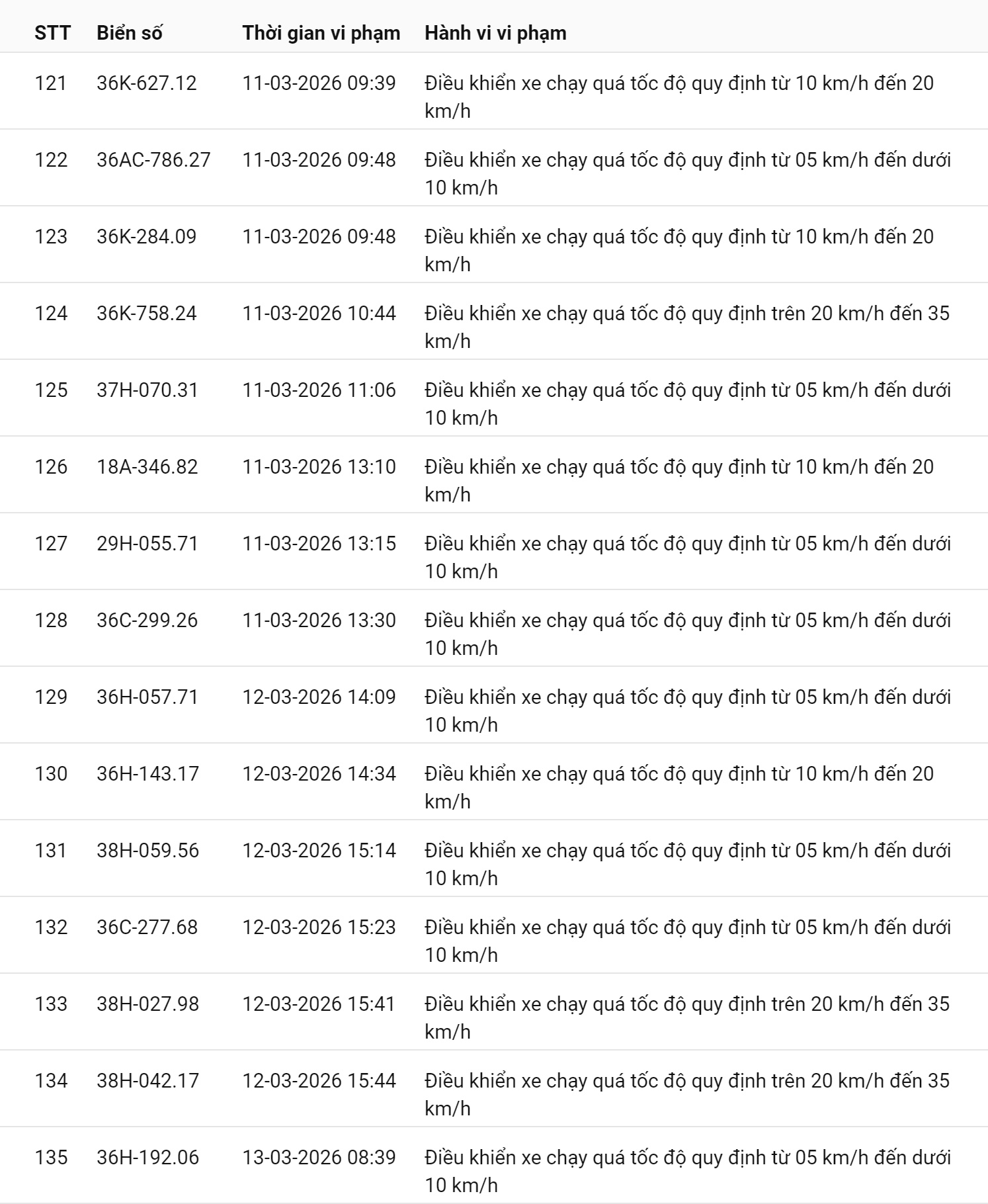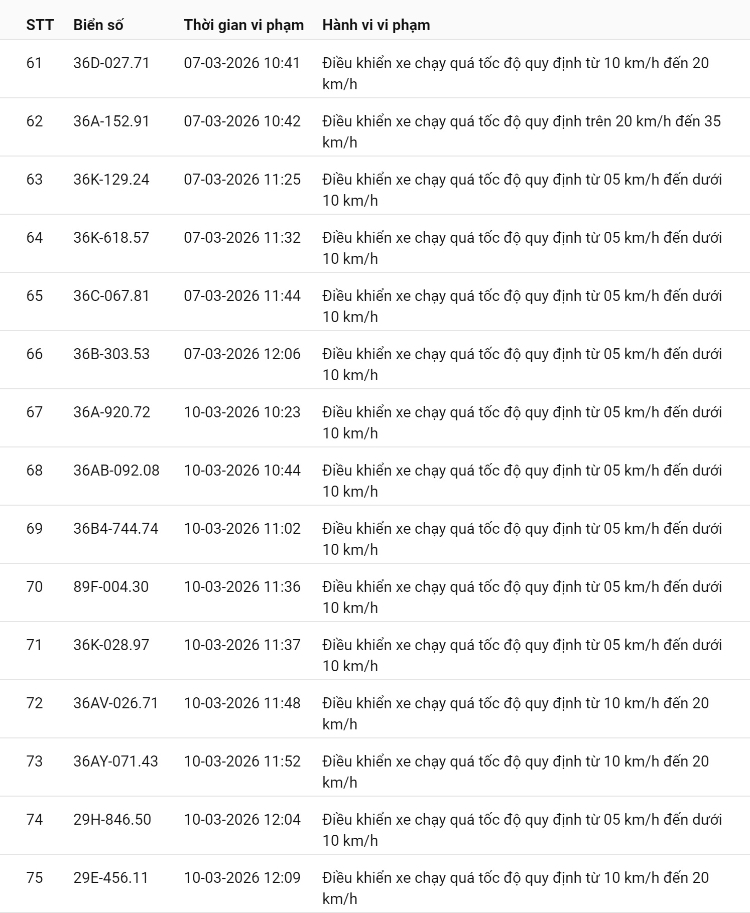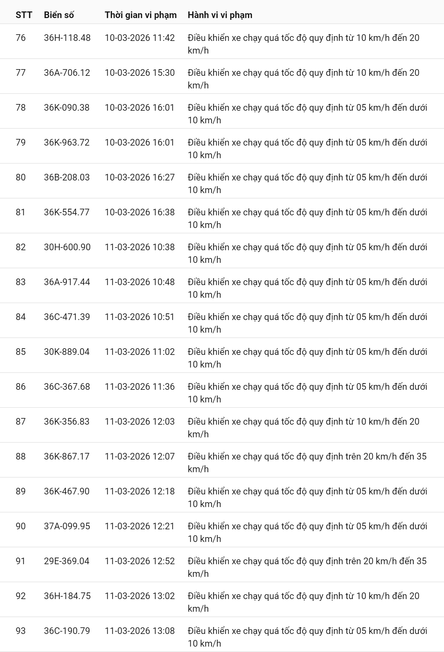 thông báo từ Công an tỉnh Thanh Hóa đăng tải ngày 6/4, thông qua thiết bị kỹ thuật nghiệp vụ, các tổ công tác của phòng CSGT đã phát hiện, ghi nhận bằng hình ảnh đối với tổng số 745 trường hợp phương tiện vi phạm quy định về tốc độ trên các tuyến Quốc lộ trong thời gian từ ngày 01/03/2026 đến ngày 15/03/2026. Danh sách biển số vi phạm cụ thể như sau:
