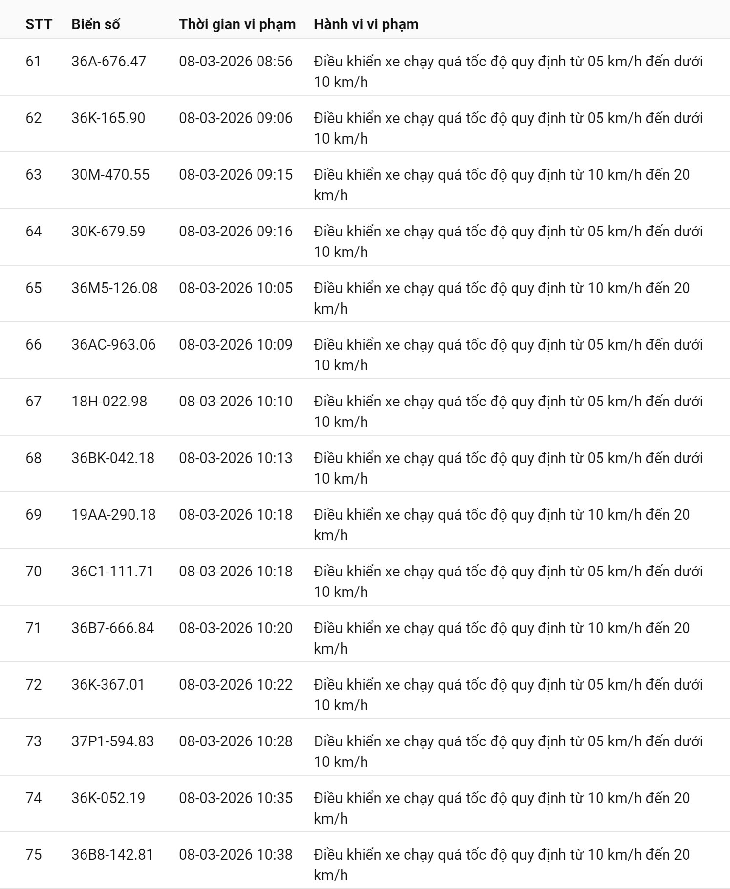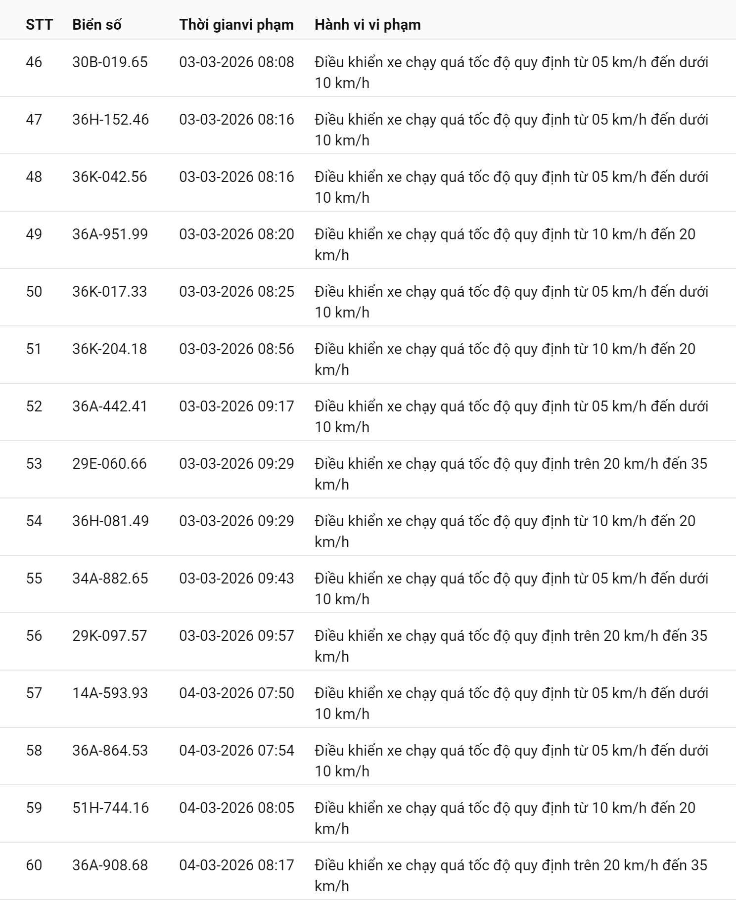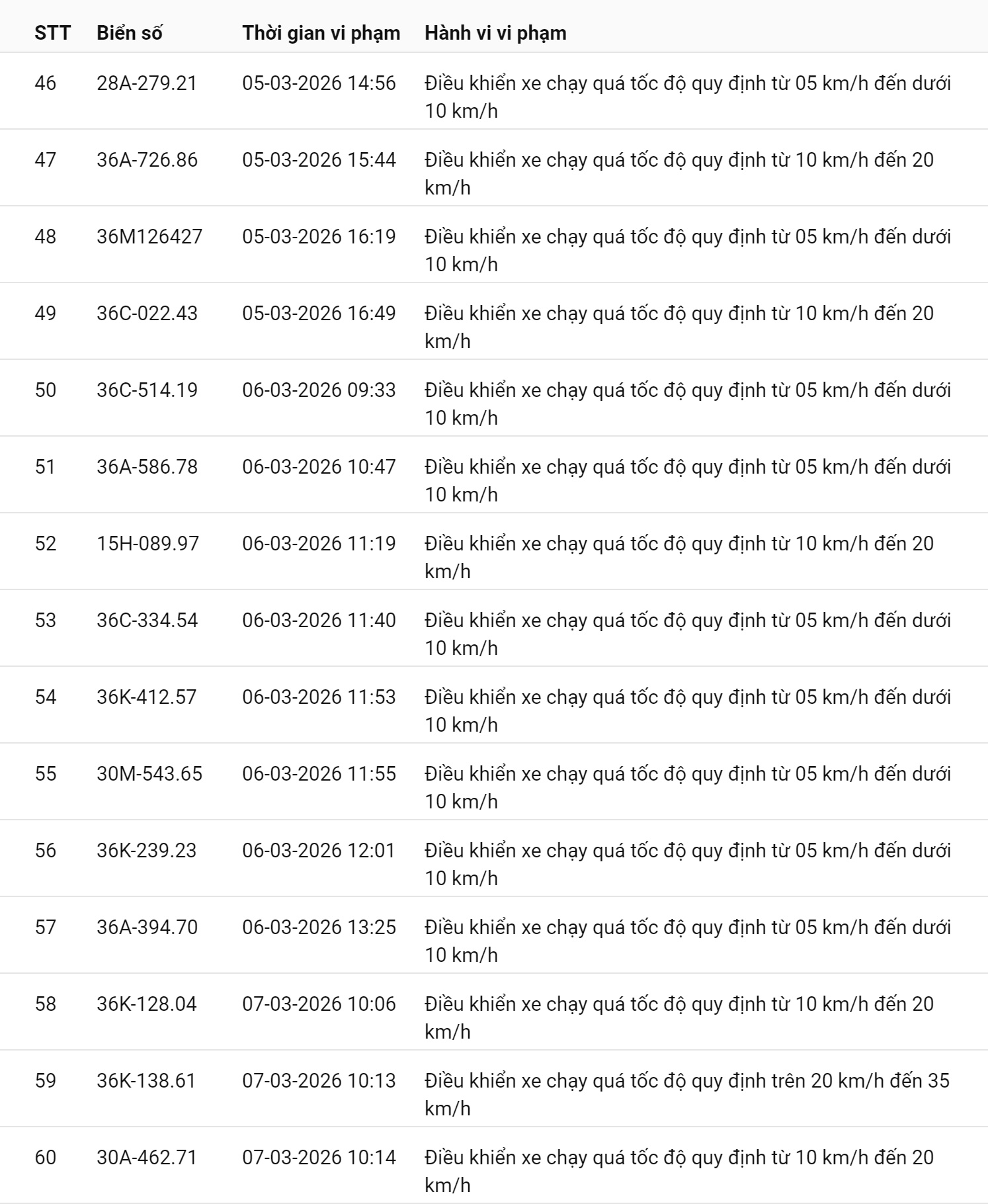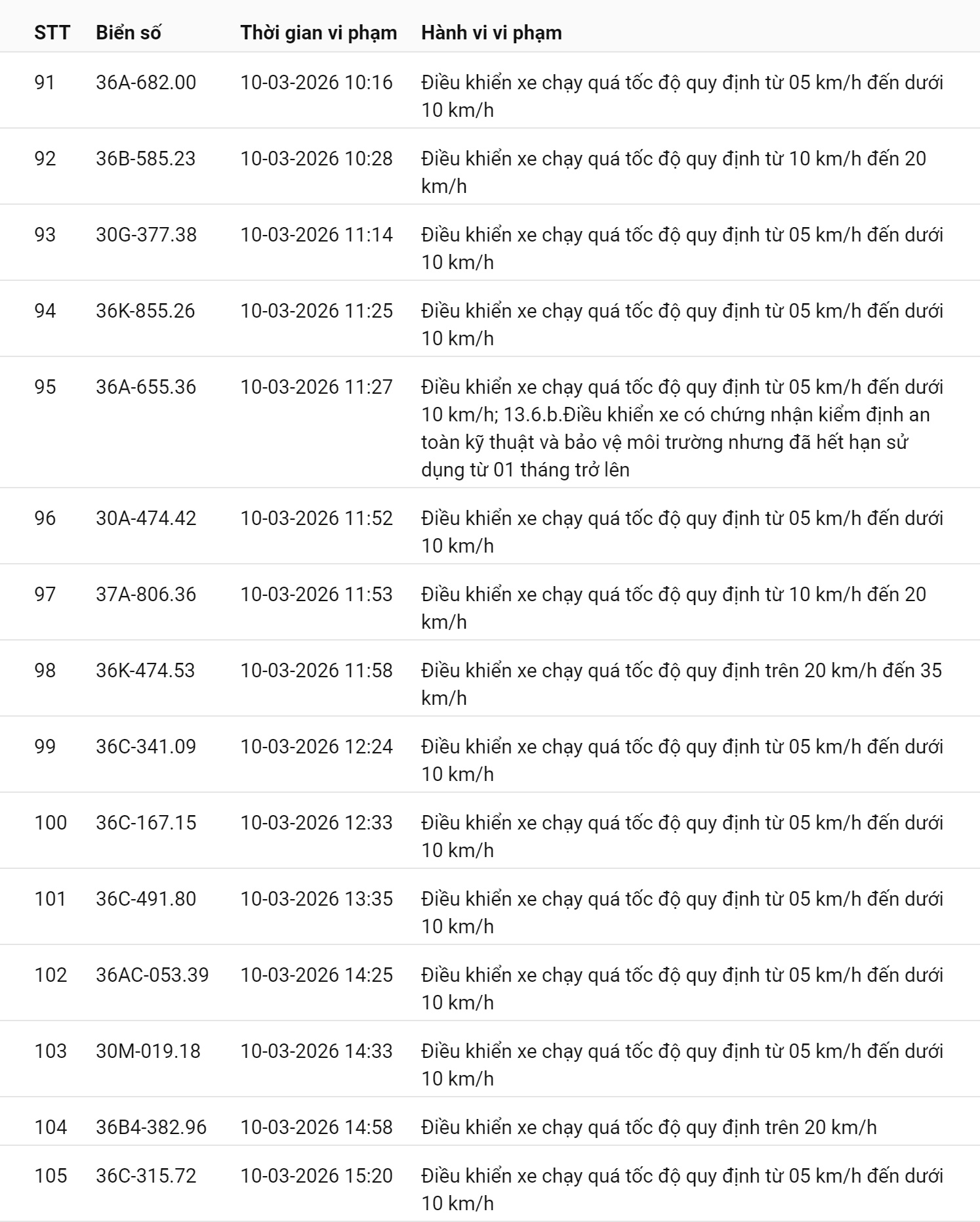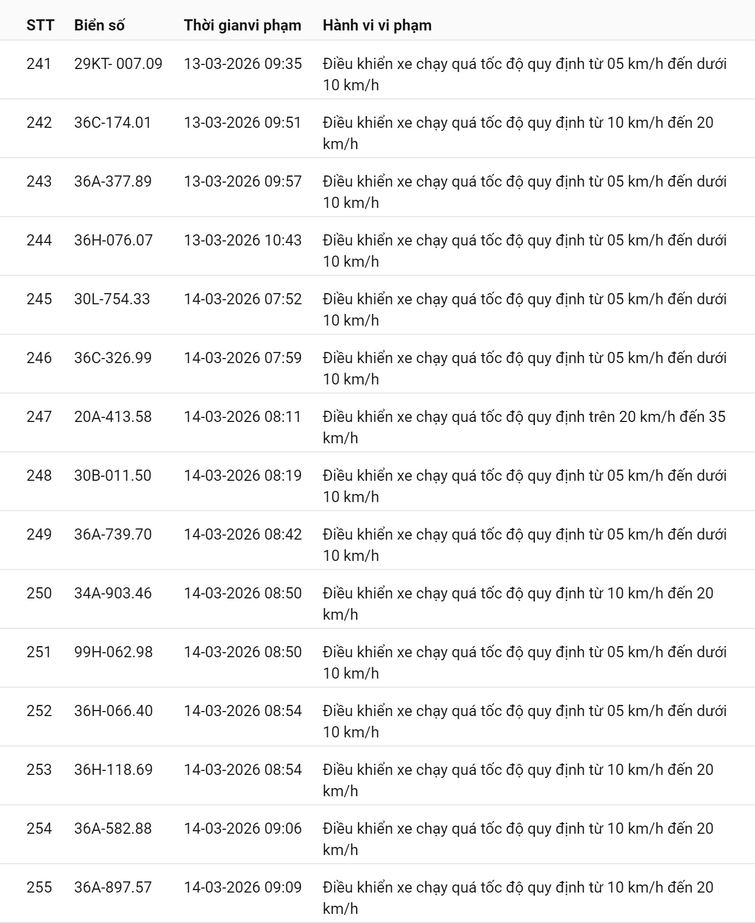 thông báo từ Công an tỉnh Thanh Hóa đăng tải ngày 6/4, thông qua thiết bị kỹ thuật nghiệp vụ, các tổ công tác của phòng CSGT đã phát hiện, ghi nhận bằng hình ảnh đối với tổng số 745 trường hợp phương tiện vi phạm quy định về tốc độ trên các tuyến Quốc lộ trong thời gian từ ngày 01/03/2026 đến ngày 15/03/2026. Danh sách biển số vi phạm cụ thể như sau: