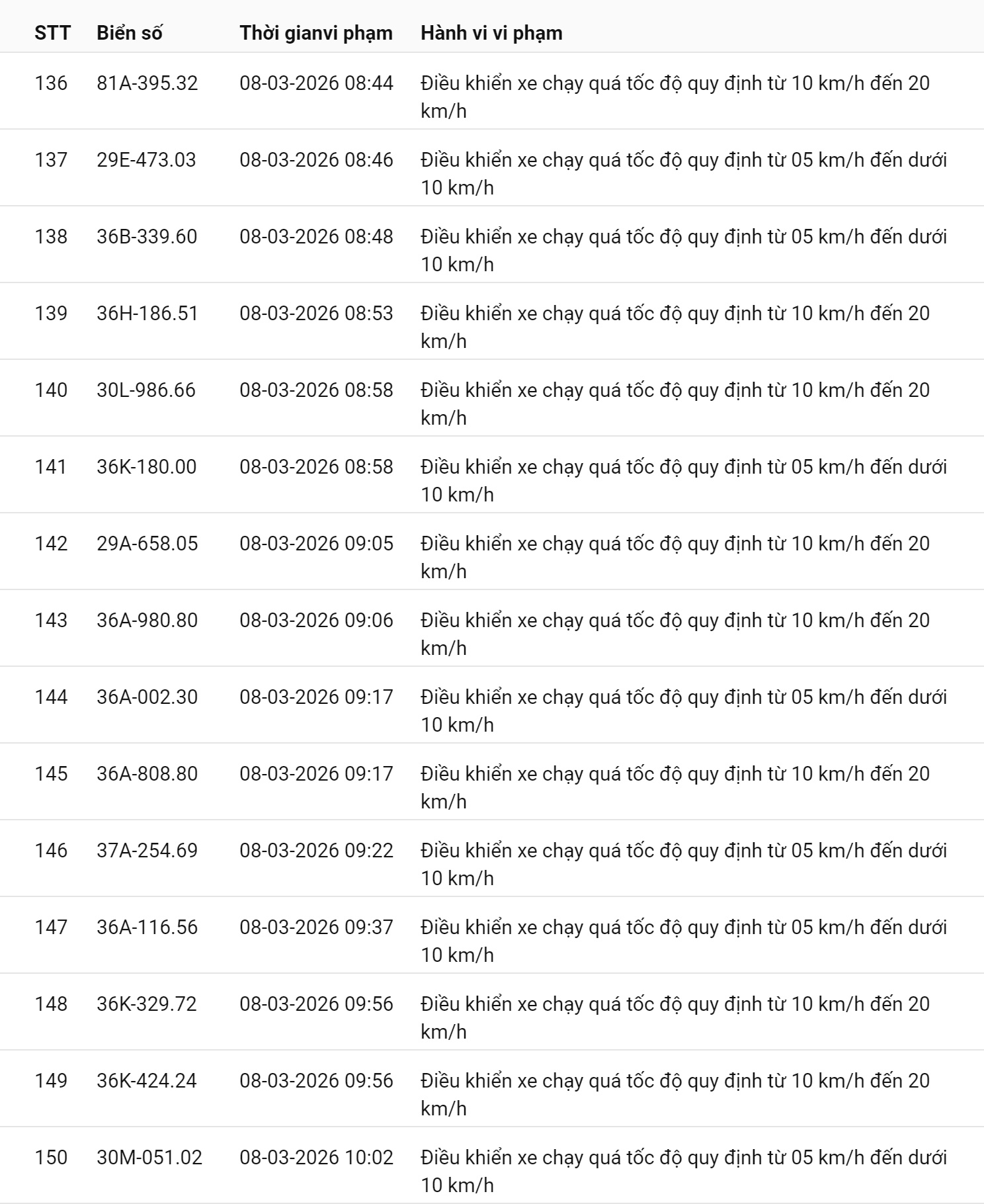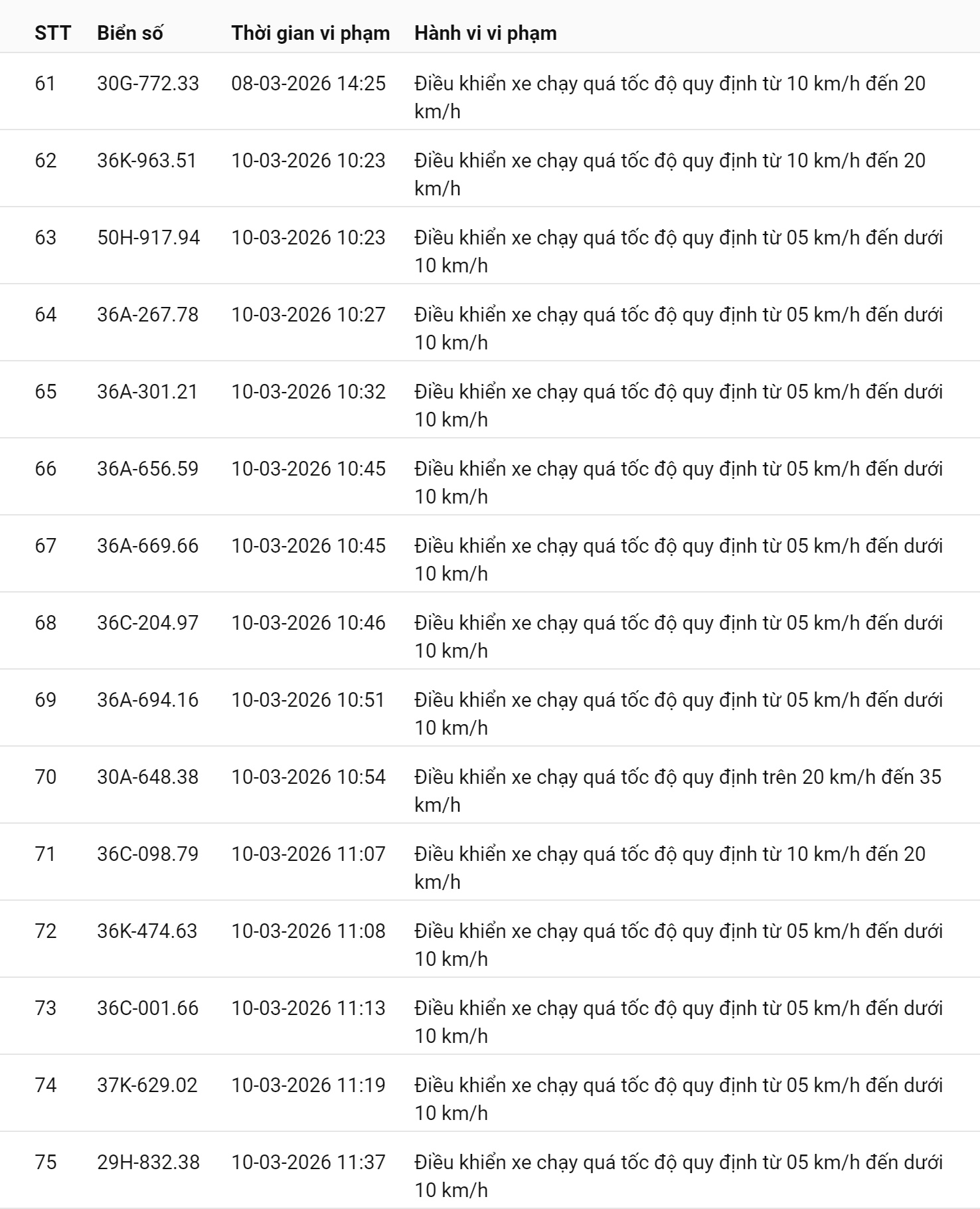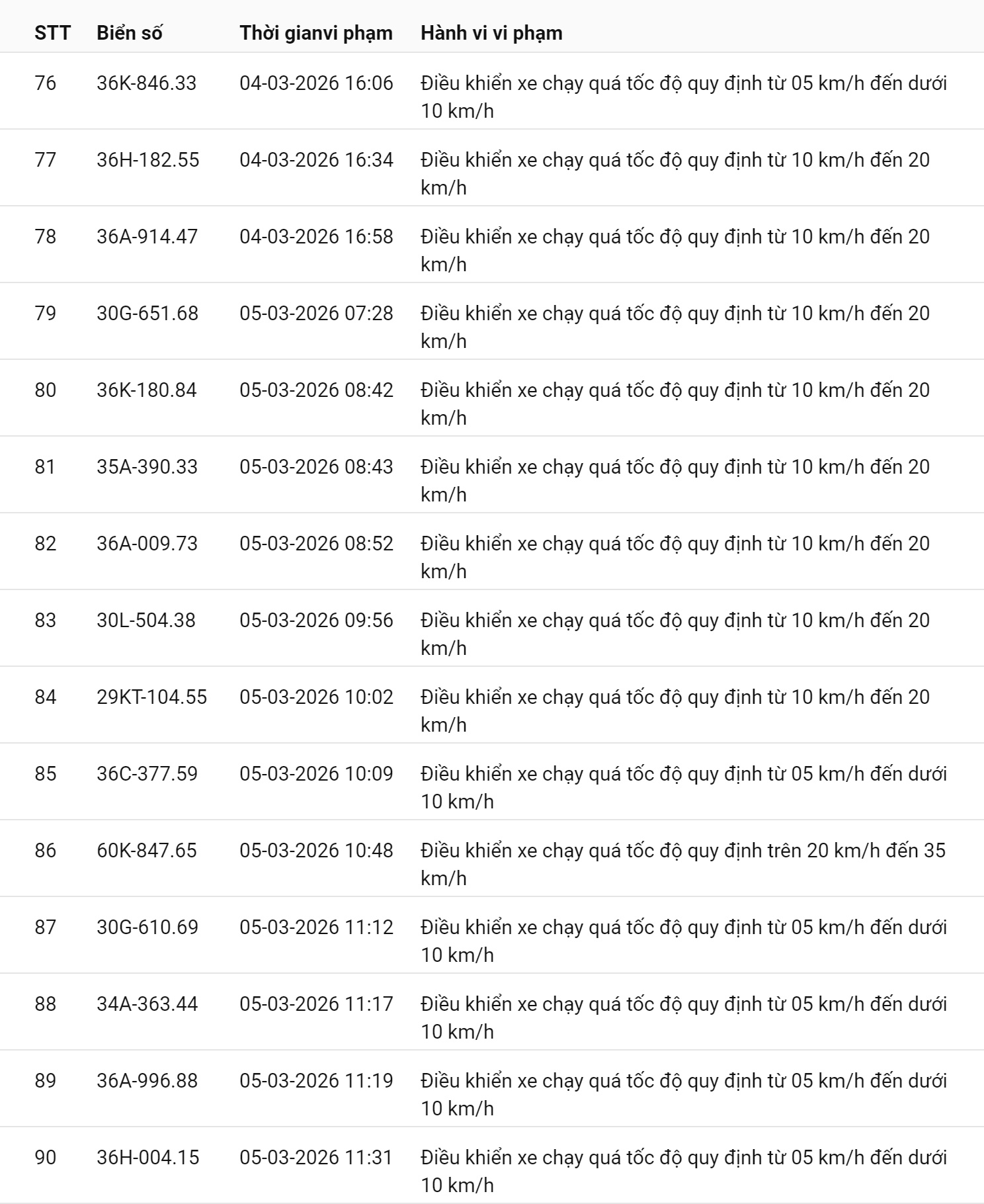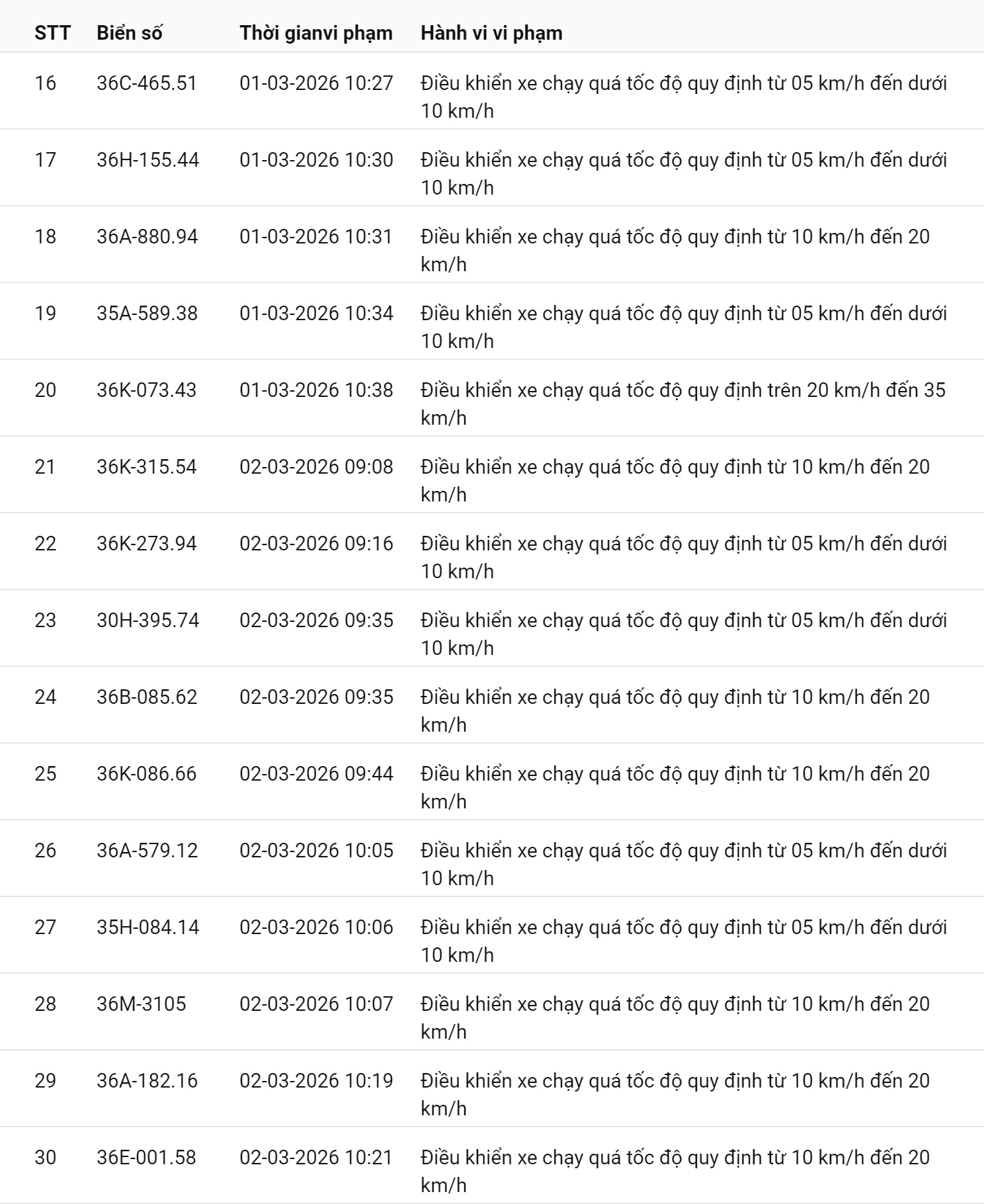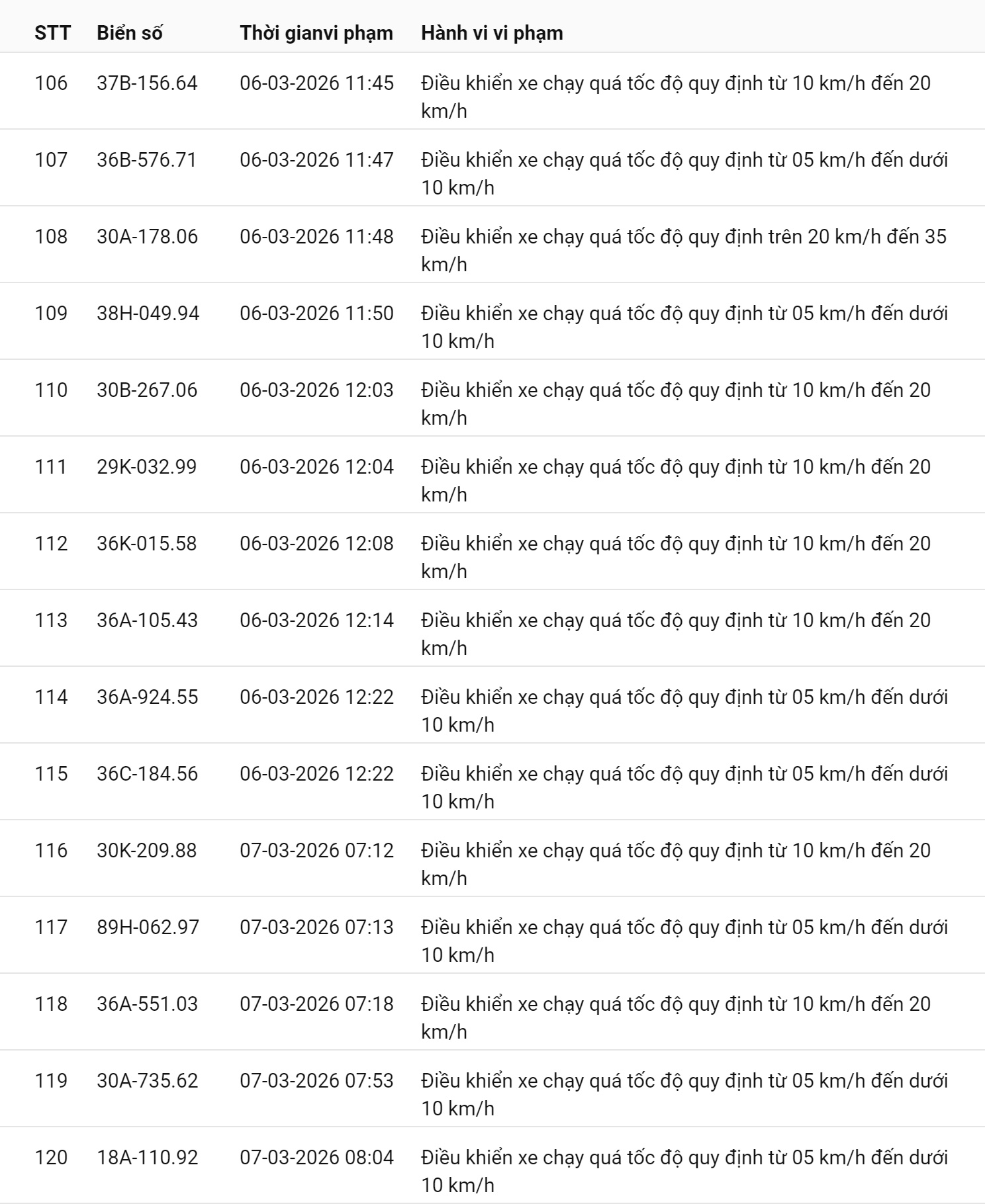 thông báo từ Công an tỉnh Thanh Hóa đăng tải ngày 6/4, thông qua thiết bị kỹ thuật nghiệp vụ, các tổ công tác của phòng CSGT đã phát hiện, ghi nhận bằng hình ảnh đối với tổng số 745 trường hợp phương tiện vi phạm quy định về tốc độ trên các tuyến Quốc lộ trong thời gian từ ngày 01/03/2026 đến ngày 15/03/2026. Danh sách biển số vi phạm cụ thể như sau: