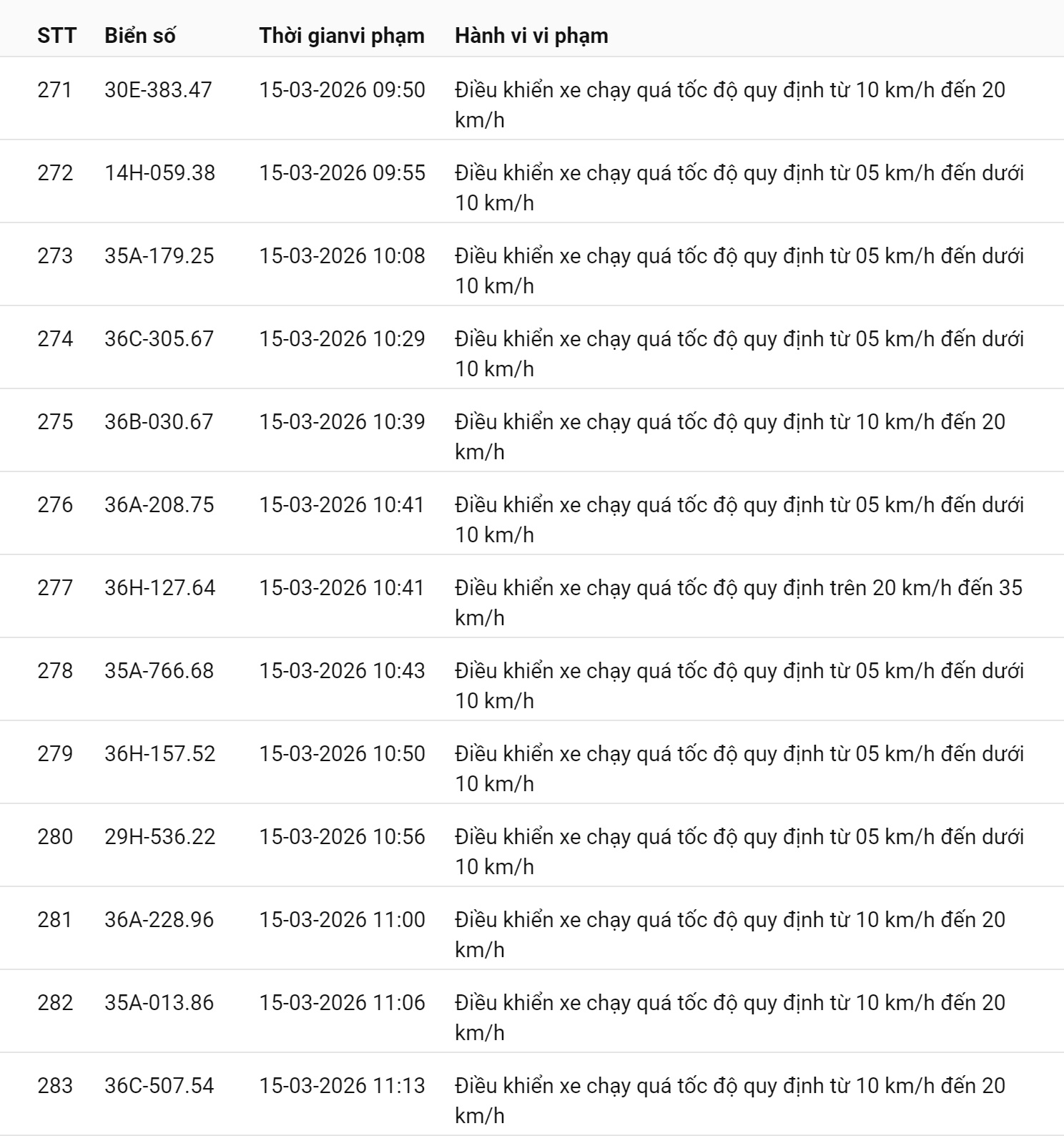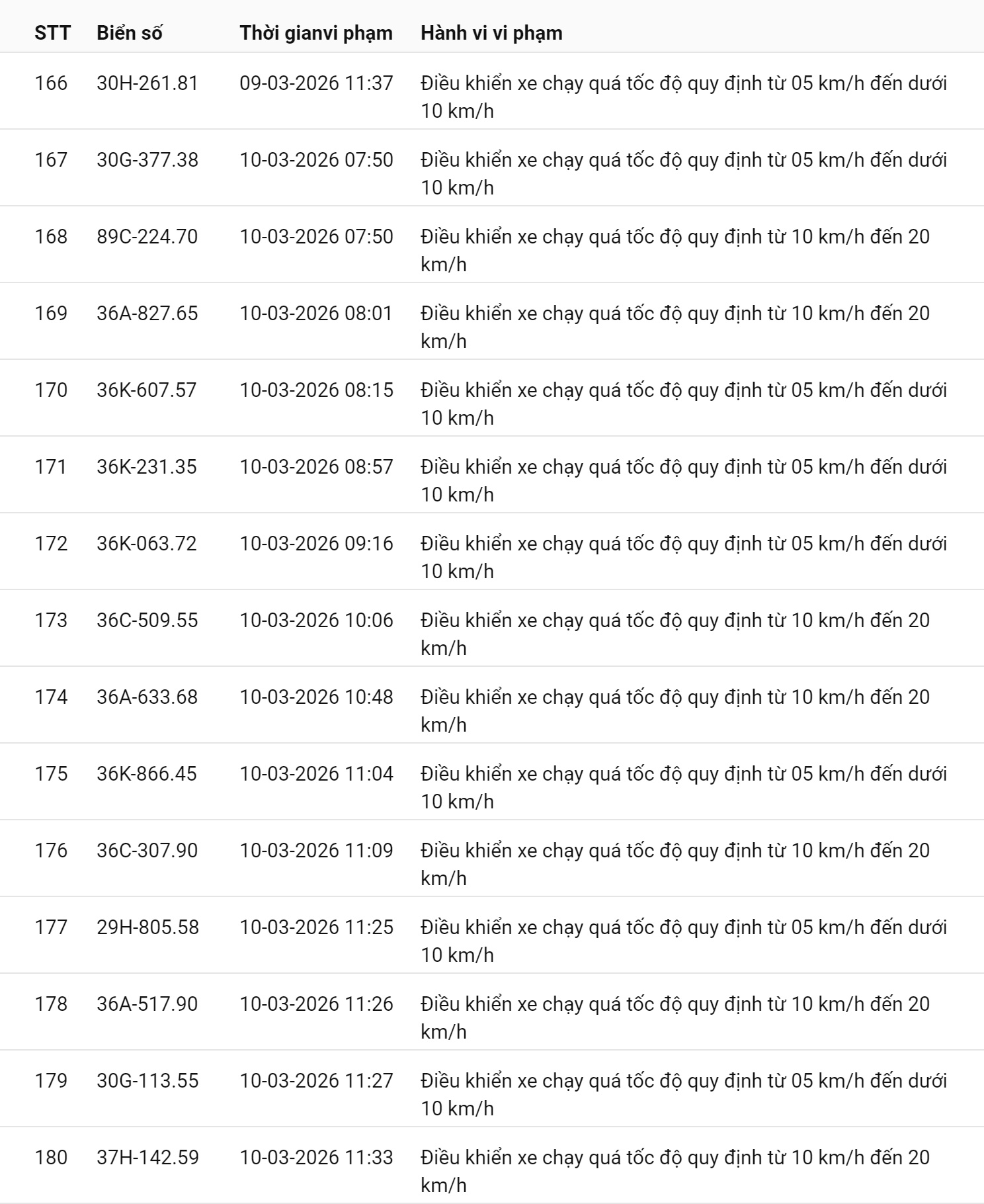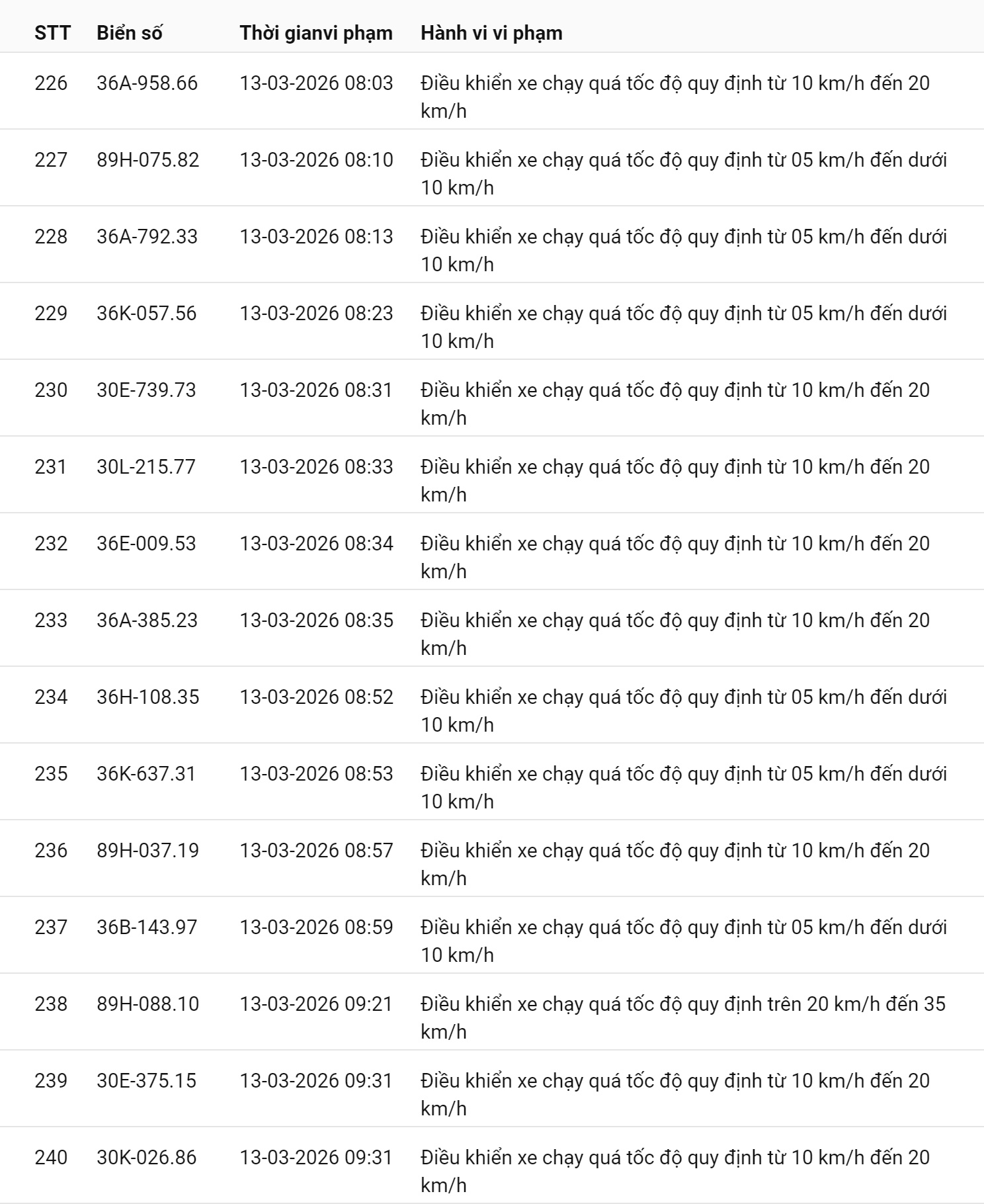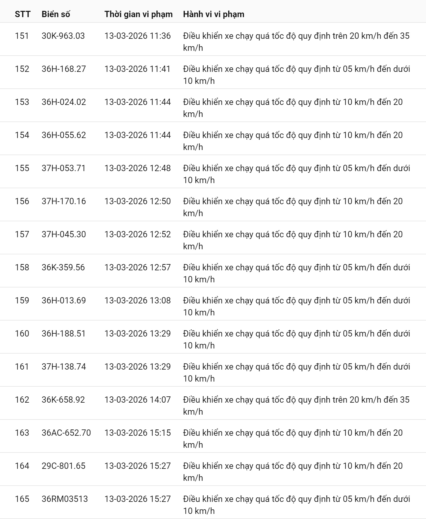 thông báo từ Công an tỉnh Thanh Hóa đăng tải ngày 6/4, thông qua thiết bị kỹ thuật nghiệp vụ, các tổ công tác của phòng CSGT đã phát hiện, ghi nhận bằng hình ảnh đối với tổng số 745 trường hợp phương tiện vi phạm quy định về tốc độ trên các tuyến Quốc lộ trong thời gian từ ngày 01/03/2026 đến ngày 15/03/2026. Danh sách biển số vi phạm cụ thể như sau: