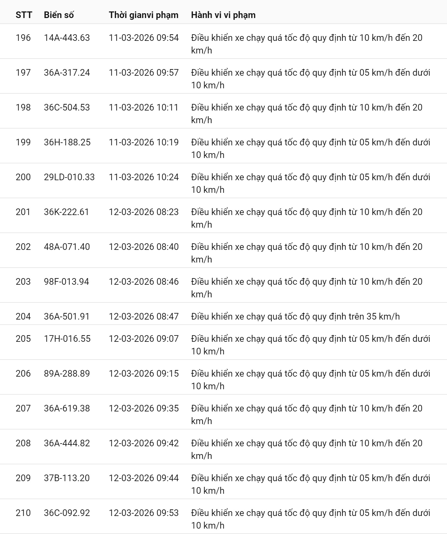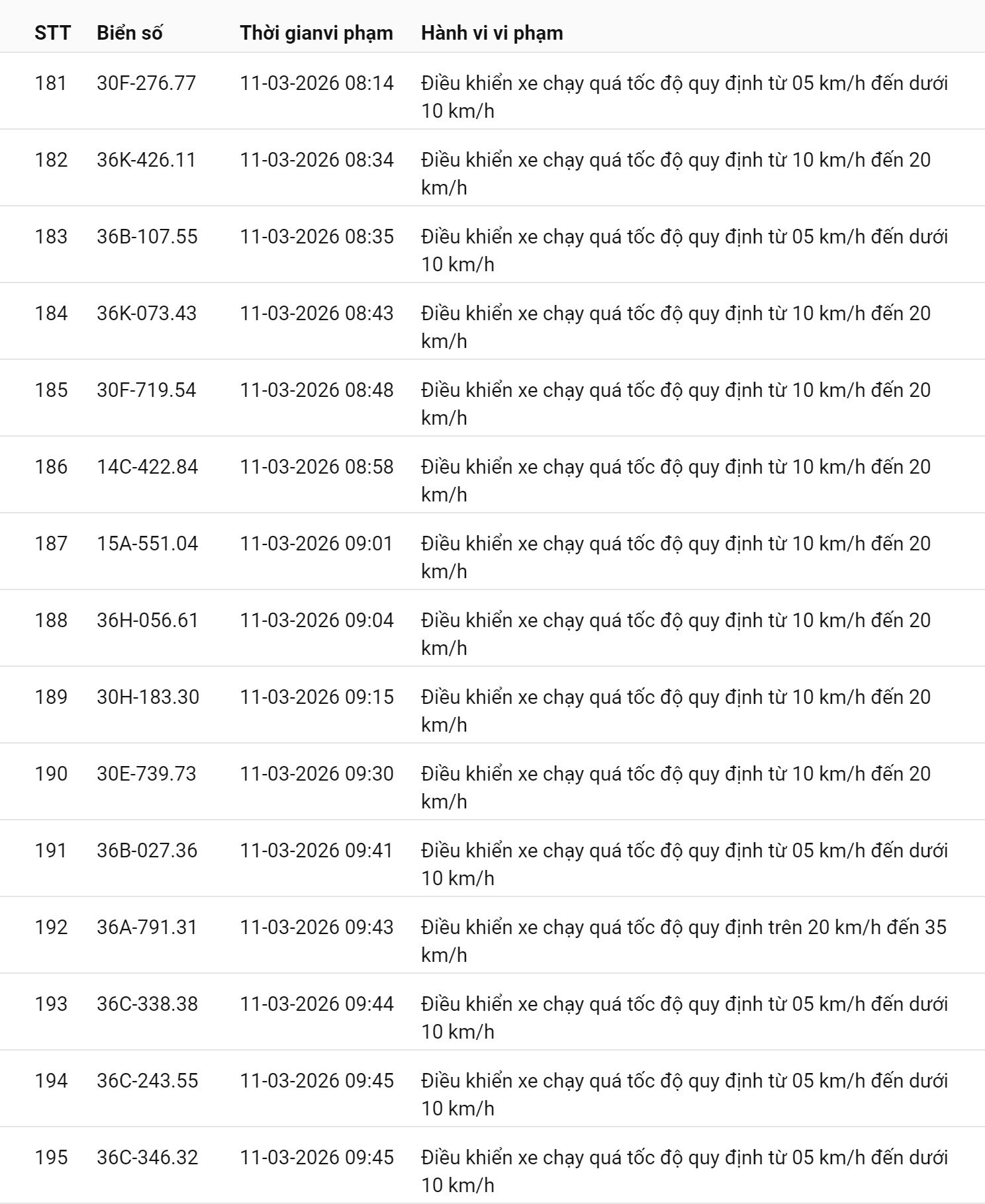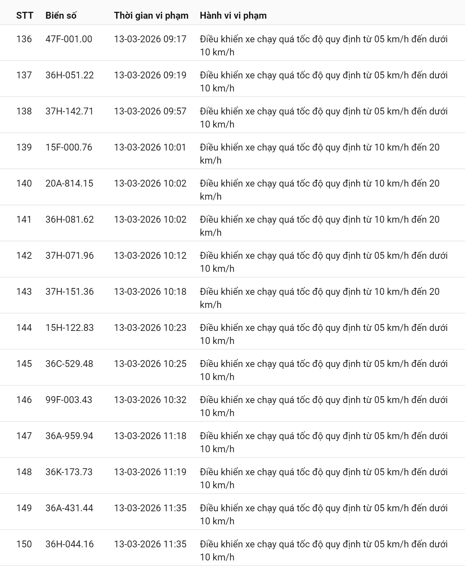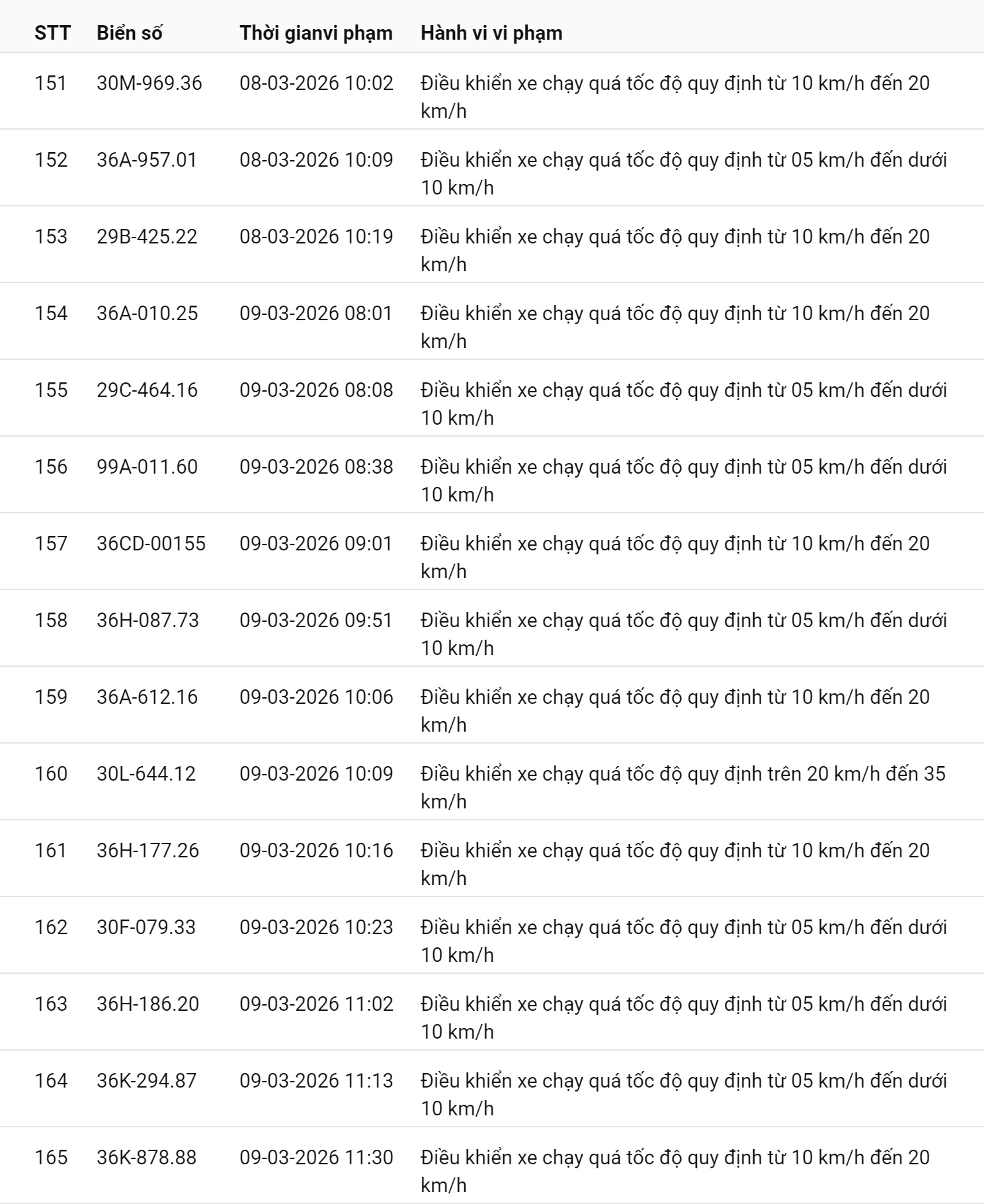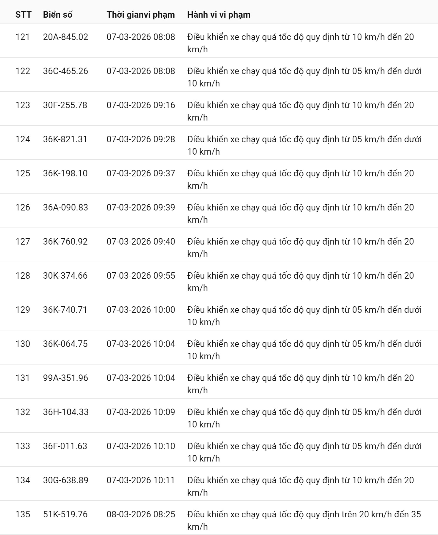 thông báo từ Công an tỉnh Thanh Hóa đăng tải ngày 6/4, thông qua thiết bị kỹ thuật nghiệp vụ, các tổ công tác của phòng CSGT đã phát hiện, ghi nhận bằng hình ảnh đối với tổng số 745 trường hợp phương tiện vi phạm quy định về tốc độ trên các tuyến Quốc lộ trong thời gian từ ngày 01/03/2026 đến ngày 15/03/2026. Danh sách biển số vi phạm cụ thể như sau: