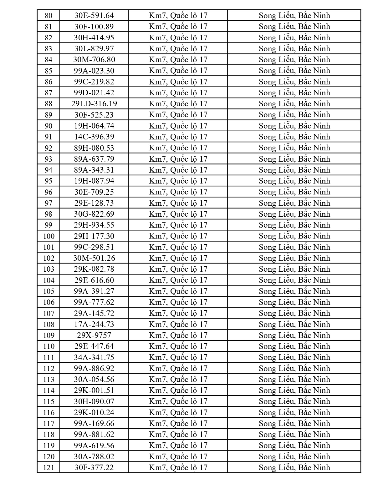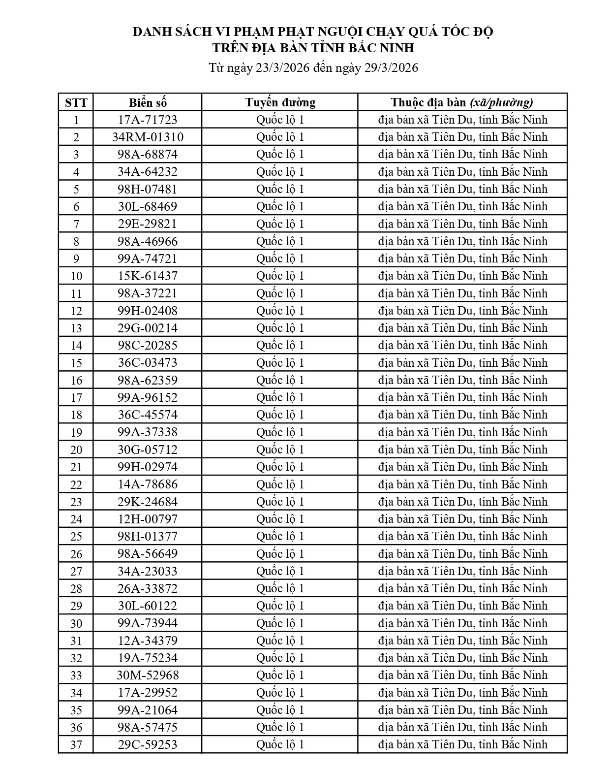 Công an tỉnh Bắc Ninh mới đây đã công bố danh sách các phương tiện vi phạm lỗi chạy quá tốc độ từ ngày 23/3/2026 đến ngày 29/3/2026.