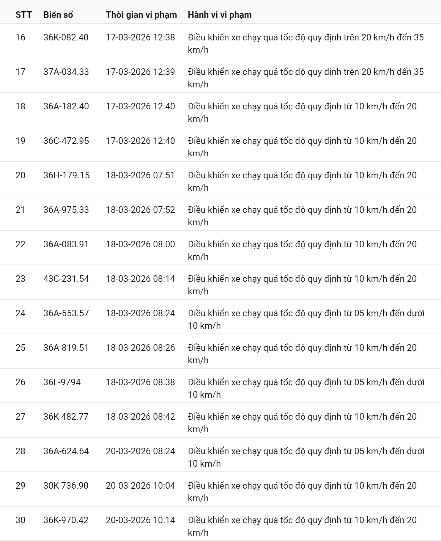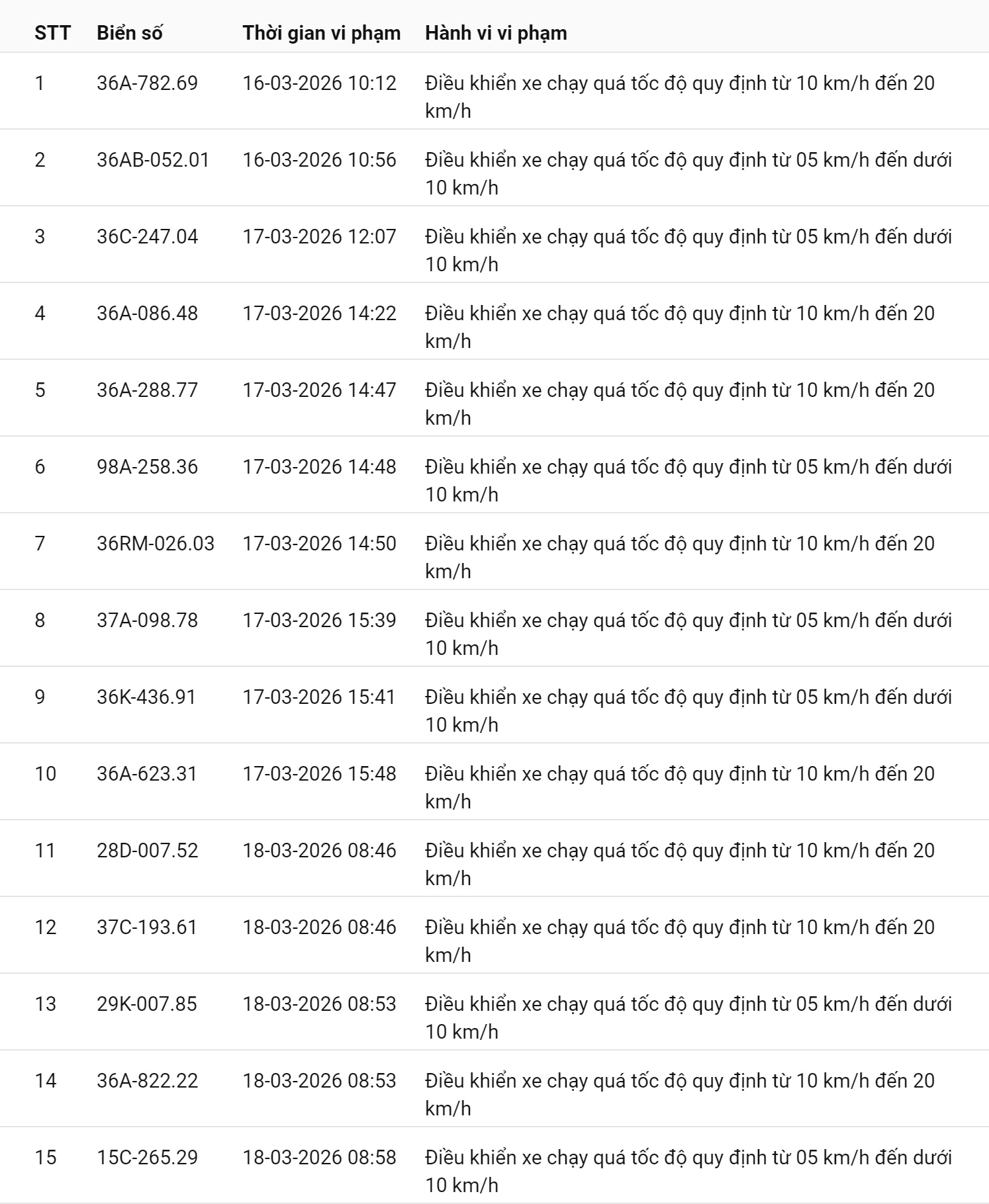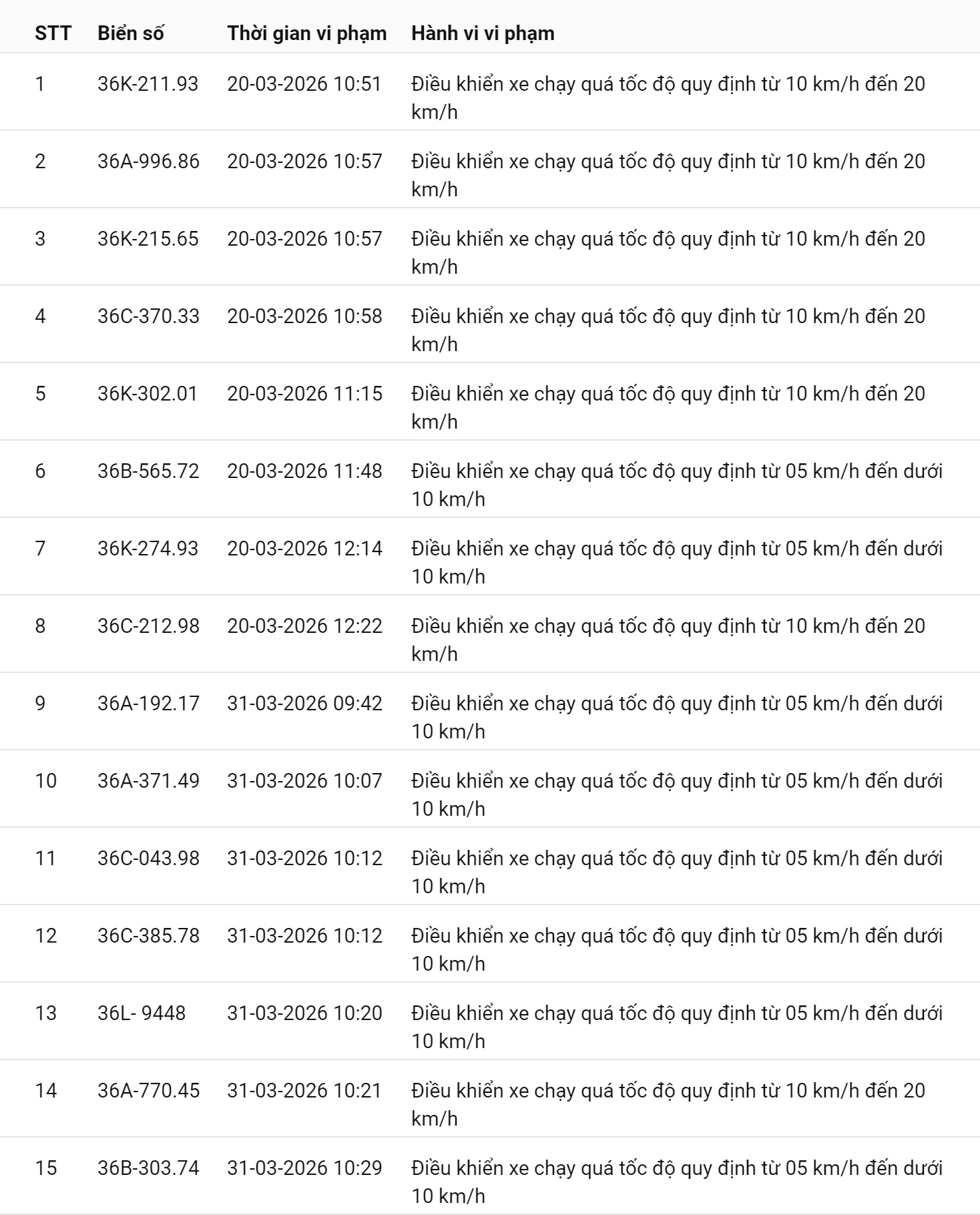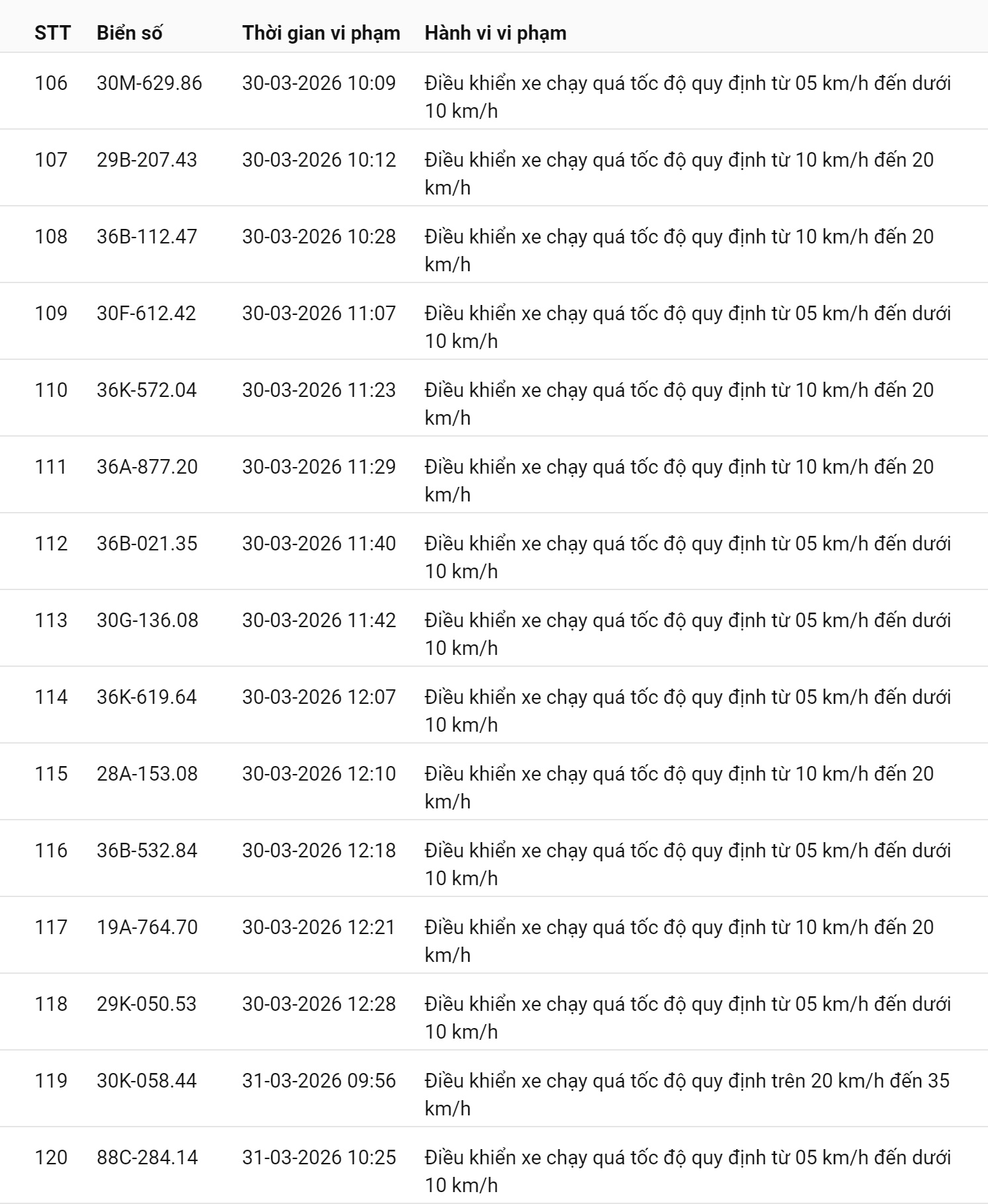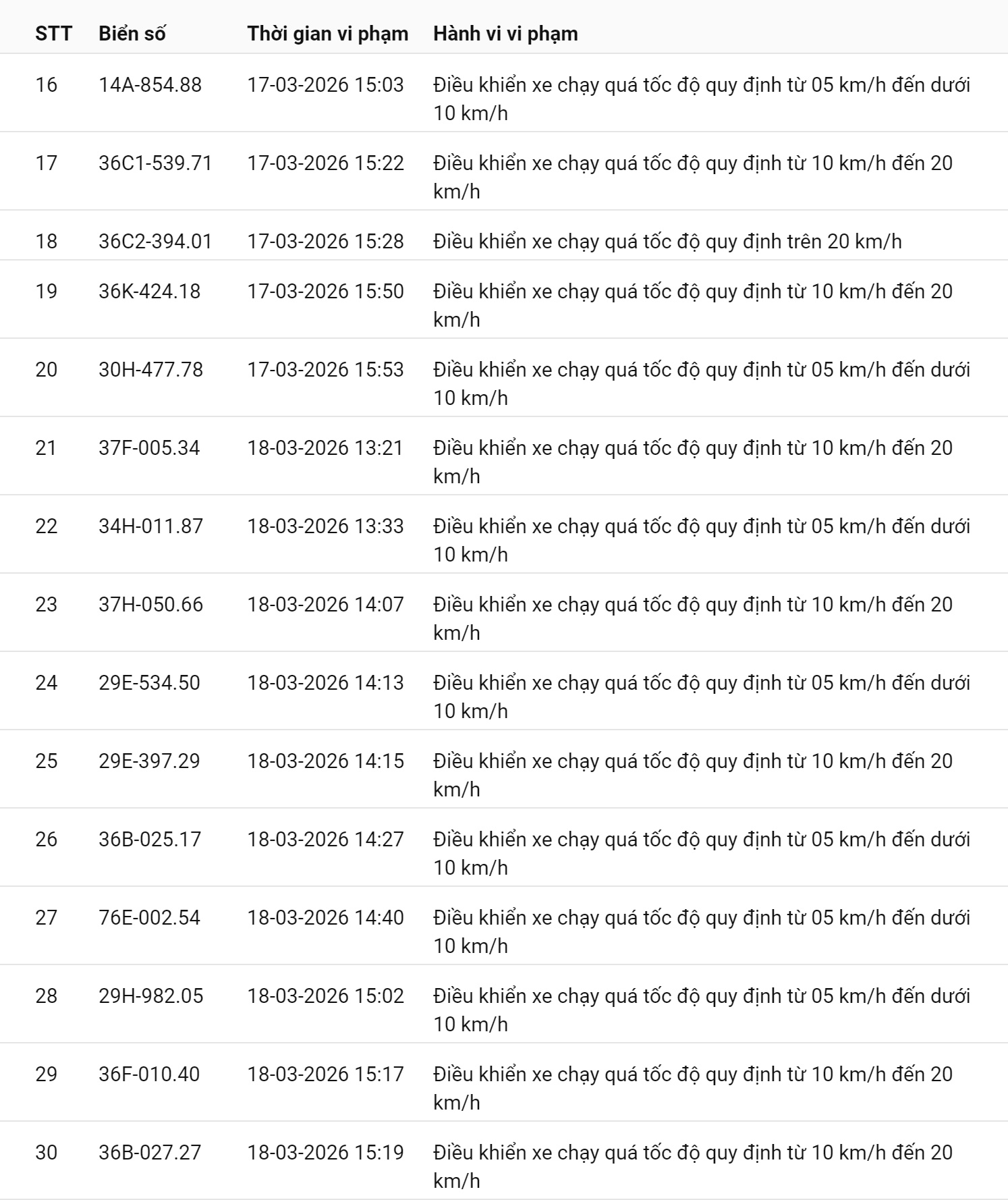 Theo thông báo từ Công an tỉnh Thanh Hóa đăng tải ngày 25/4, thông qua thiết bị kỹ thuật nghiệp vụ, các tổ công tác của phòng CSGT đã phát hiện, ghi nhận bằng hình ảnh đối với tổng số 793 trường hợp phương tiện vi phạm quy định về tốc độ trên các tuyến Quốc lộ trong thời gian từ ngày 16/03/2026 đến ngày 31/03/2026. Danh sách biển số vi phạm cụ thể như sau: