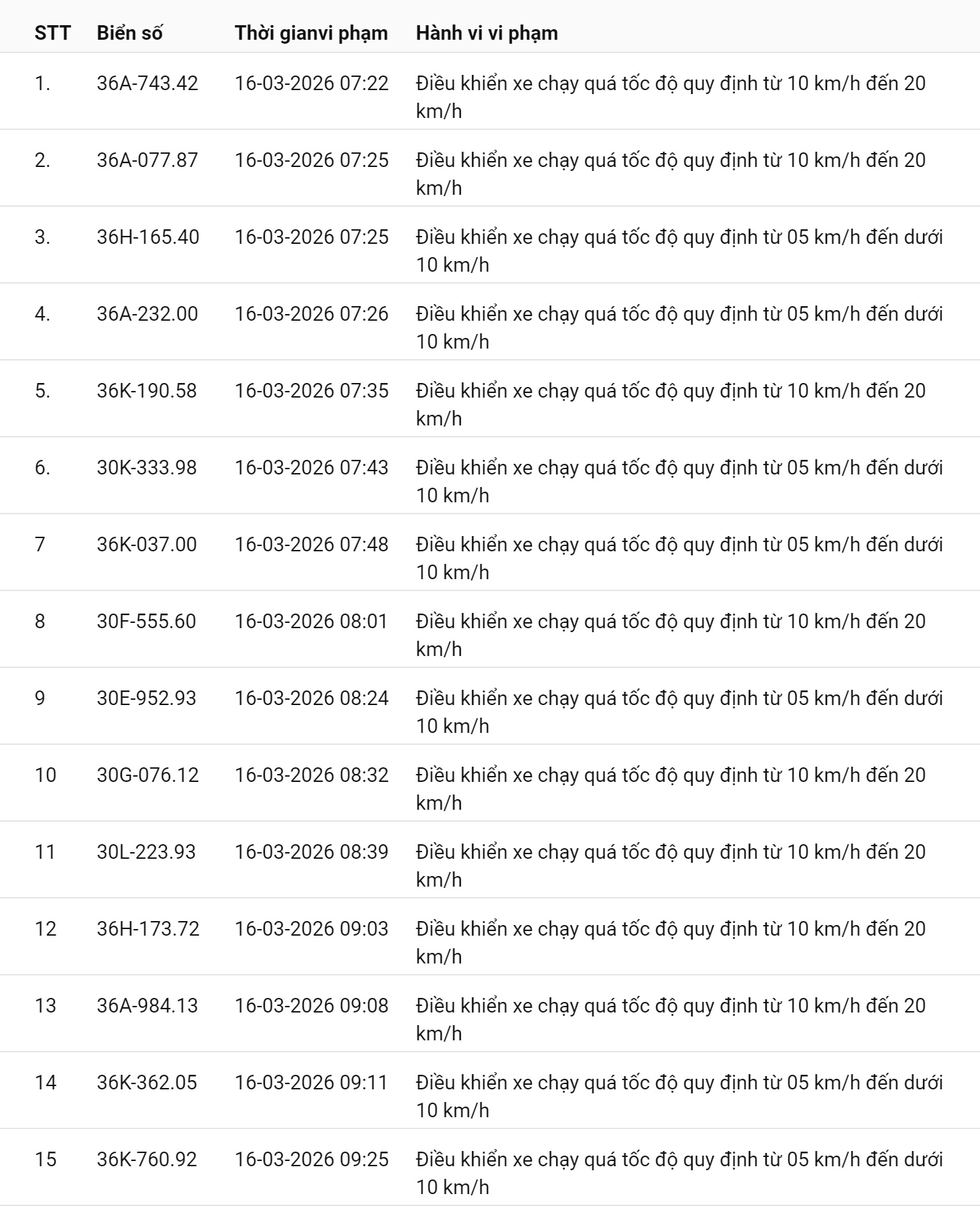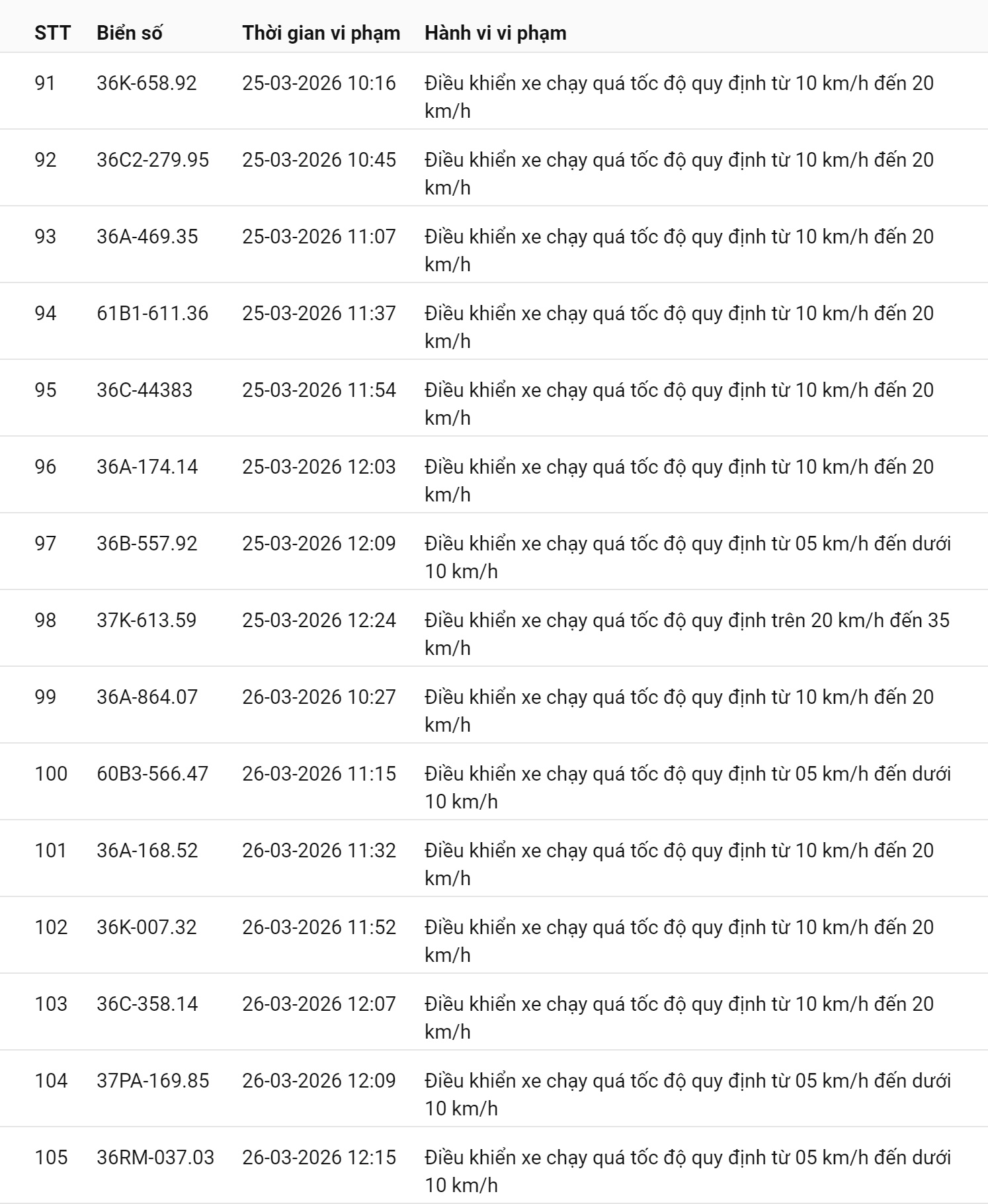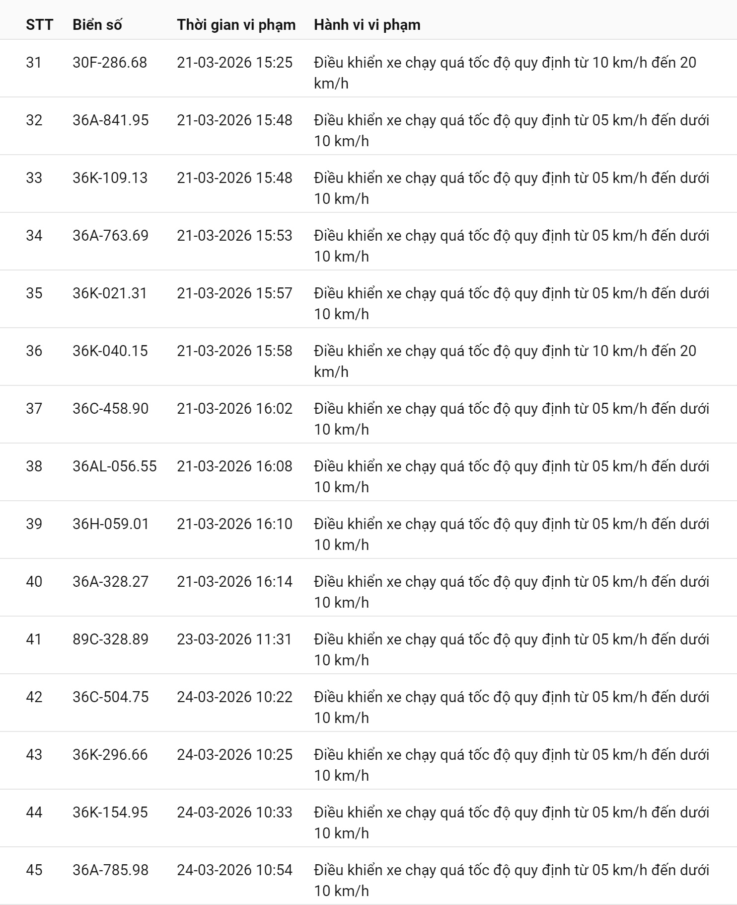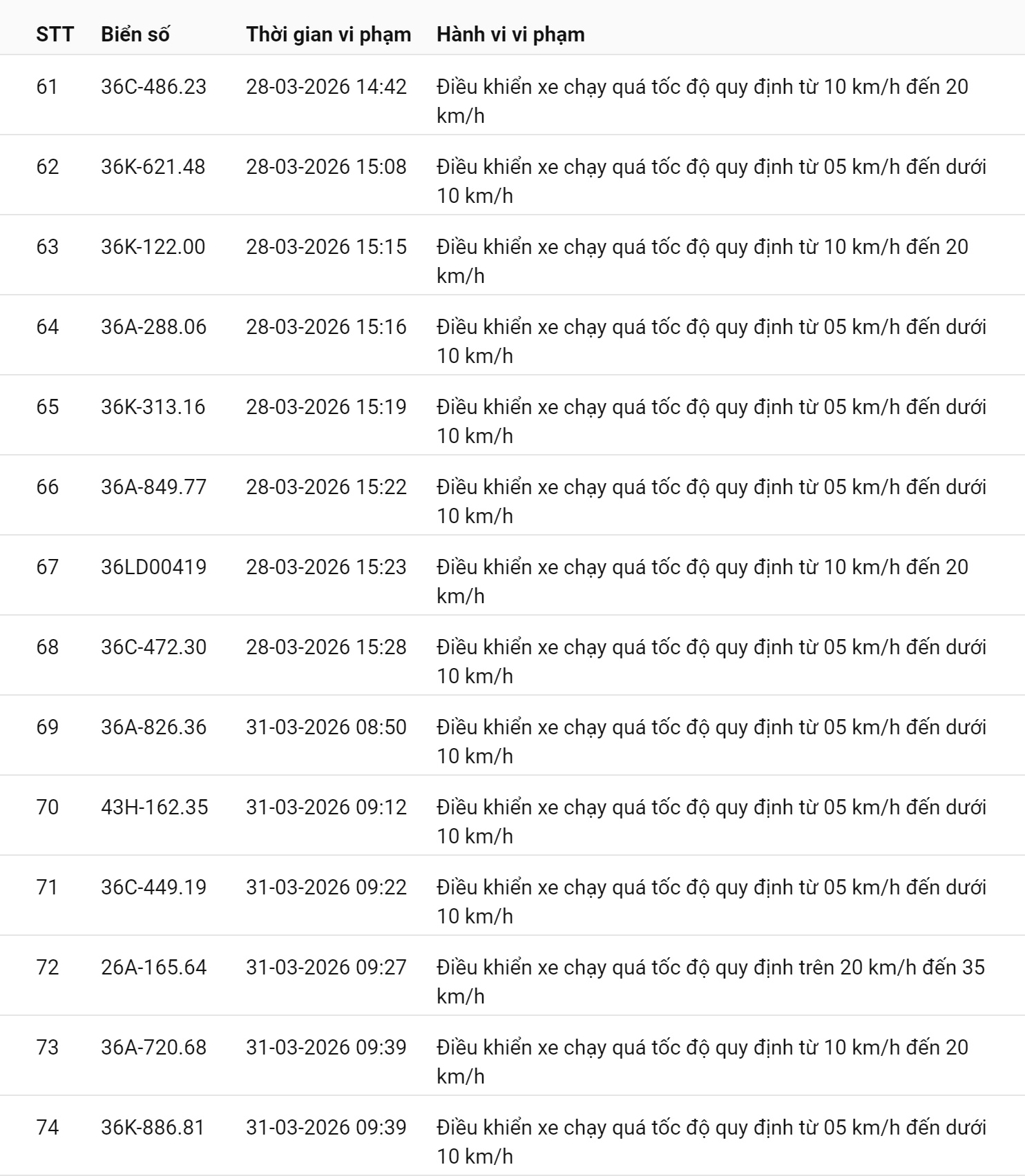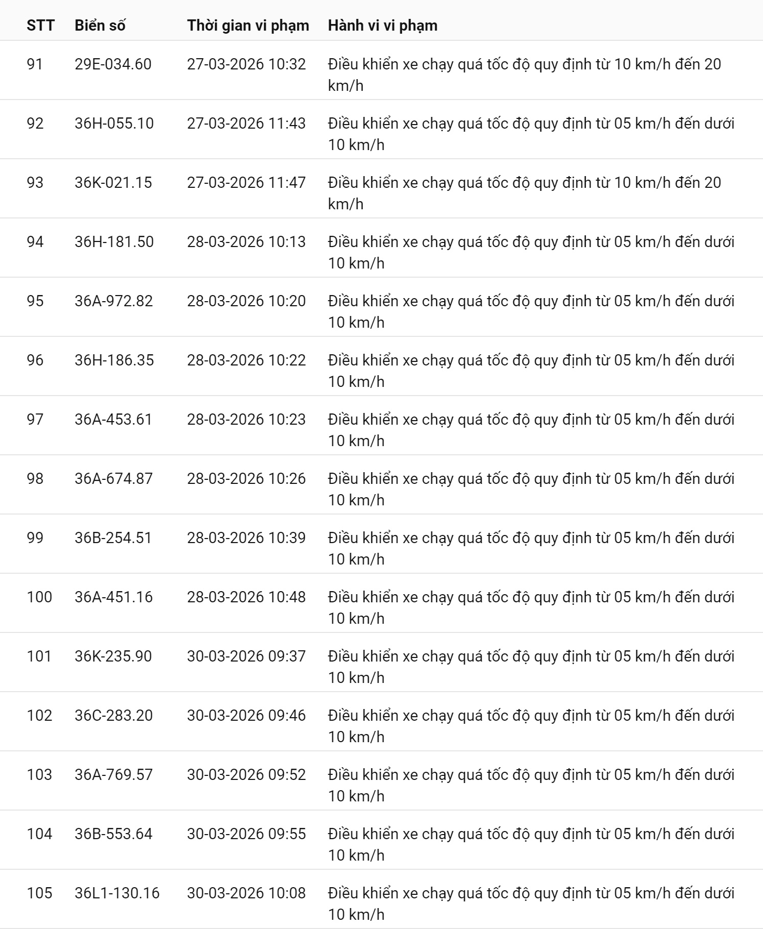 Theo thông báo từ Công an tỉnh Thanh Hóa đăng tải ngày 25/4, thông qua thiết bị kỹ thuật nghiệp vụ, các tổ công tác của phòng CSGT đã phát hiện, ghi nhận bằng hình ảnh đối với tổng số 793 trường hợp phương tiện vi phạm quy định về tốc độ trên các tuyến Quốc lộ trong thời gian từ ngày 16/03/2026 đến ngày 31/03/2026. Danh sách biển số vi phạm cụ thể như sau: