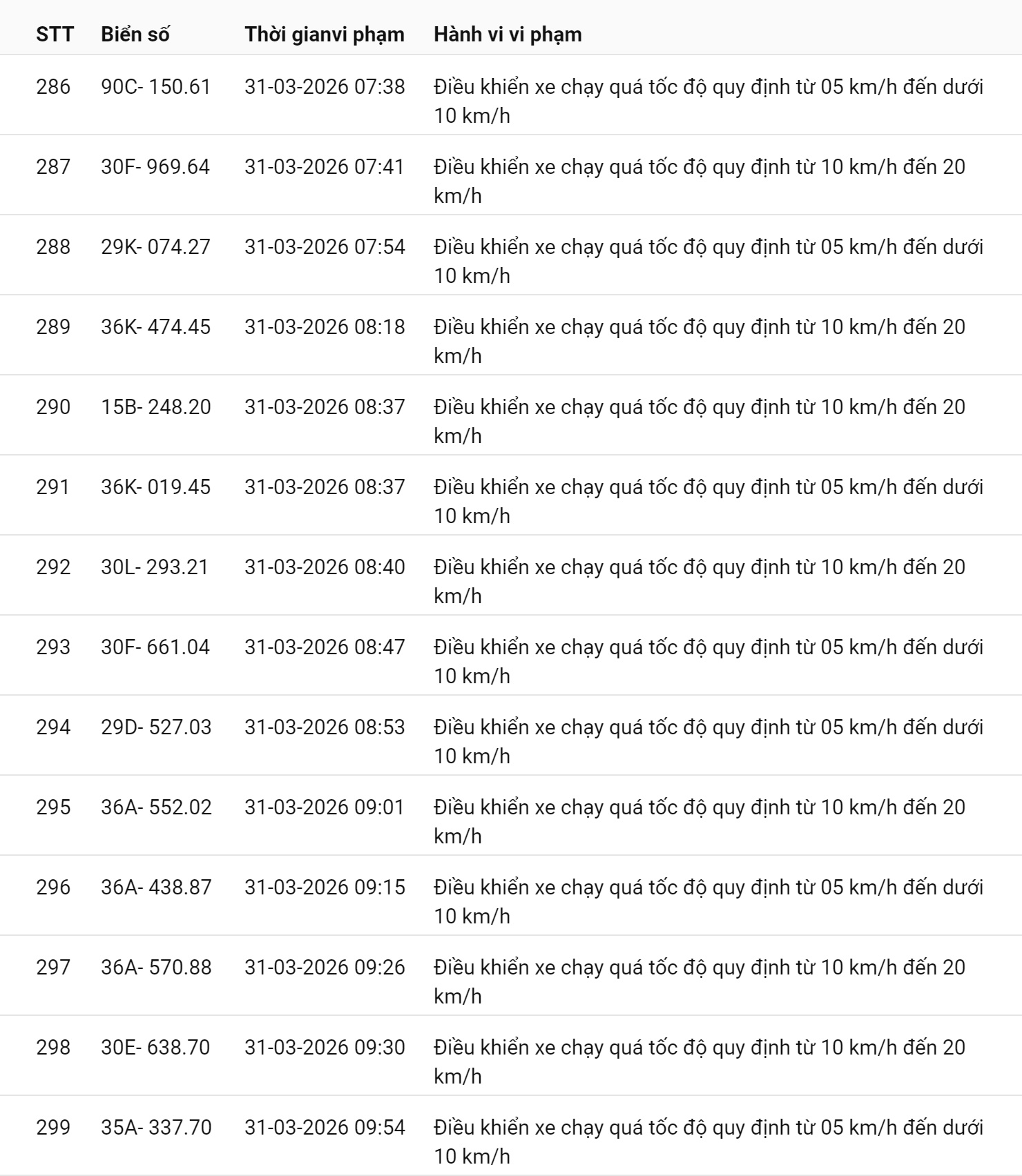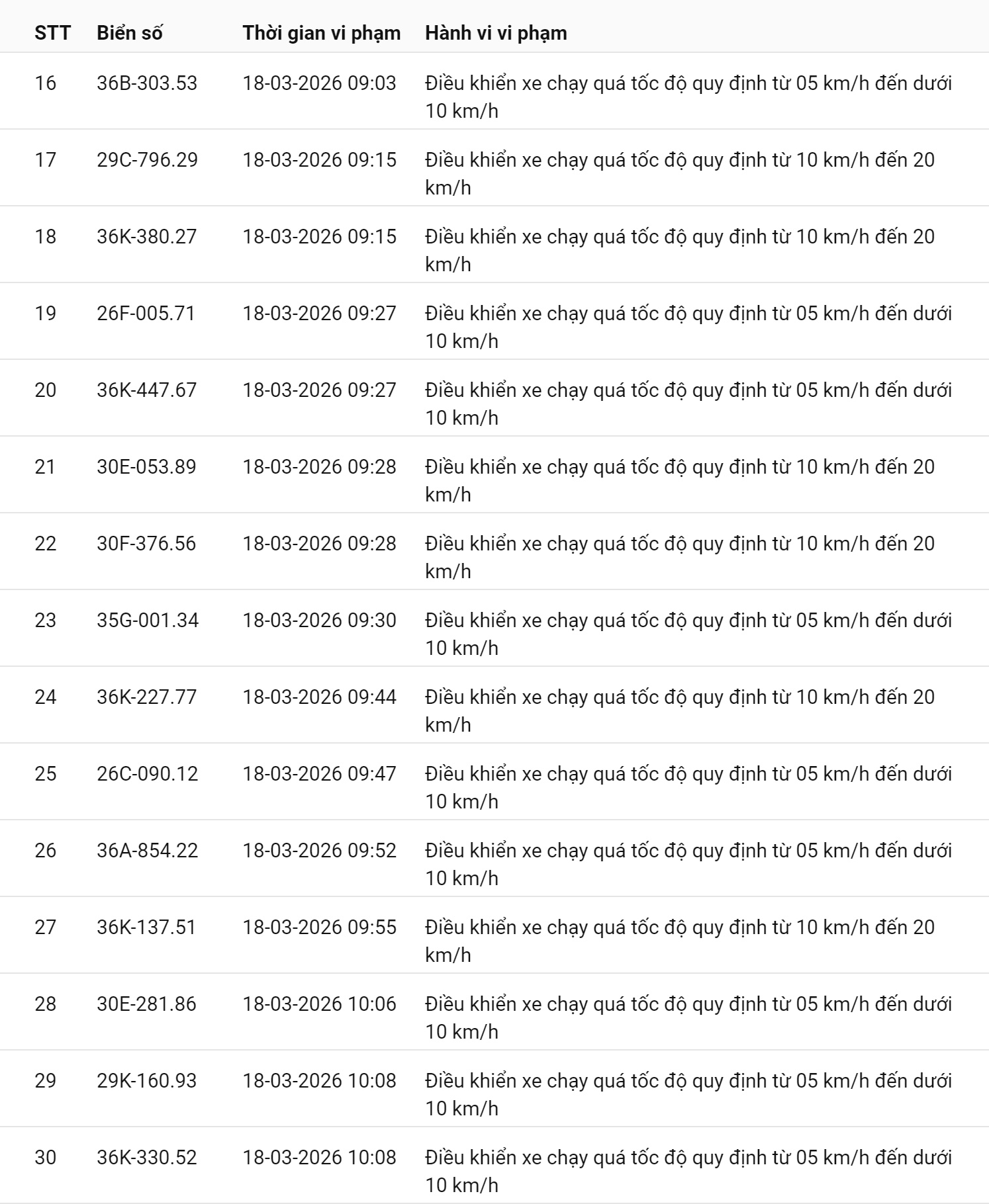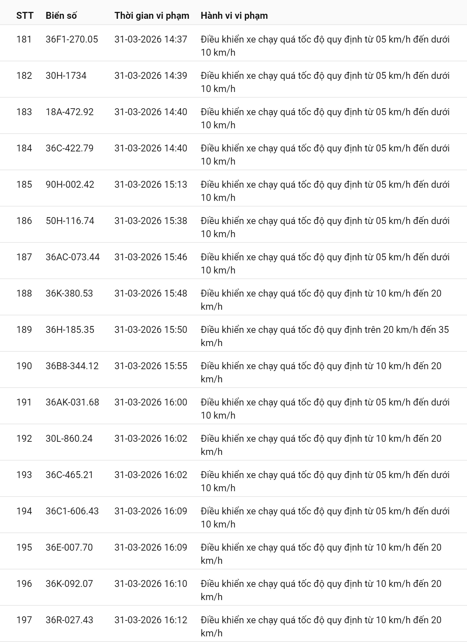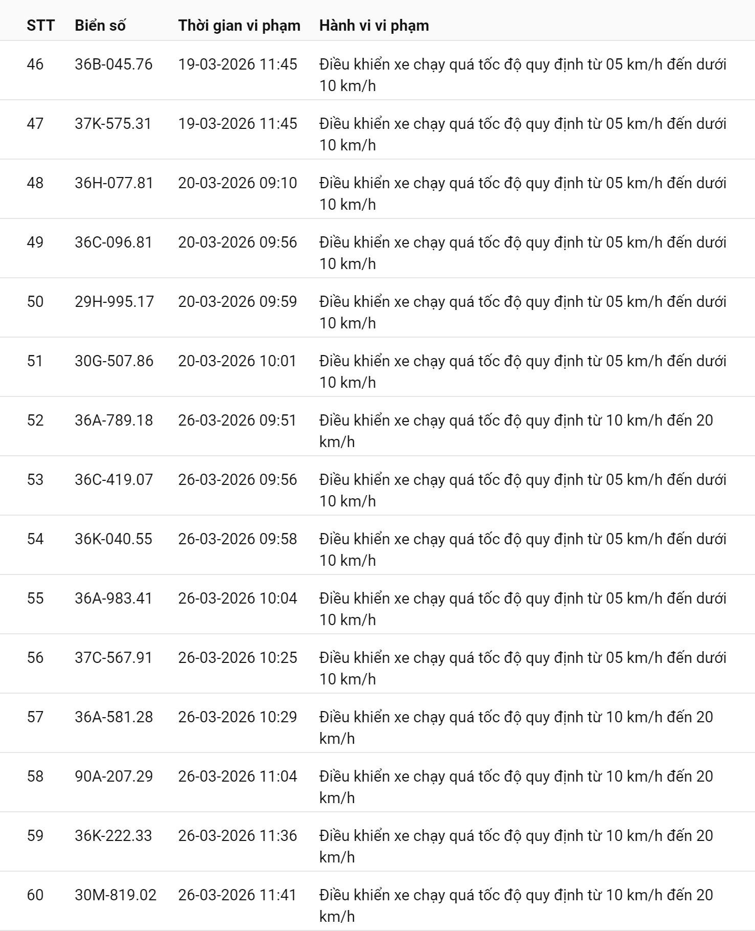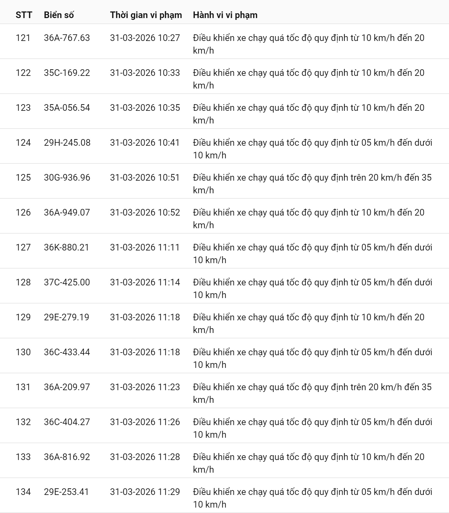 Theo thông báo từ Công an tỉnh Thanh Hóa đăng tải ngày 25/4, thông qua thiết bị kỹ thuật nghiệp vụ, các tổ công tác của phòng CSGT đã phát hiện, ghi nhận bằng hình ảnh đối với tổng số 793 trường hợp phương tiện vi phạm quy định về tốc độ trên các tuyến Quốc lộ trong thời gian từ ngày 16/03/2026 đến ngày 31/03/2026. Danh sách biển số vi phạm cụ thể như sau: