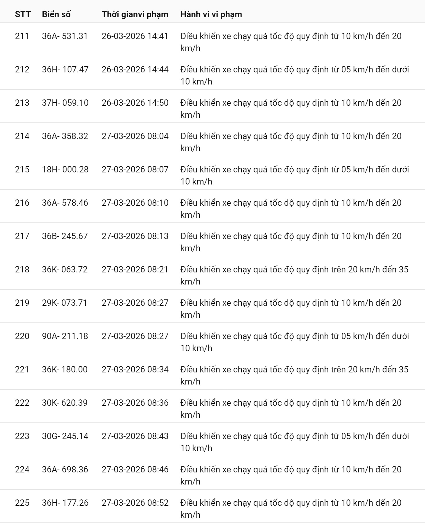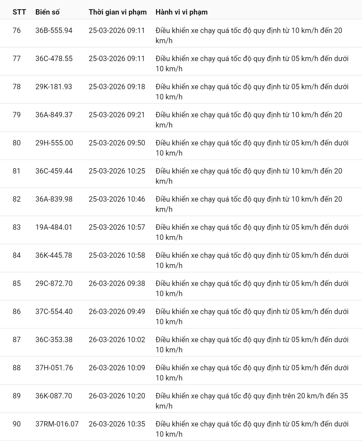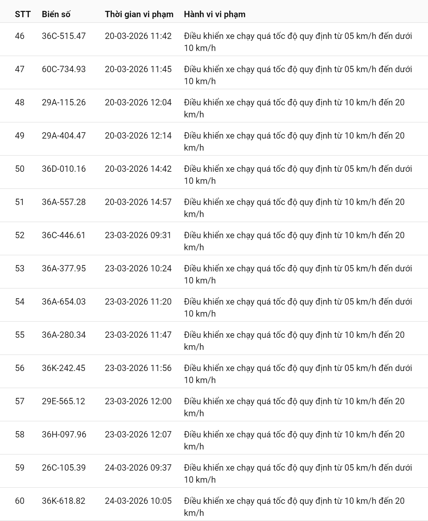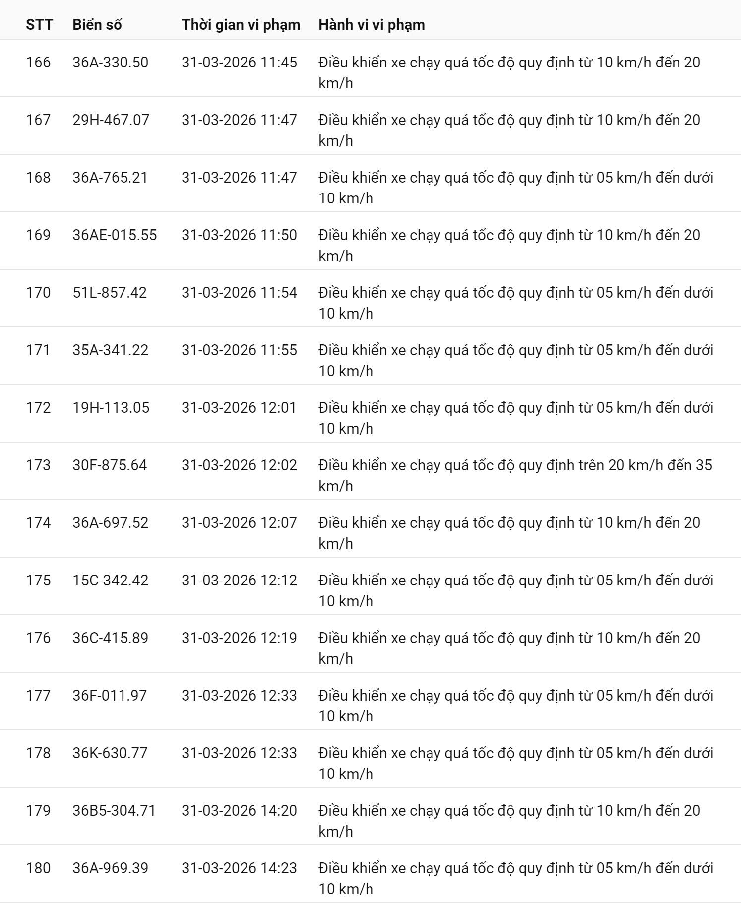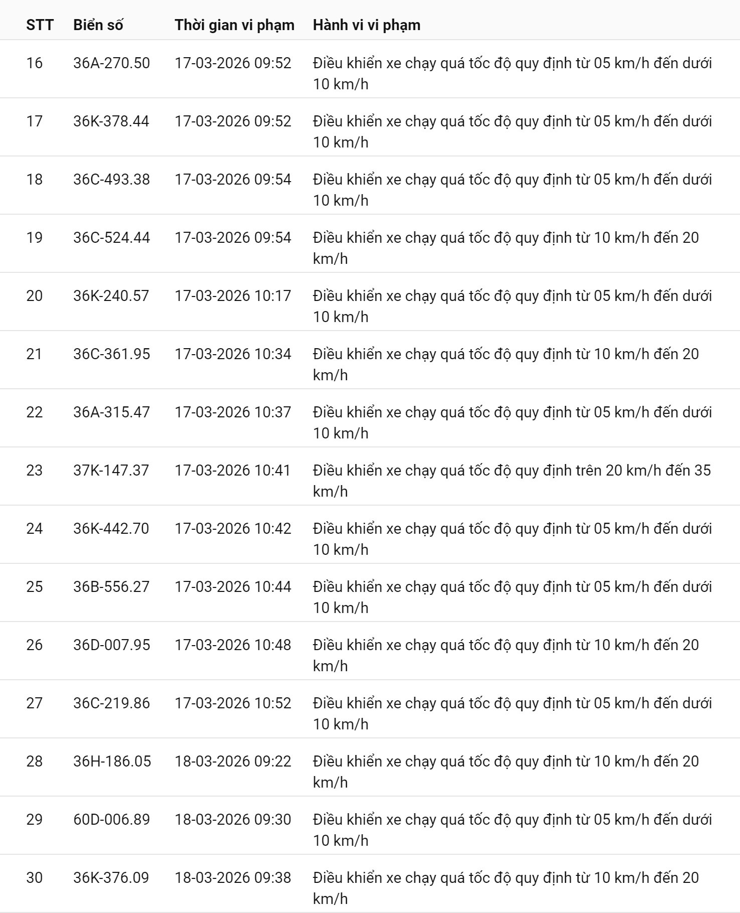 Theo thông báo từ Công an tỉnh Thanh Hóa đăng tải ngày 25/4, thông qua thiết bị kỹ thuật nghiệp vụ, các tổ công tác của phòng CSGT đã phát hiện, ghi nhận bằng hình ảnh đối với tổng số 793 trường hợp phương tiện vi phạm quy định về tốc độ trên các tuyến Quốc lộ trong thời gian từ ngày 16/03/2026 đến ngày 31/03/2026. Danh sách biển số vi phạm cụ thể như sau: