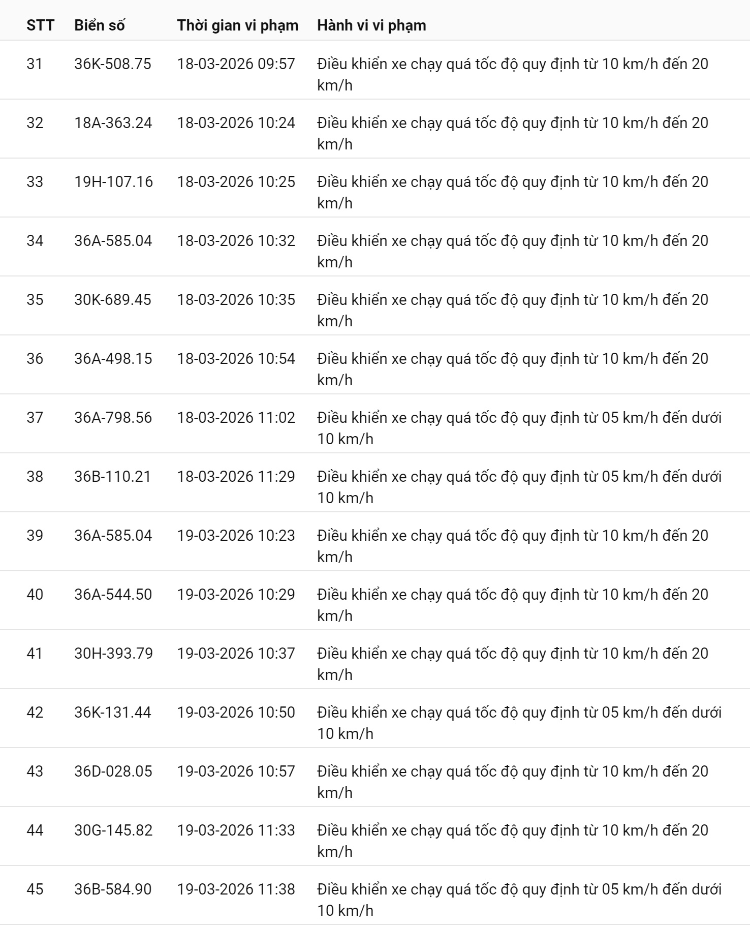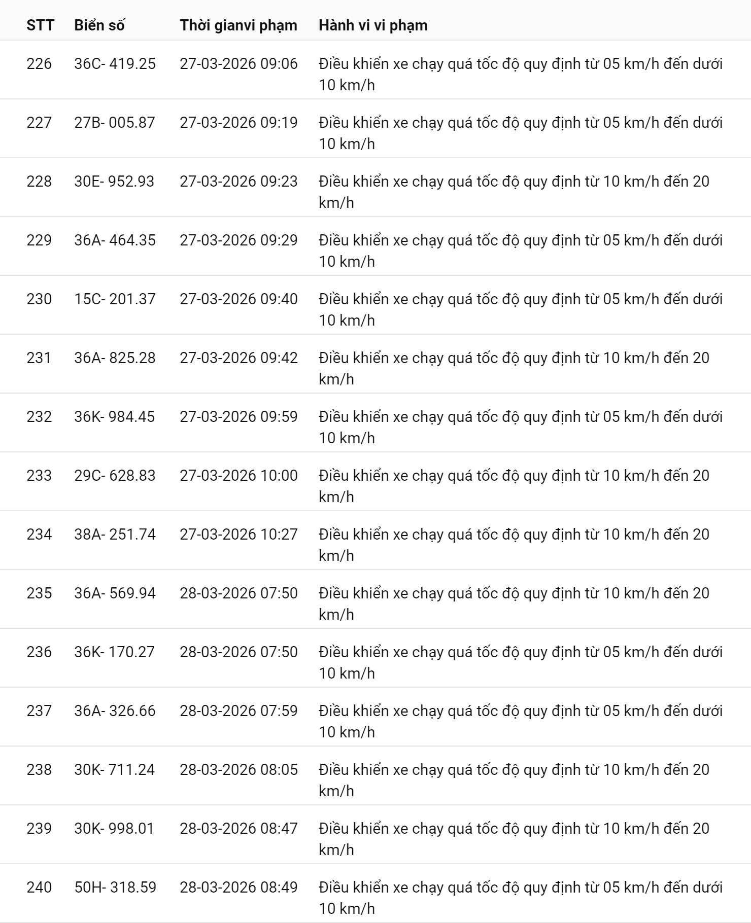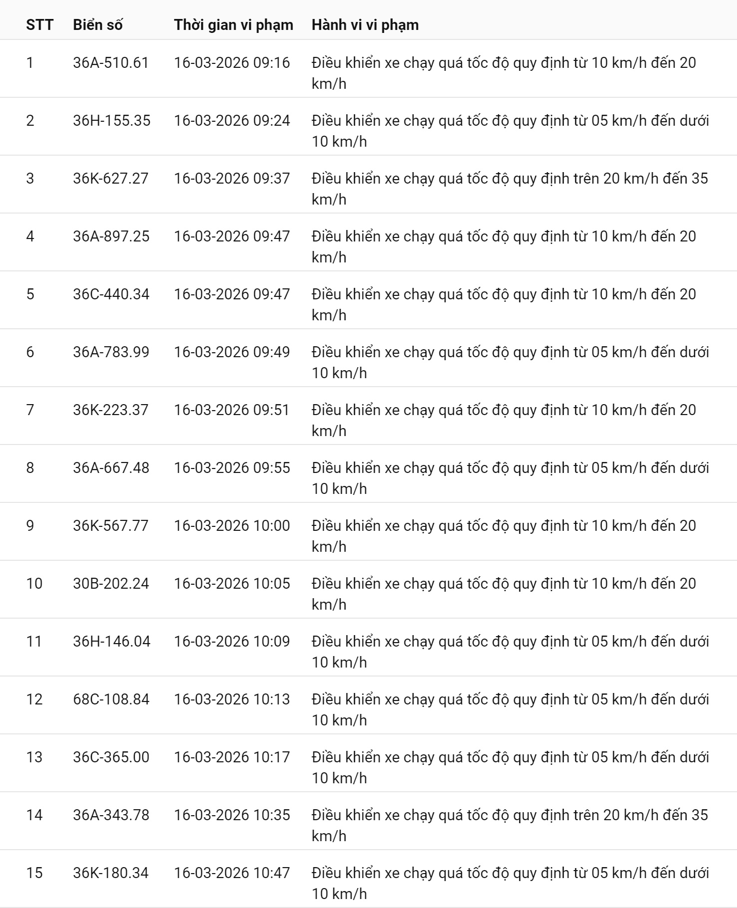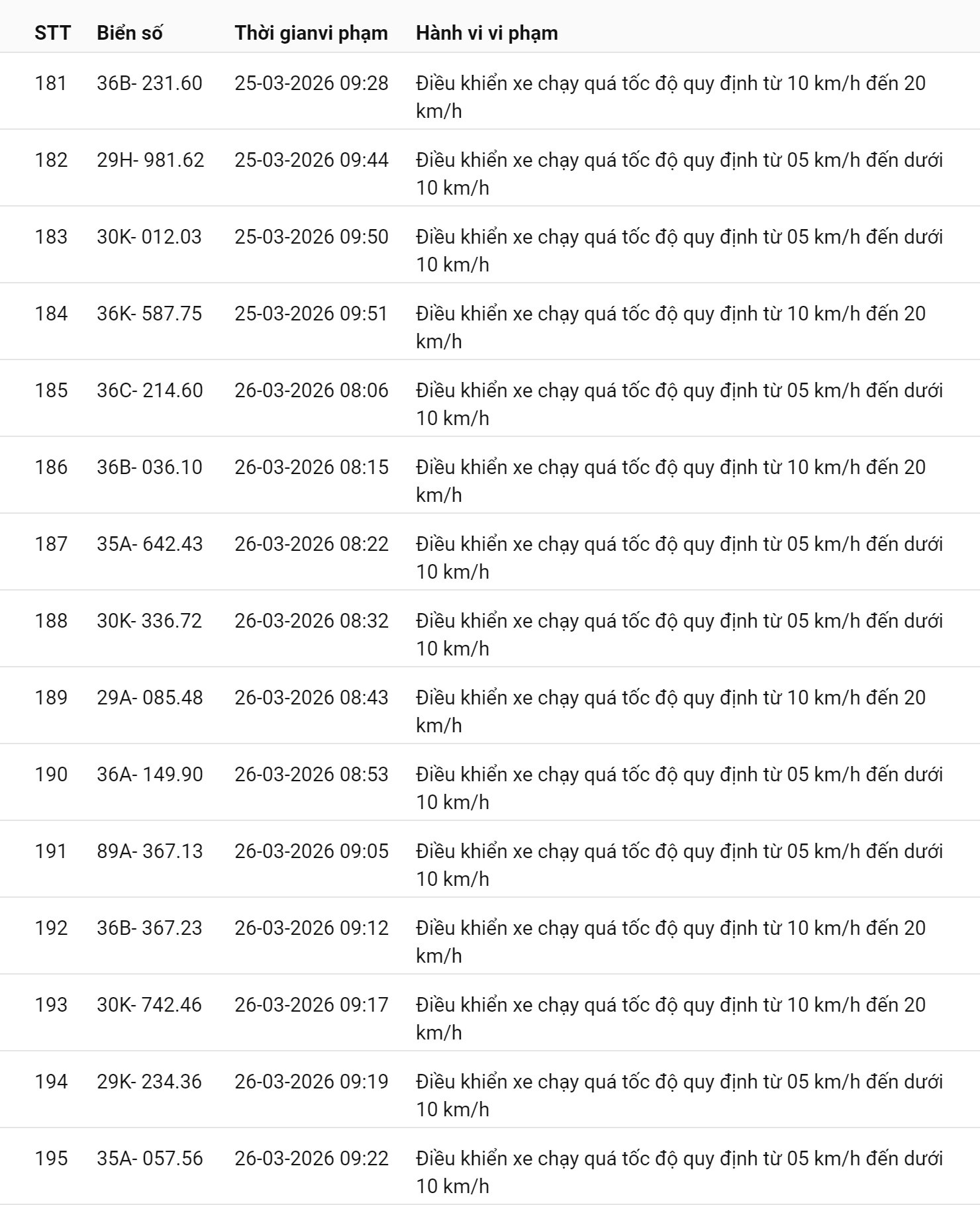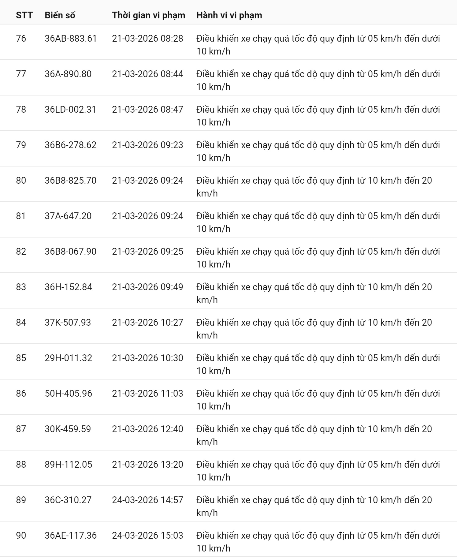 Theo thông báo từ Công an tỉnh Thanh Hóa đăng tải ngày 25/4, thông qua thiết bị kỹ thuật nghiệp vụ, các tổ công tác của phòng CSGT đã phát hiện, ghi nhận bằng hình ảnh đối với tổng số 793 trường hợp phương tiện vi phạm quy định về tốc độ trên các tuyến Quốc lộ trong thời gian từ ngày 16/03/2026 đến ngày 31/03/2026. Danh sách biển số vi phạm cụ thể như sau: