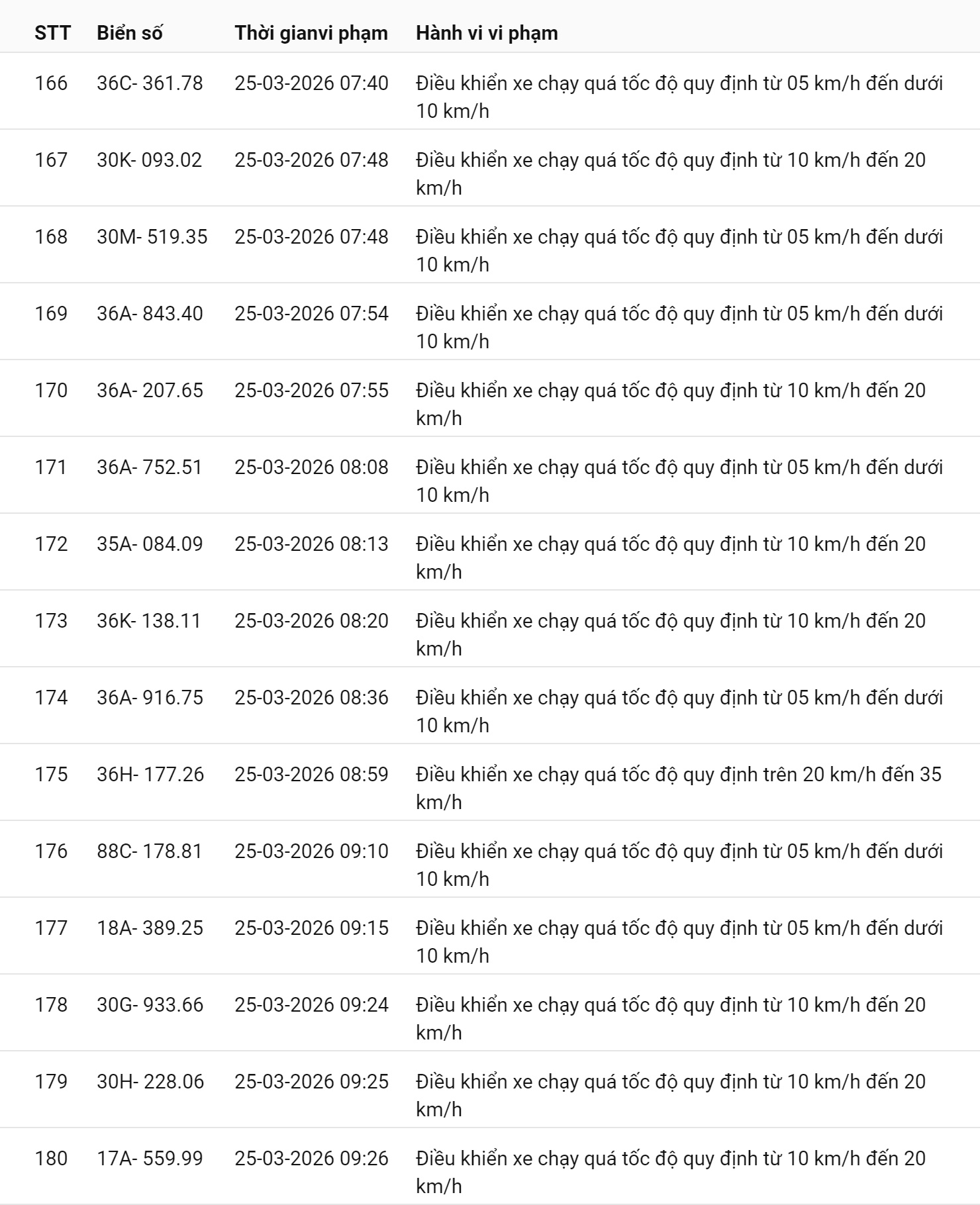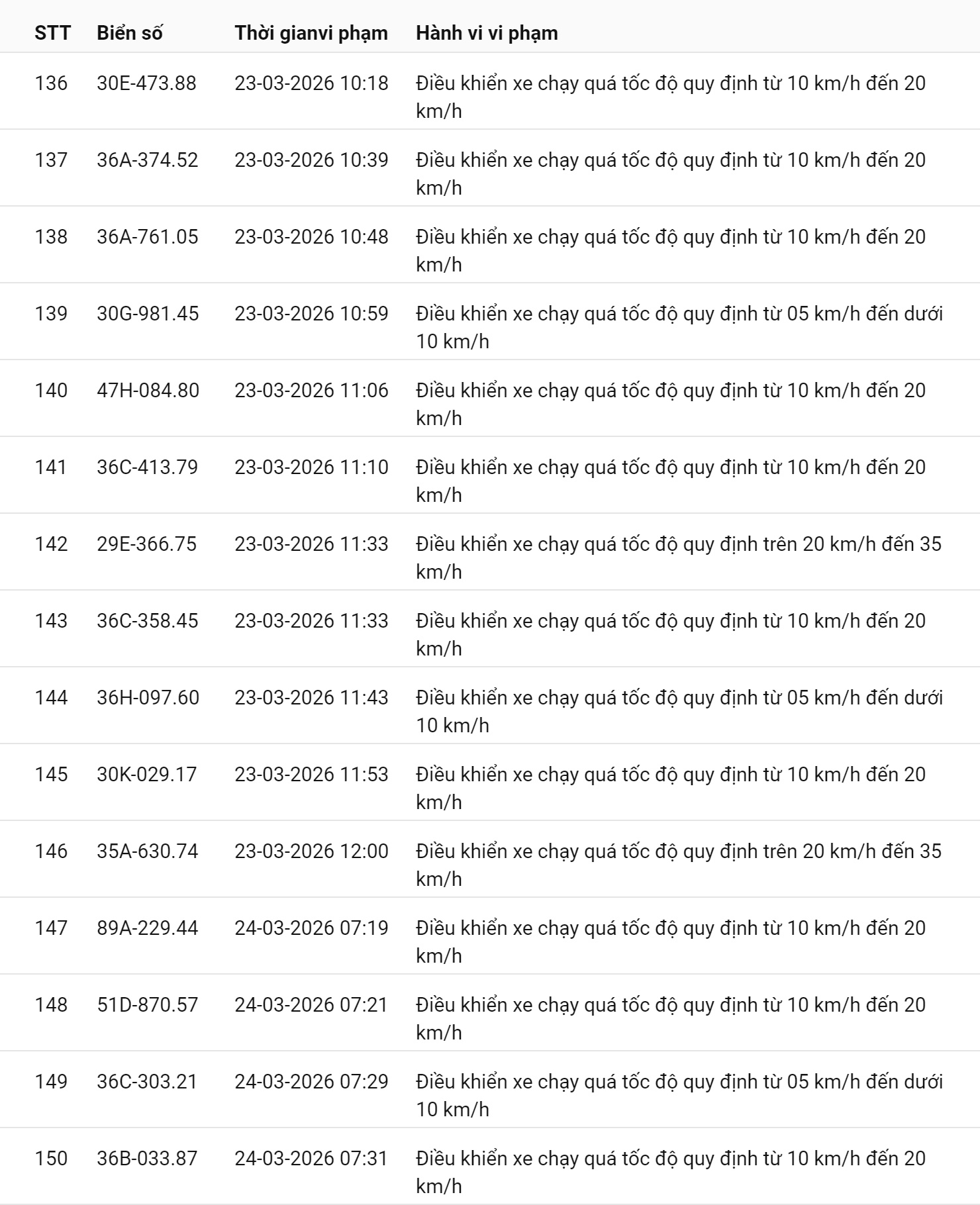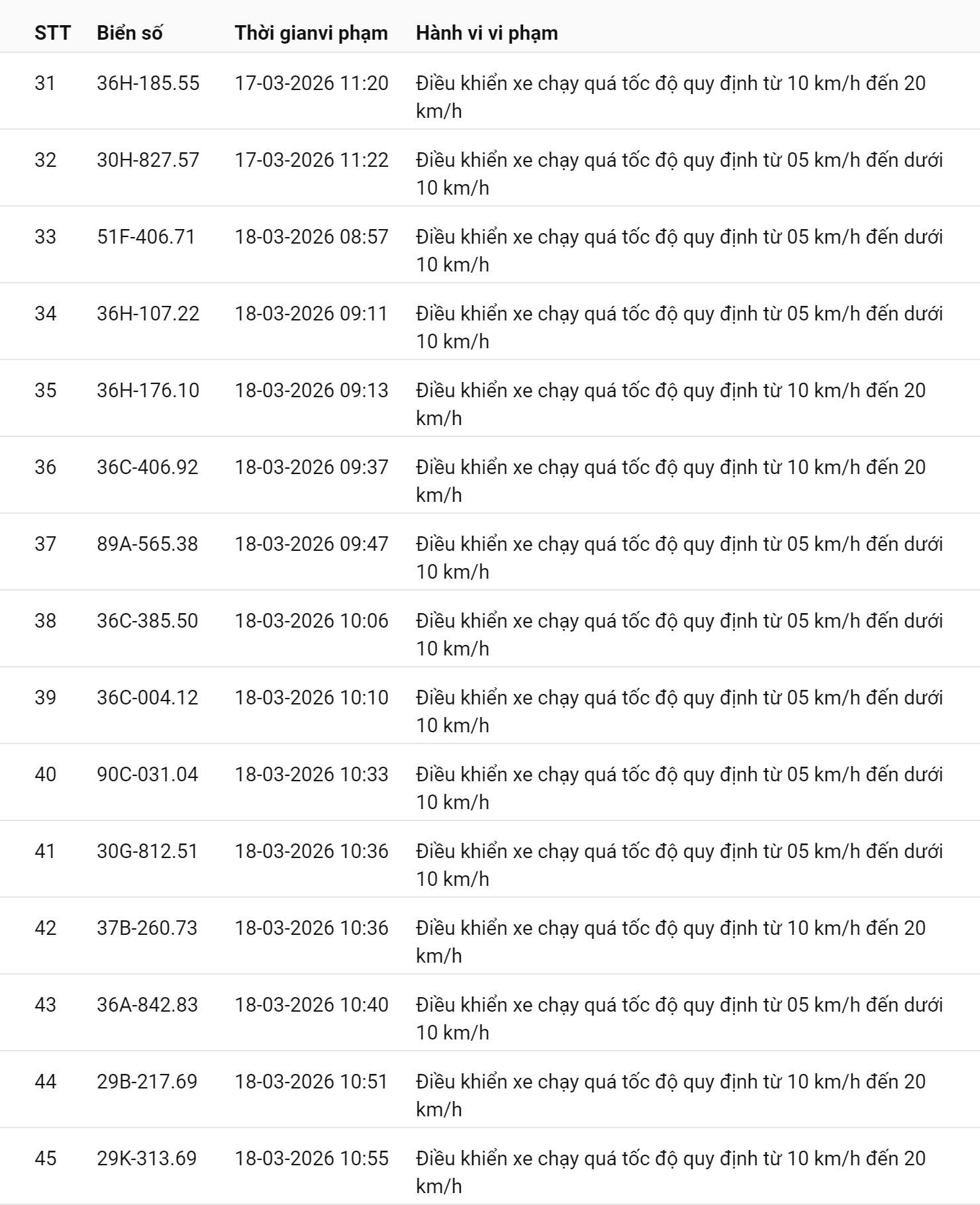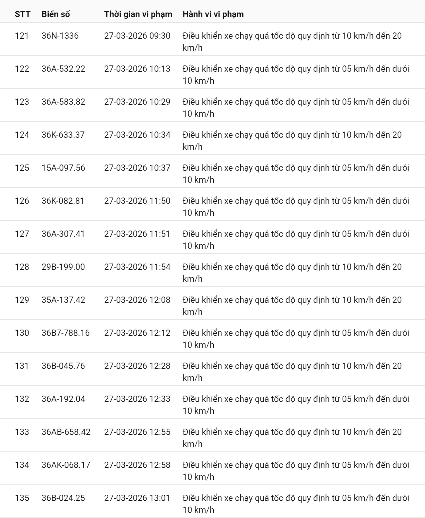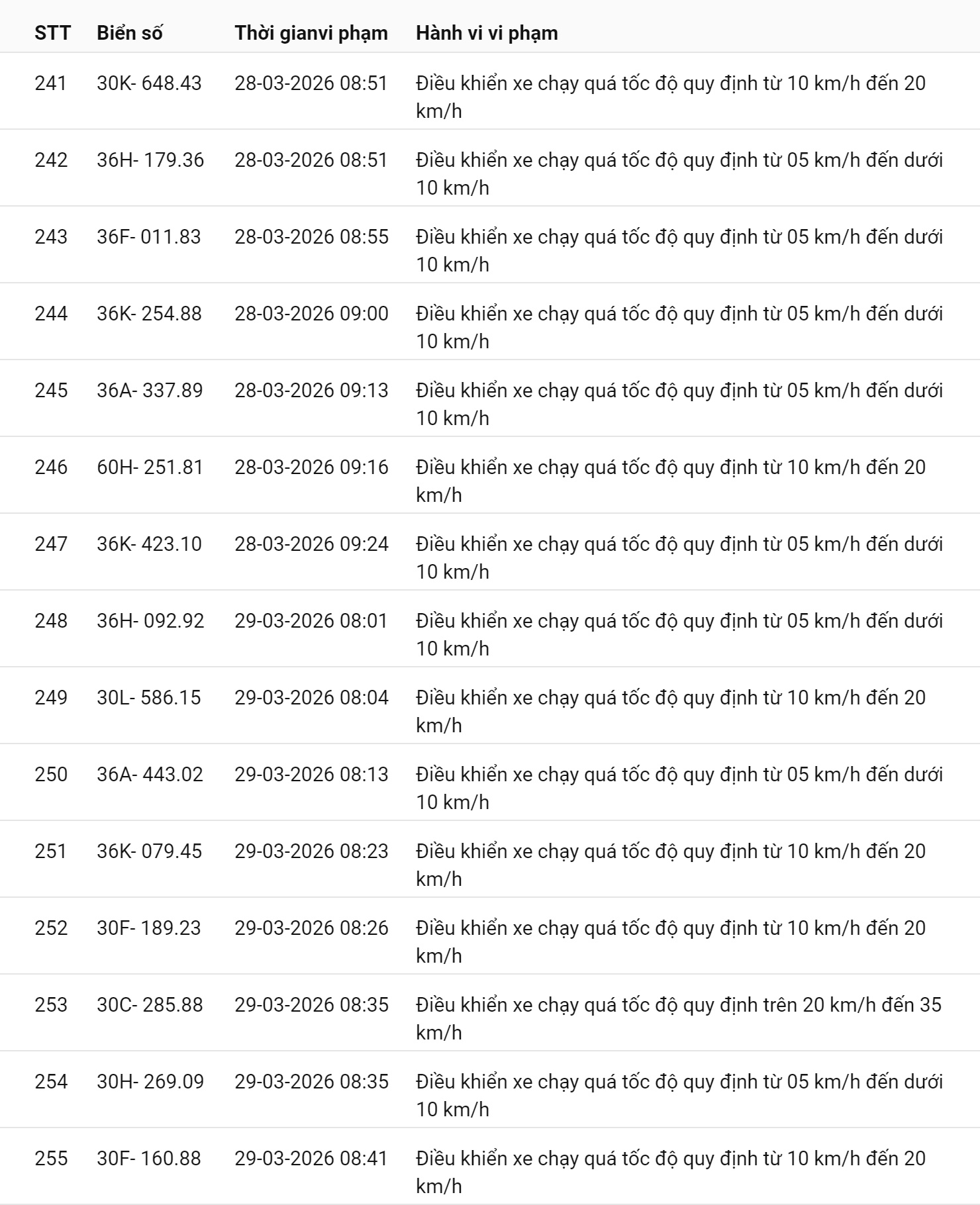 Theo thông báo từ Công an tỉnh Thanh Hóa đăng tải ngày 25/4, thông qua thiết bị kỹ thuật nghiệp vụ, các tổ công tác của phòng CSGT đã phát hiện, ghi nhận bằng hình ảnh đối với tổng số 793 trường hợp phương tiện vi phạm quy định về tốc độ trên các tuyến Quốc lộ trong thời gian từ ngày 16/03/2026 đến ngày 31/03/2026. Danh sách biển số vi phạm cụ thể như sau: