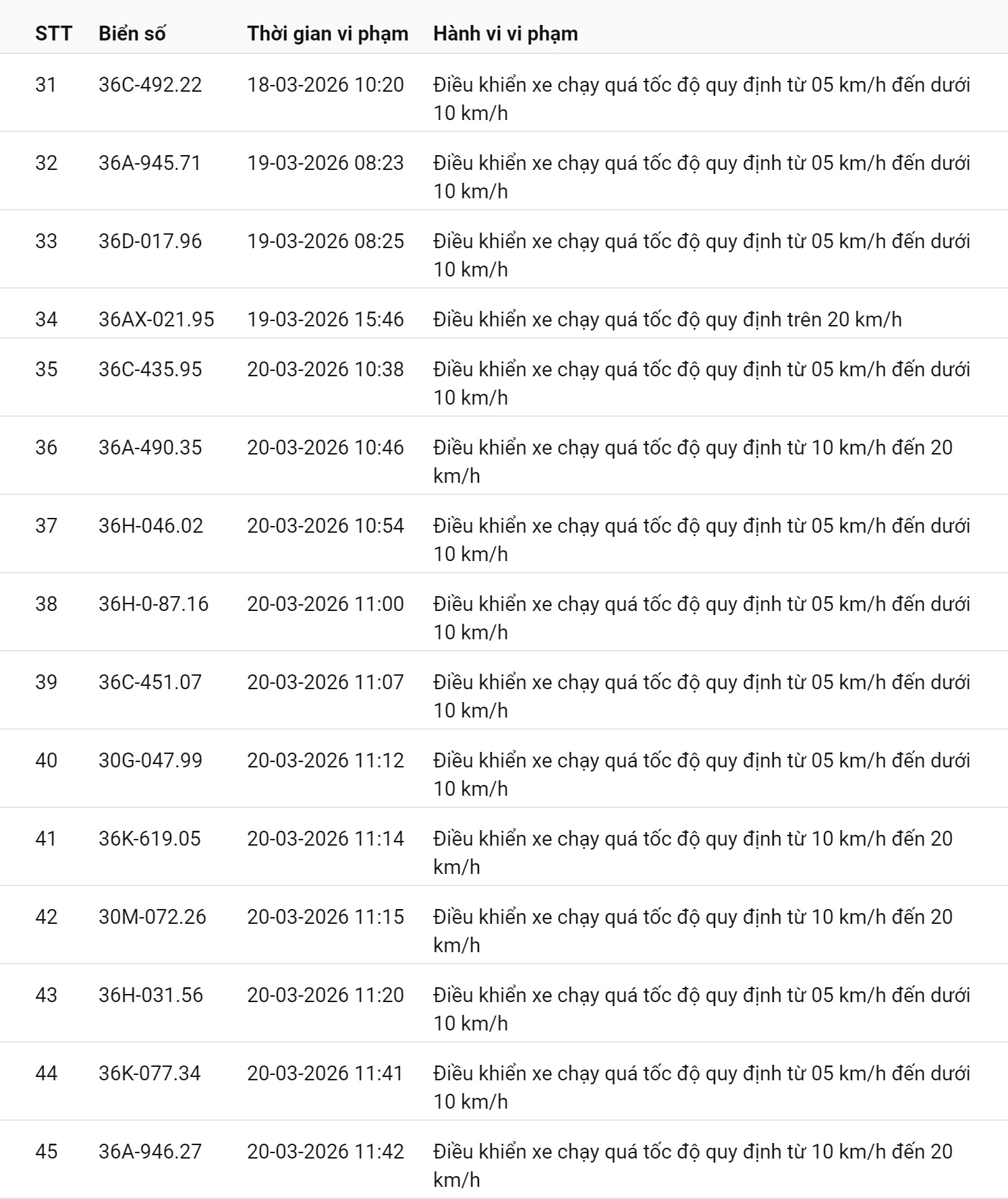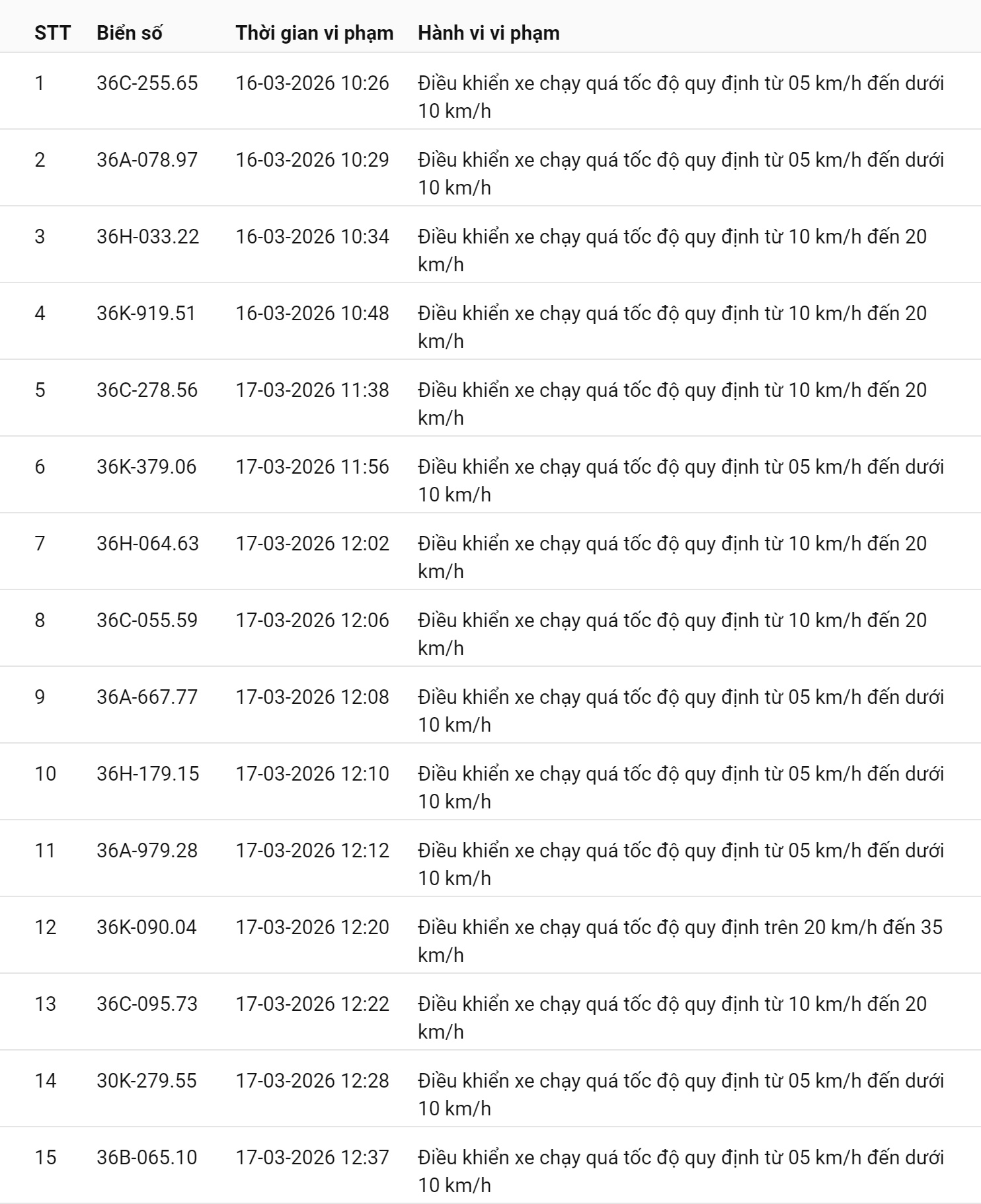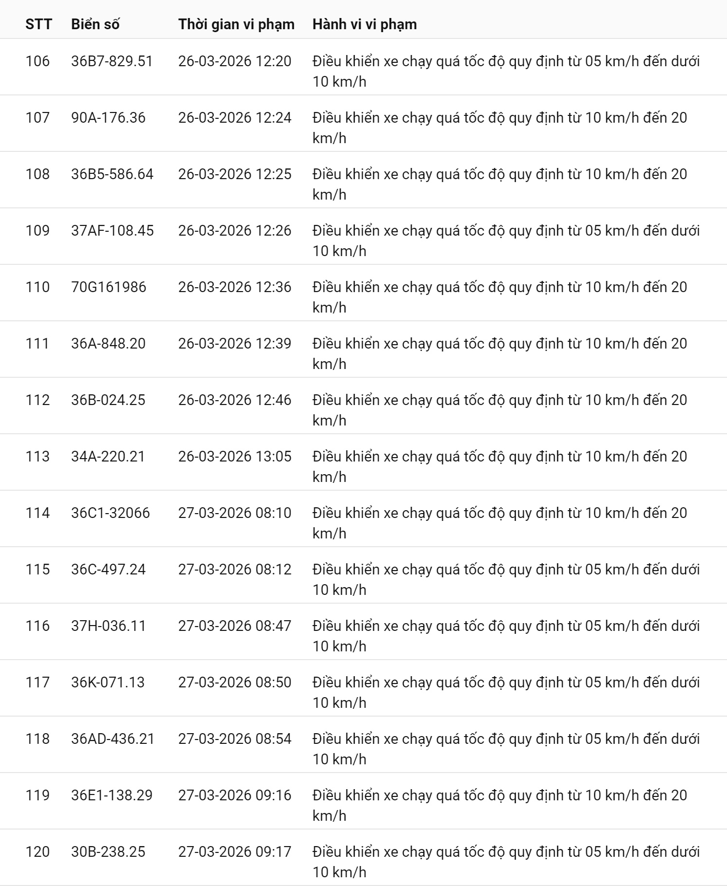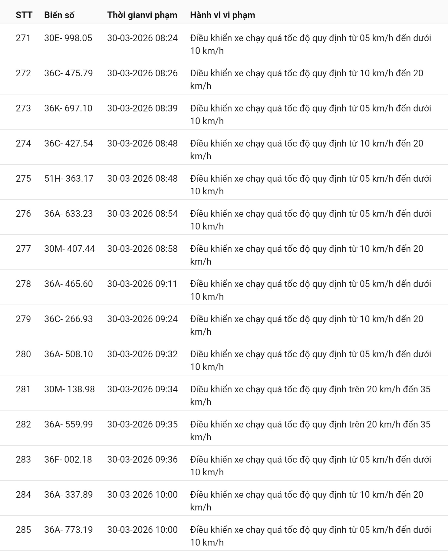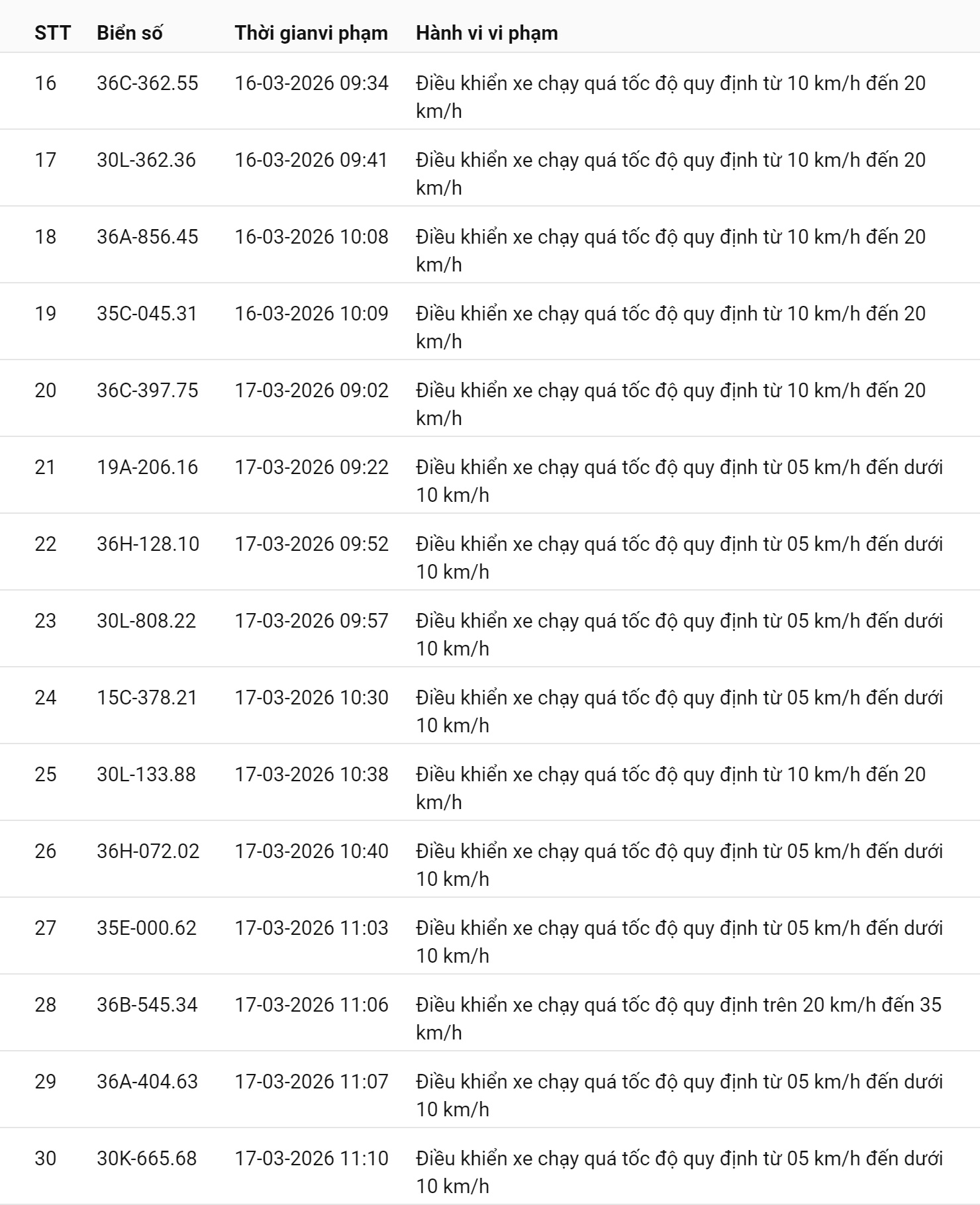 Theo thông báo từ Công an tỉnh Thanh Hóa đăng tải ngày 25/4, thông qua thiết bị kỹ thuật nghiệp vụ, các tổ công tác của phòng CSGT đã phát hiện, ghi nhận bằng hình ảnh đối với tổng số 793 trường hợp phương tiện vi phạm quy định về tốc độ trên các tuyến Quốc lộ trong thời gian từ ngày 16/03/2026 đến ngày 31/03/2026. Danh sách biển số vi phạm cụ thể như sau: