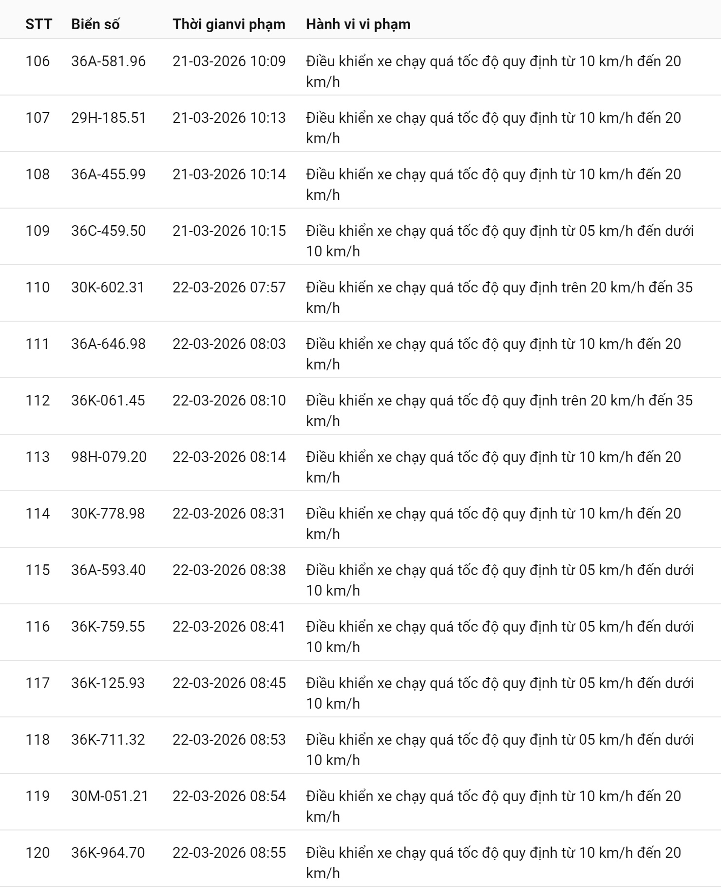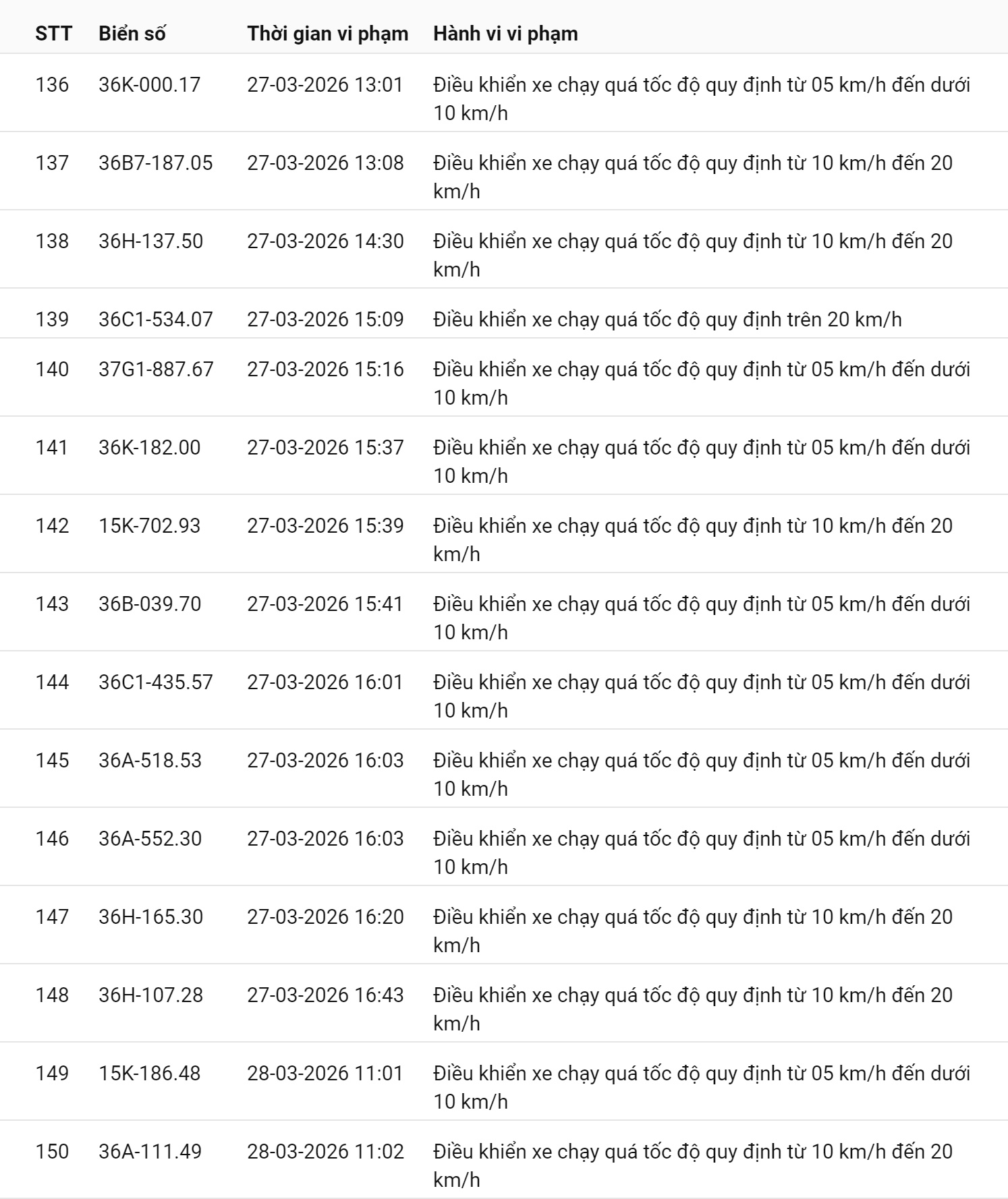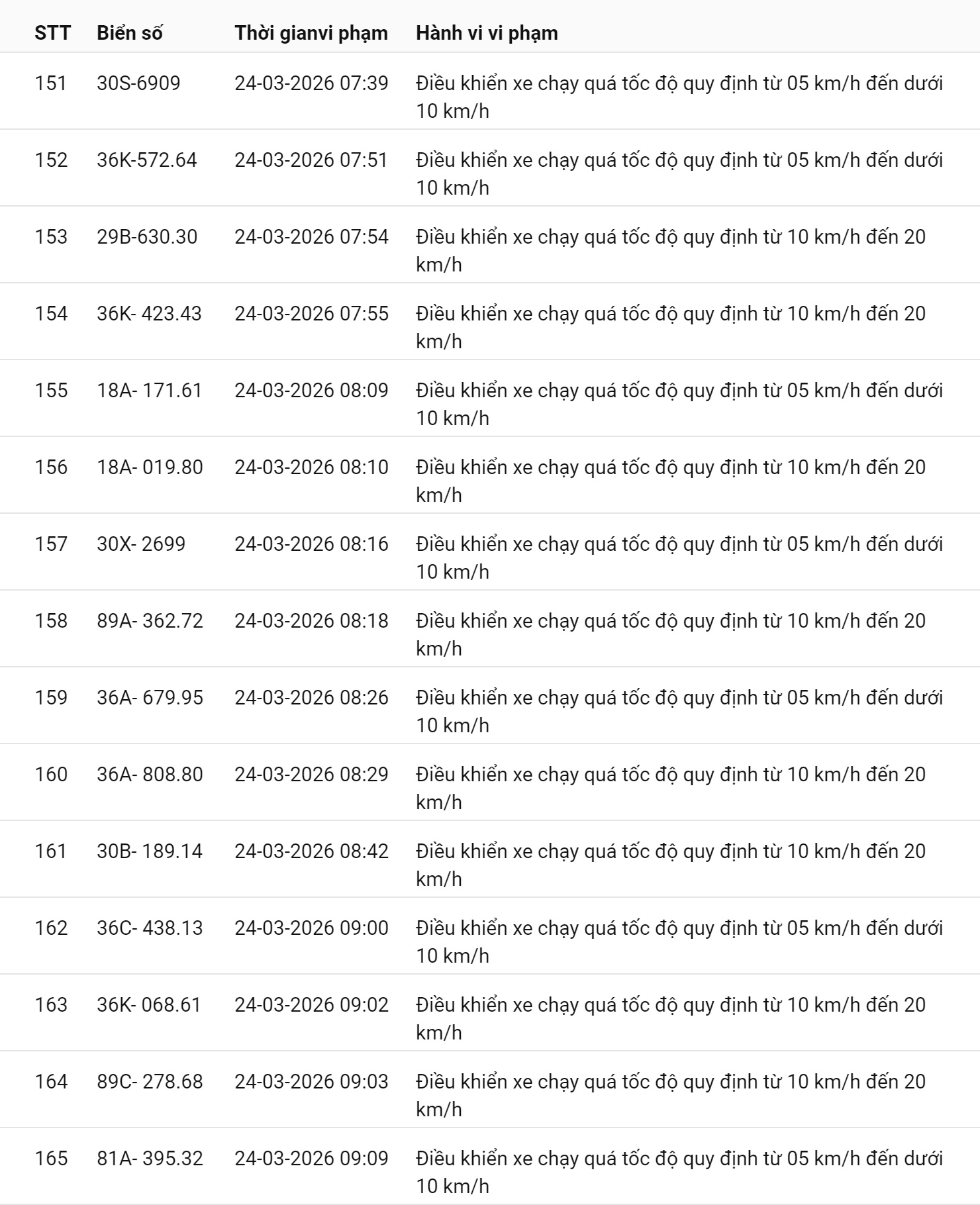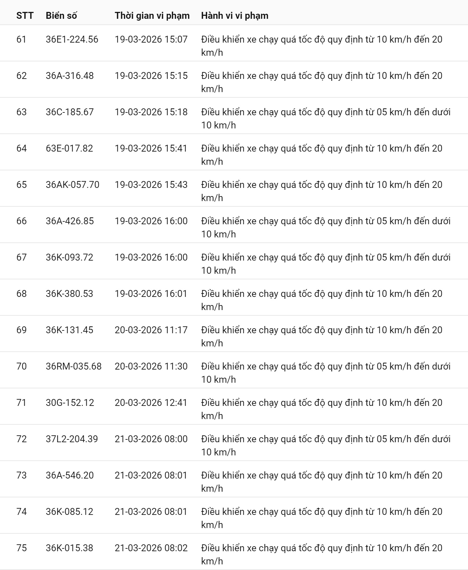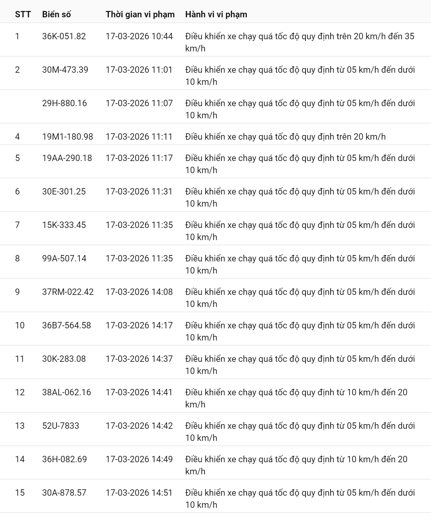 Theo thông báo từ Công an tỉnh Thanh Hóa đăng tải ngày 25/4, thông qua thiết bị kỹ thuật nghiệp vụ, các tổ công tác của phòng CSGT đã phát hiện, ghi nhận bằng hình ảnh đối với tổng số 793 trường hợp phương tiện vi phạm quy định về tốc độ trên các tuyến Quốc lộ trong thời gian từ ngày 16/03/2026 đến ngày 31/03/2026. Danh sách biển số vi phạm cụ thể như sau:
