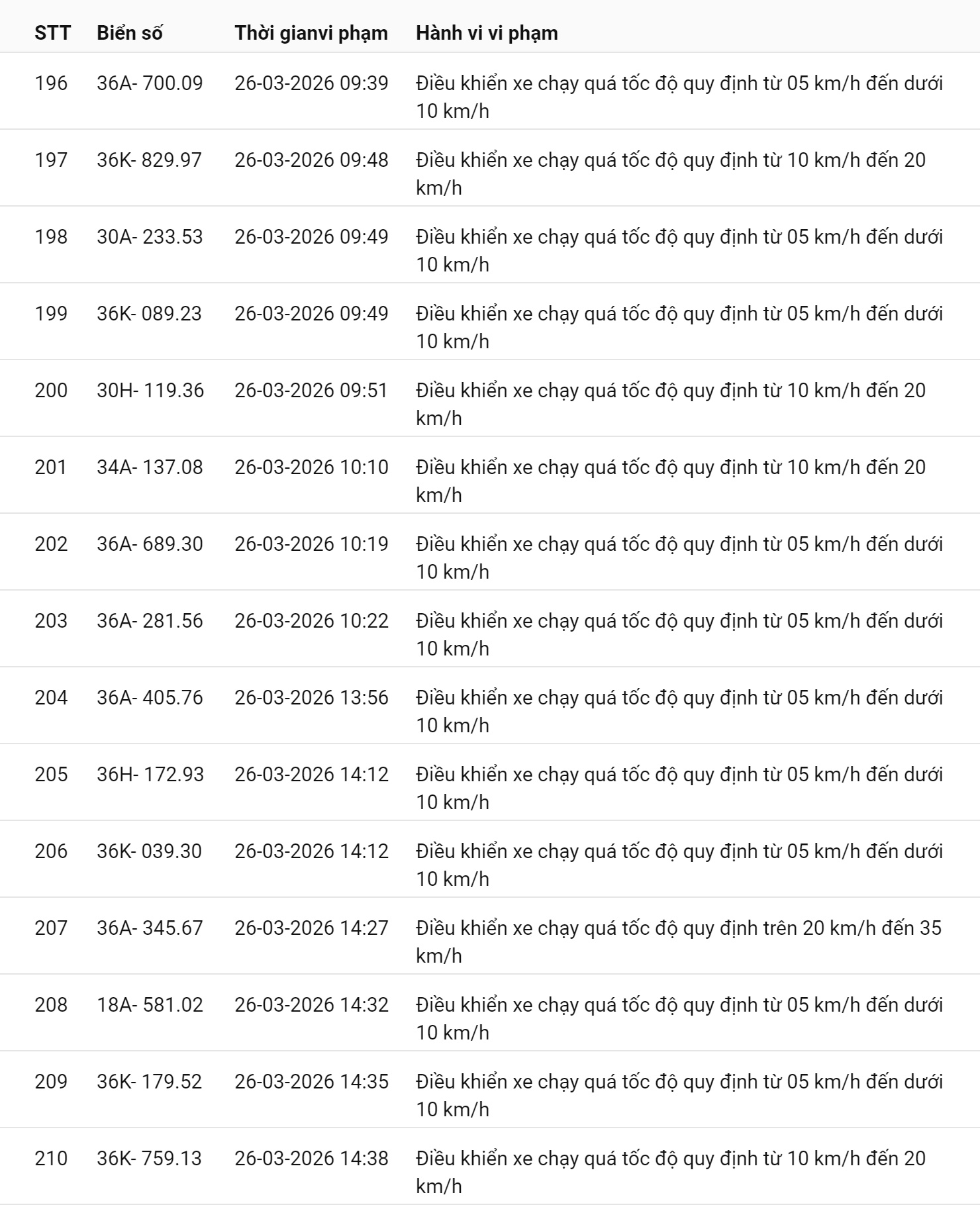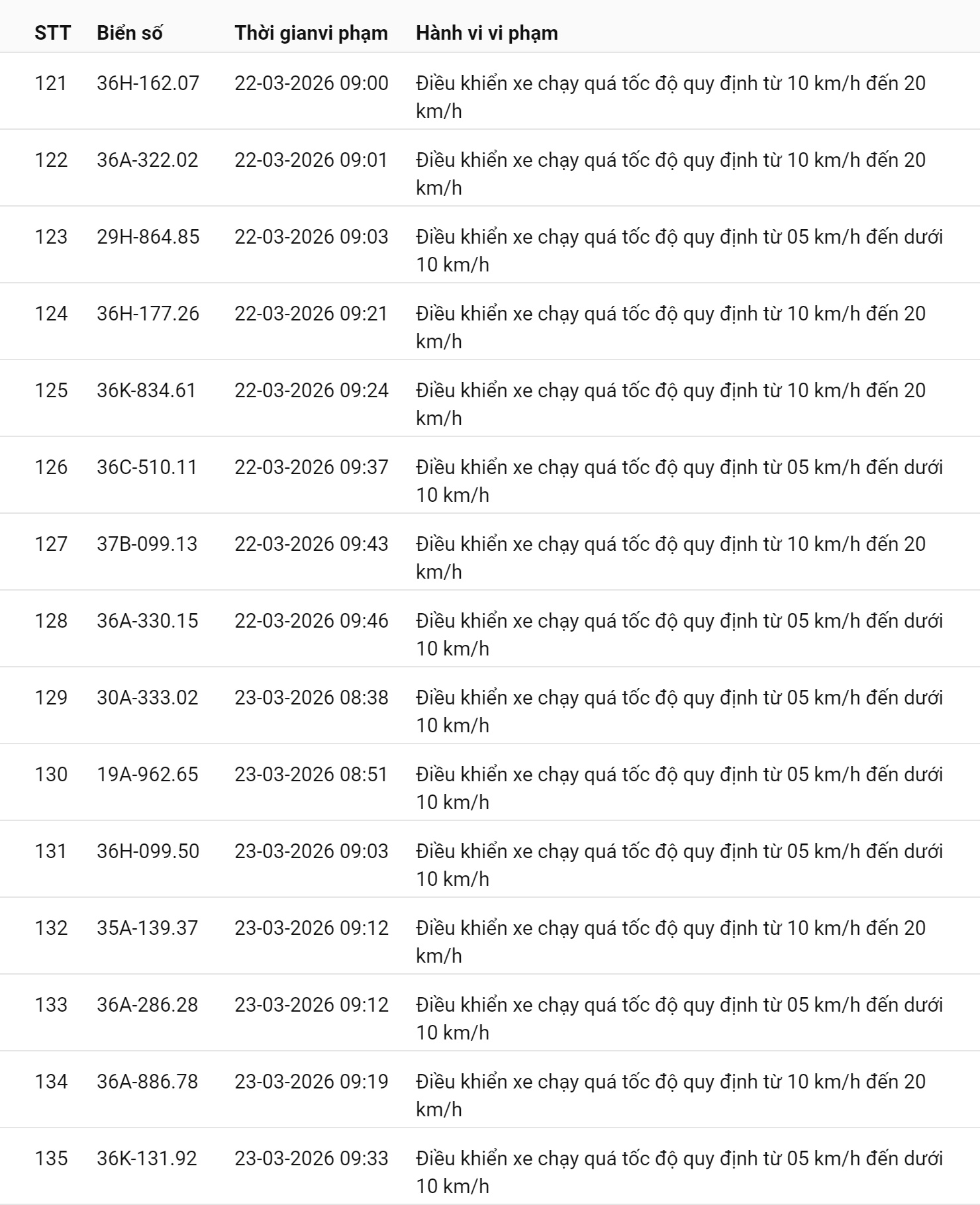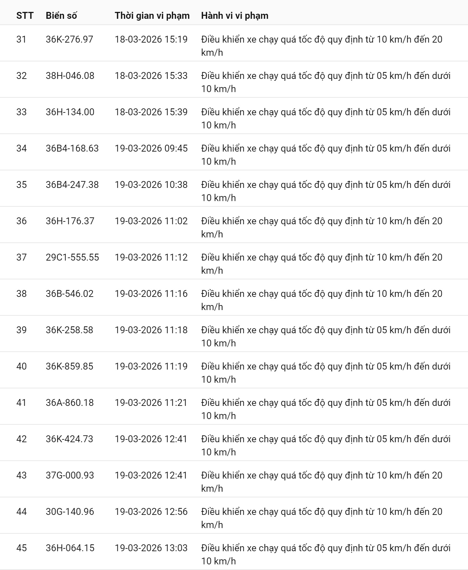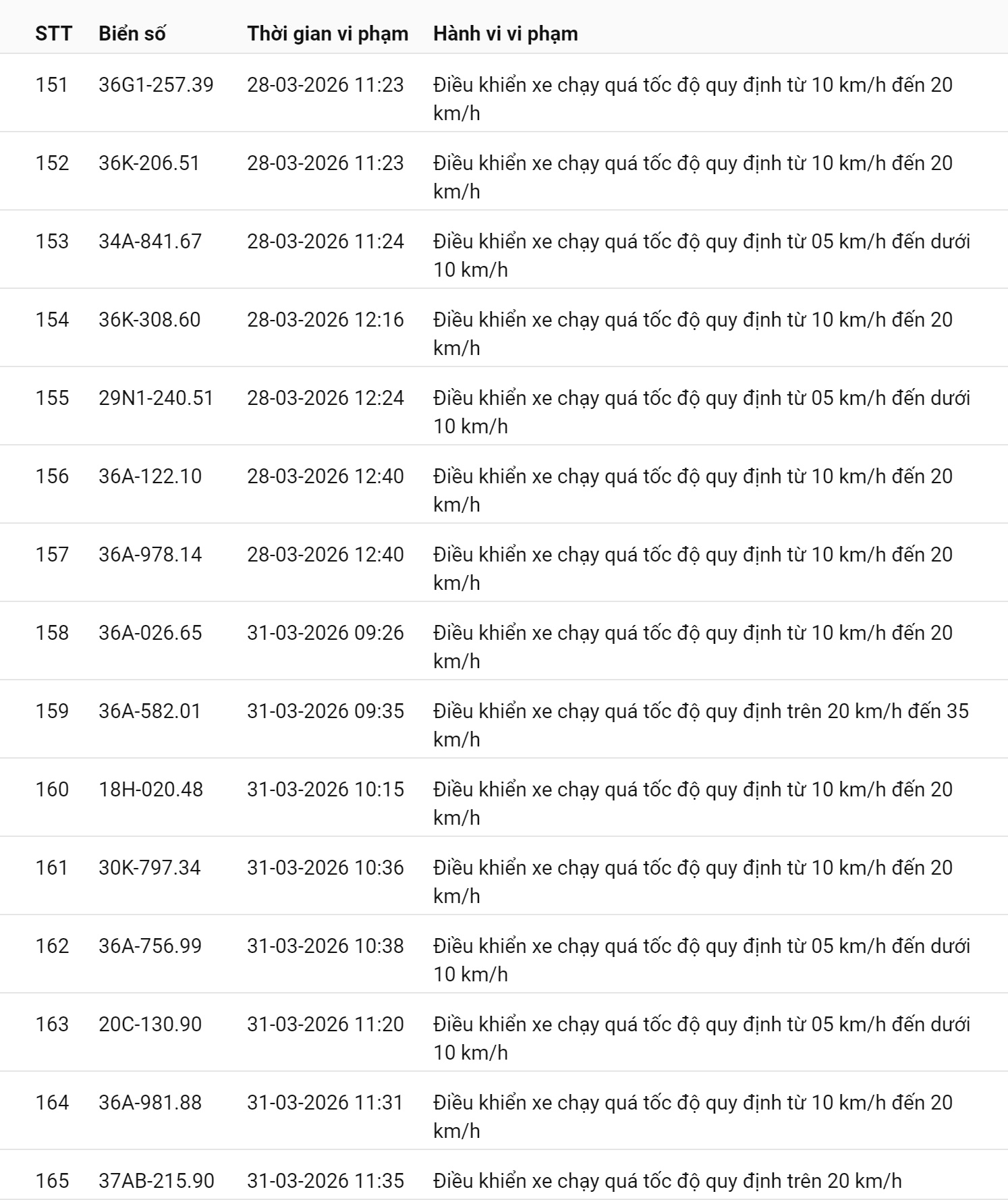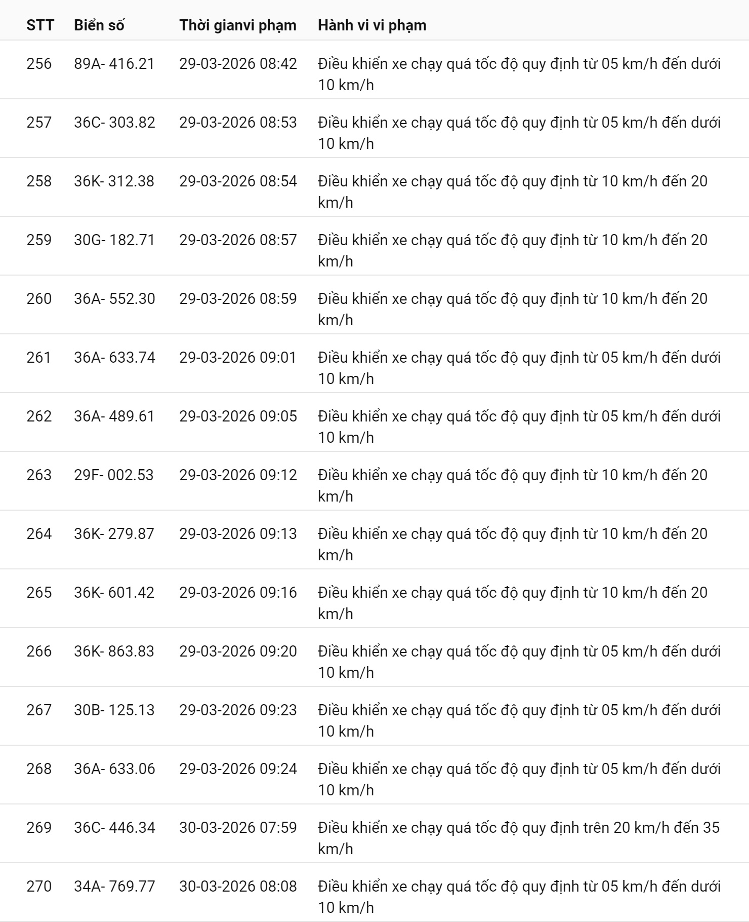 Theo thông báo từ Công an tỉnh Thanh Hóa đăng tải ngày 25/4, thông qua thiết bị kỹ thuật nghiệp vụ, các tổ công tác của phòng CSGT đã phát hiện, ghi nhận bằng hình ảnh đối với tổng số 793 trường hợp phương tiện vi phạm quy định về tốc độ trên các tuyến Quốc lộ trong thời gian từ ngày 16/03/2026 đến ngày 31/03/2026. Danh sách biển số vi phạm cụ thể như sau: