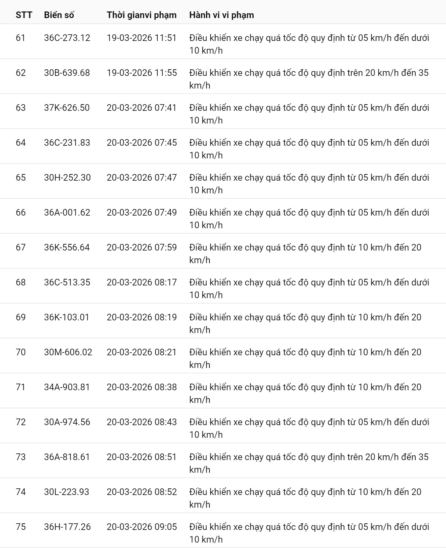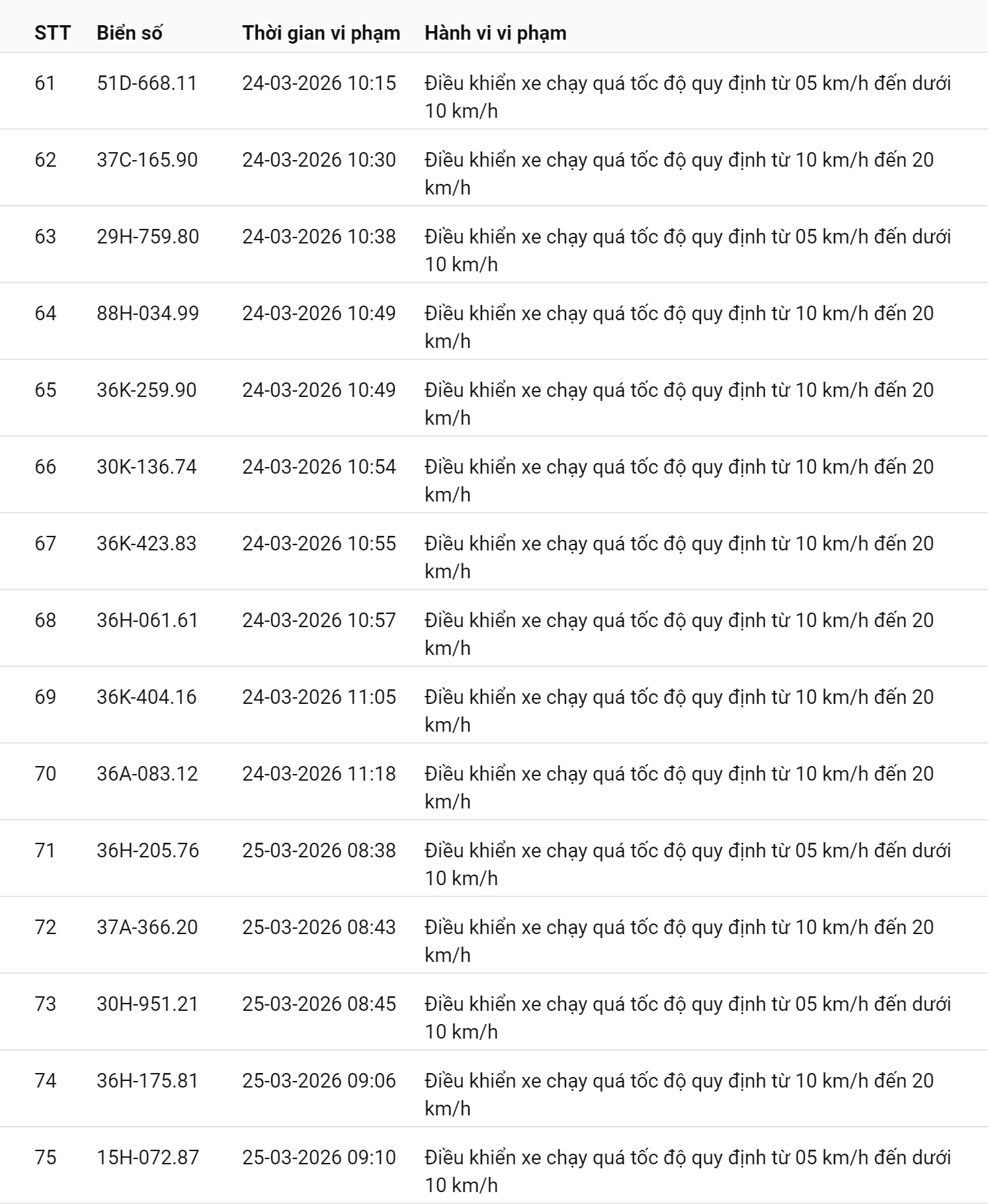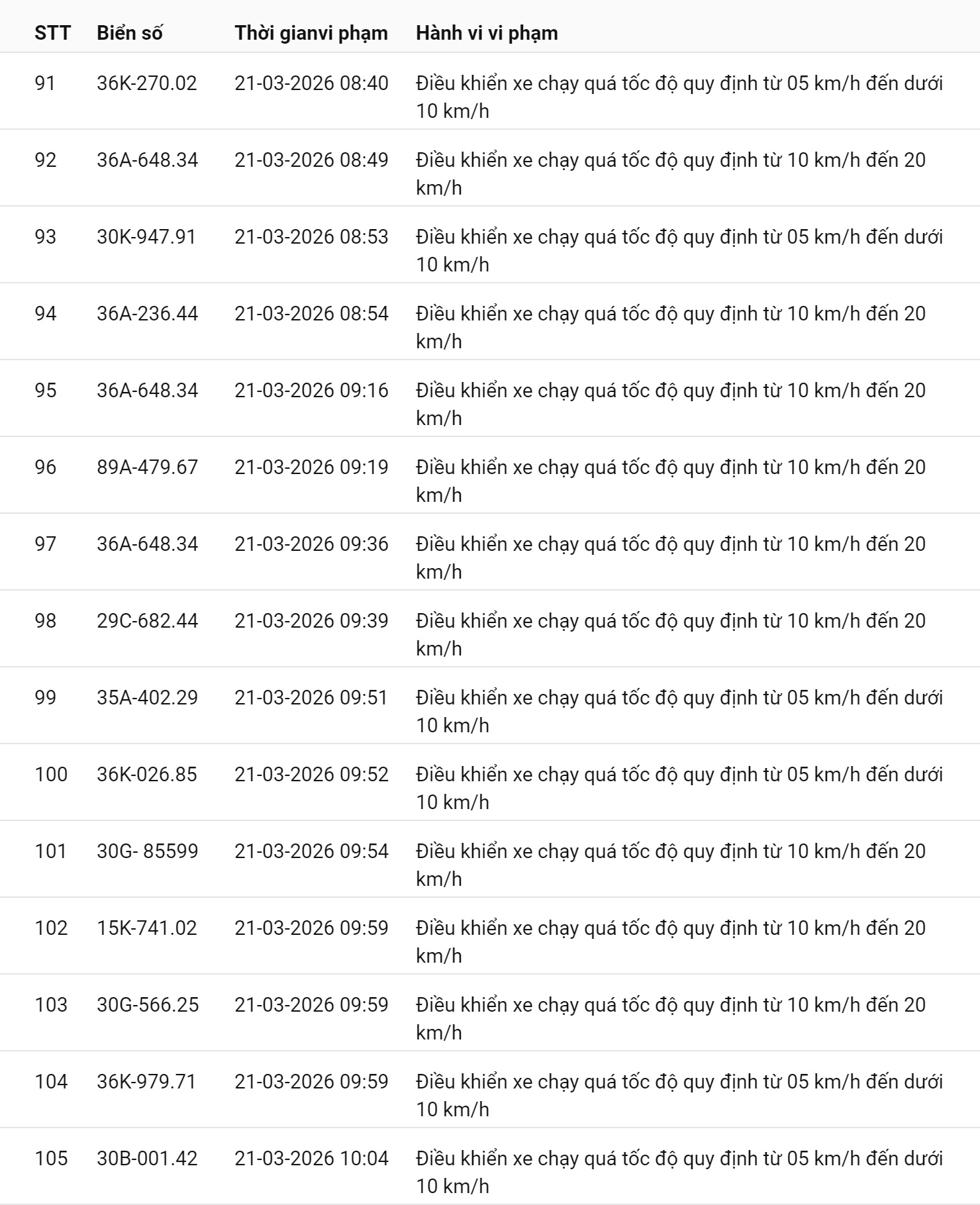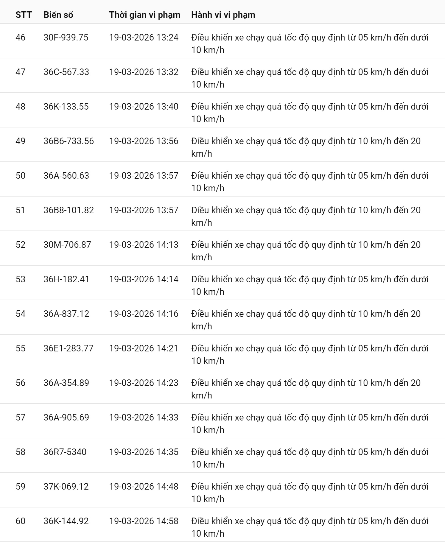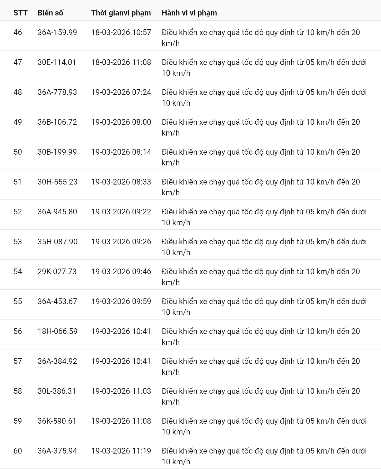 Theo thông báo từ Công an tỉnh Thanh Hóa đăng tải ngày 25/4, thông qua thiết bị kỹ thuật nghiệp vụ, các tổ công tác của phòng CSGT đã phát hiện, ghi nhận bằng hình ảnh đối với tổng số 793 trường hợp phương tiện vi phạm quy định về tốc độ trên các tuyến Quốc lộ trong thời gian từ ngày 16/03/2026 đến ngày 31/03/2026. Danh sách biển số vi phạm cụ thể như sau: