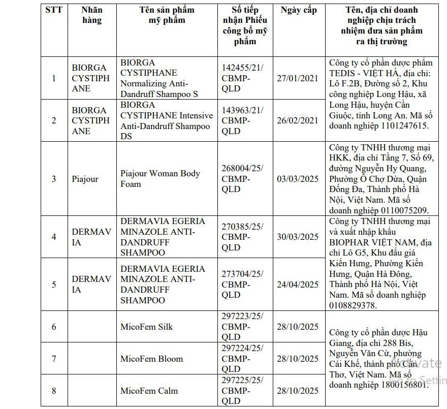 8 sản phẩm bị thu hồi gồm: Hai sản phẩm dầu gội của Công ty cổ phần dược phẩm TEDIS - Việt Hà: Biorga Cystiphane Normalizing Anti-Dandruff Shampoo S và Biorga Cystiphane Intensive Anti-Dandruff Shampoo DS.
