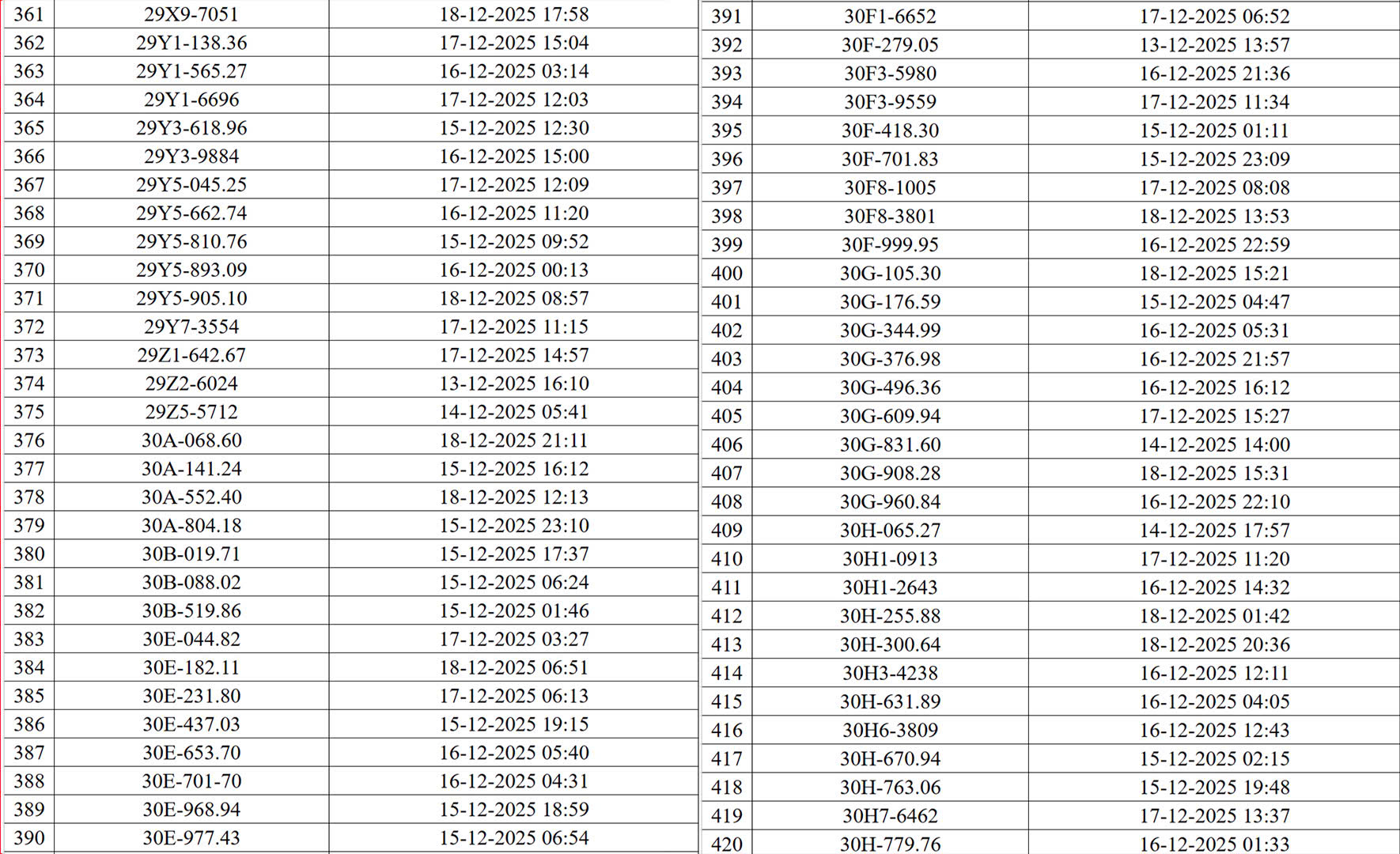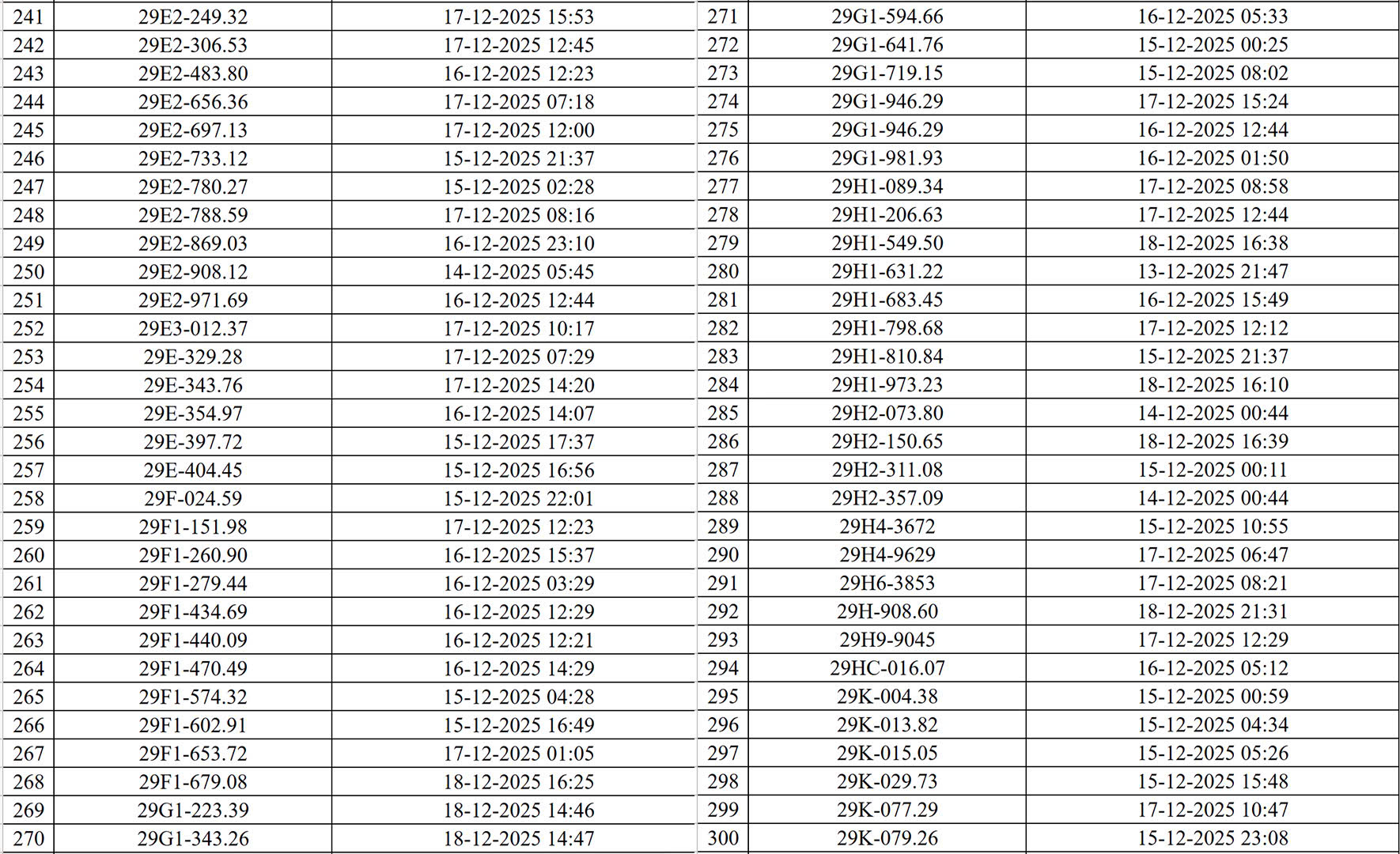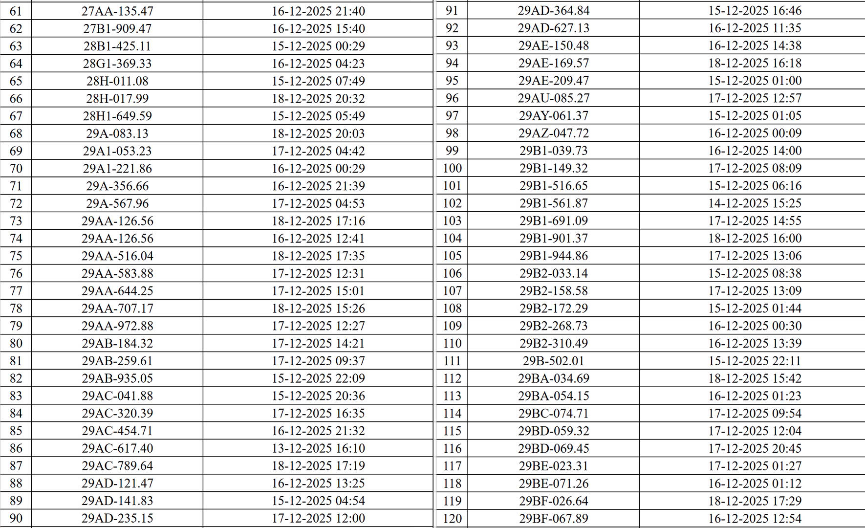 - 30-12-2025Hà Nội thông báo 545 chủ xe máy, ô tô có biển số sau nhanh chóng nộp phạt nguội theo Nghị định 168