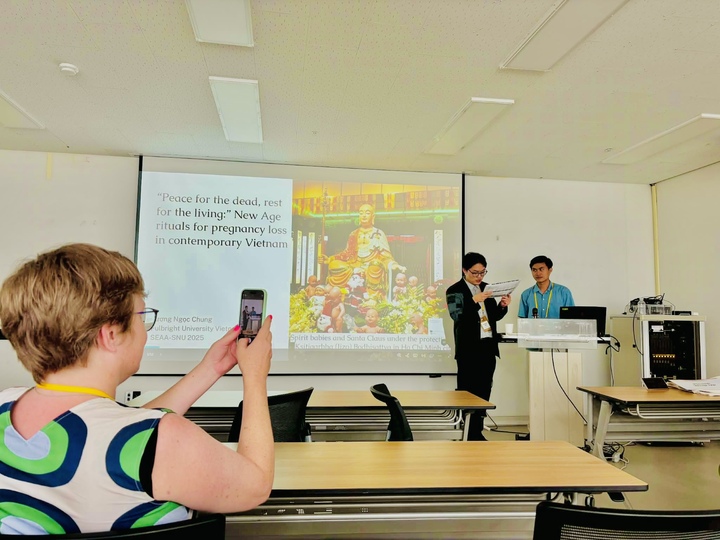 Ngọc Chung (áo xanh) trình bày tại hội thảo “Định hình tương lai: Đông Á như thực tiễn” tại Đại học Quốc gia Seoul mùa hè 2025, đồng tổ chức bởi Nhân học Đông Á Hội (Hiệp hội Nhân học Hoa Kỳ) và Đại học Quốc gia Seoul mùa hè 2025.