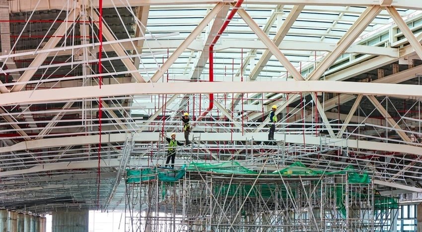 Công nhân thi công mái nhà ga sân bay Long Thành. Ảnh: PLO.