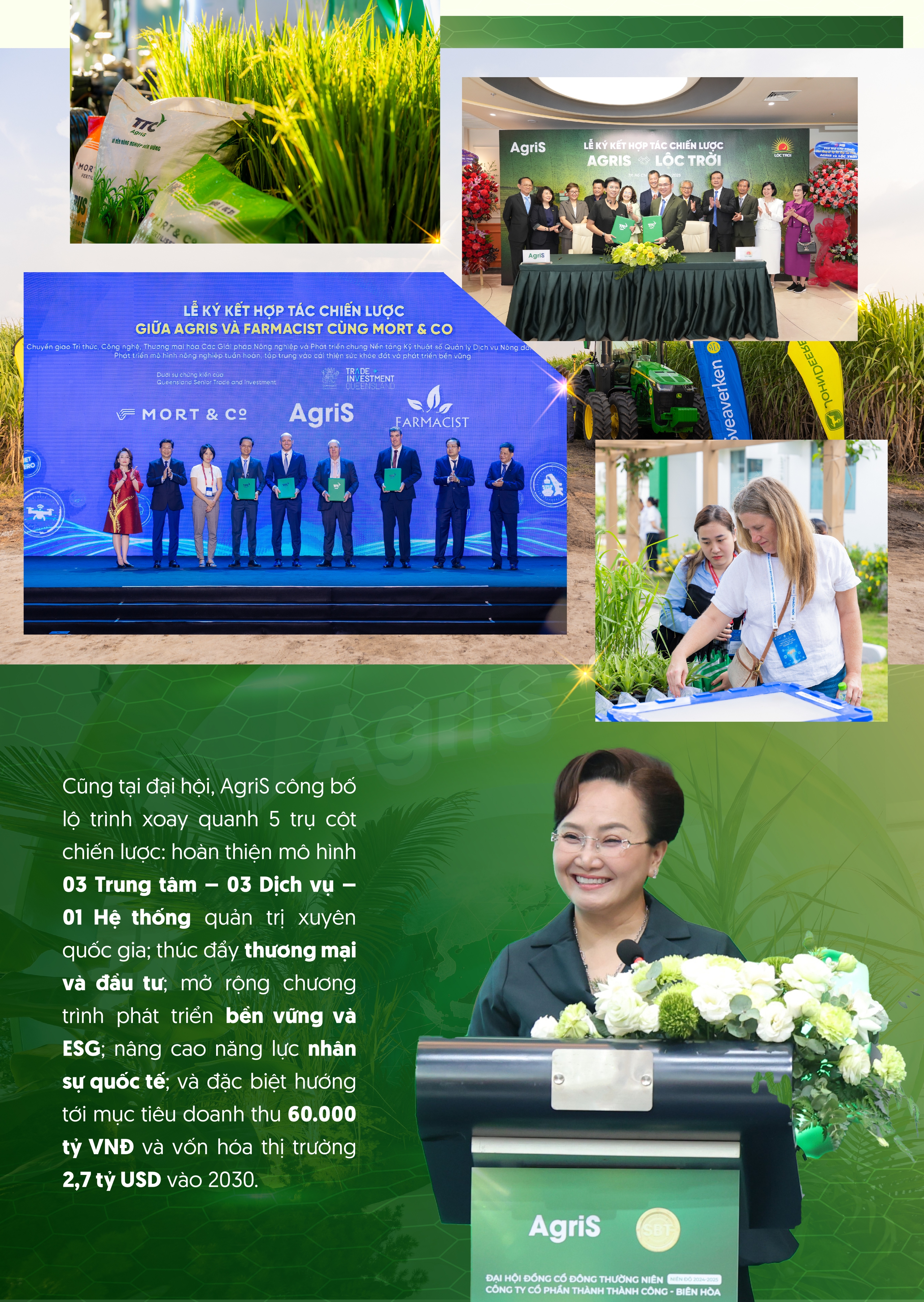Trong niên độ 2024–2025, tại Đại hội đồng Cổ đông thường niên, AgriS tiếp tục thể hiện định hướng chiến lược này rõ nét. Đáng chú ý, vào ngày 08/12 vừa qua, doanh nghiệp đã ký kết hợp tác chiến lược với Tập đoàn Lộc Trời nhằm tối ưu hóa chuỗi giá trị gạo. Sự kết hợp giữa kinh nghiệm hàng chục năm của Lộc Trời trong lĩnh vực lúa gạo cùng hệ thống phân phối rộng khắp, năng lực công nghệ quy trình và giải pháp Tài chính chuỗi cung ứng (Supply Chain Finance) cho nông dân của AgriS được kỳ vọng sẽ tạo ra sức bật mới giúp tối ưu chuỗi giá trị lúa gạo, gia tăng sức cạnh tranh của gạo Việt trên toàn cầu.