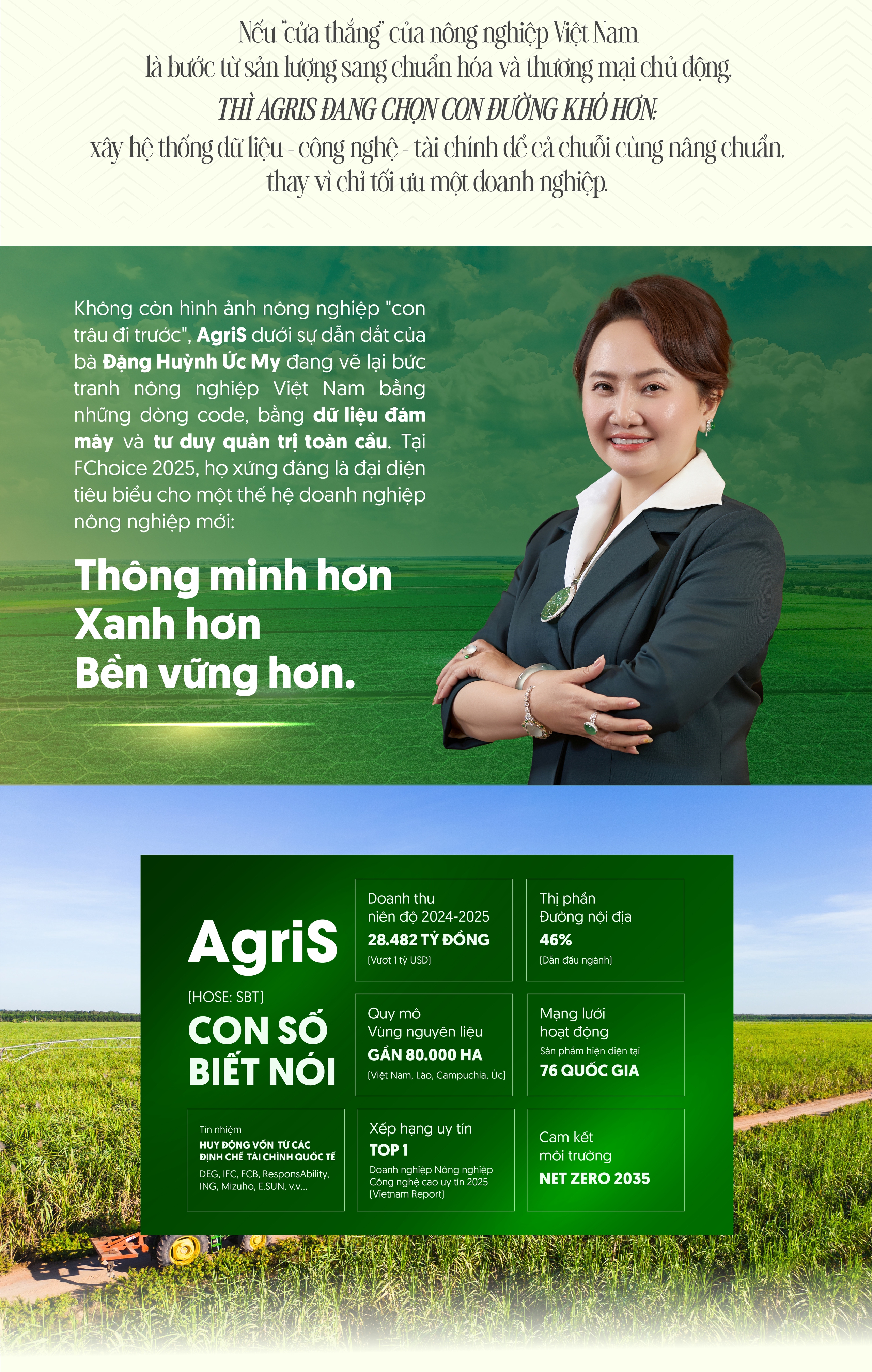 "Công nghệ cao là cái nút bấm cuối cùng của nồi cơm điện. Nhưng để ra được cái nút bấm đó là cả một quá trình nghiên cứu gạo nào, nước bao nhiêu, nhiệt độ thế nào." - Triết lý này của nữ chủ tịch Đặng Huỳnh Ức My đã định hình cách AgriS ứng dụng công nghệ: Không làm màu, mà tập trung vào chuẩn hóa quy trình và ghi nhận "dữ liệu gốc".