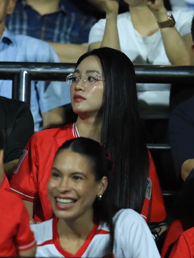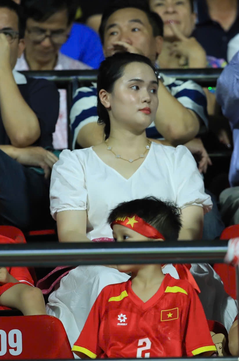 Dù bận rộn khi vừa chăm sóc 2 con trên khán đài vừa cổ vũ tuyển Việt Nam, Quỳnh Anh vẫn luôn giữ được vẻ tươi tắn. Cô liên tục nở nụ cười và không giấu nổi niềm tự hào khi chứng kiến ông xã thi đấu thăng hoa dưới sân cỏ.