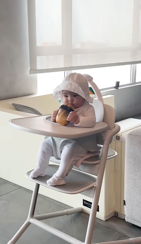 Bé Gạo khiến ai nấy "đốn tim" khi ngồi ngay ngắn trên ghế ăn, tự cầm bình sữa và chăm chú hút sữa một cách thành thạo.