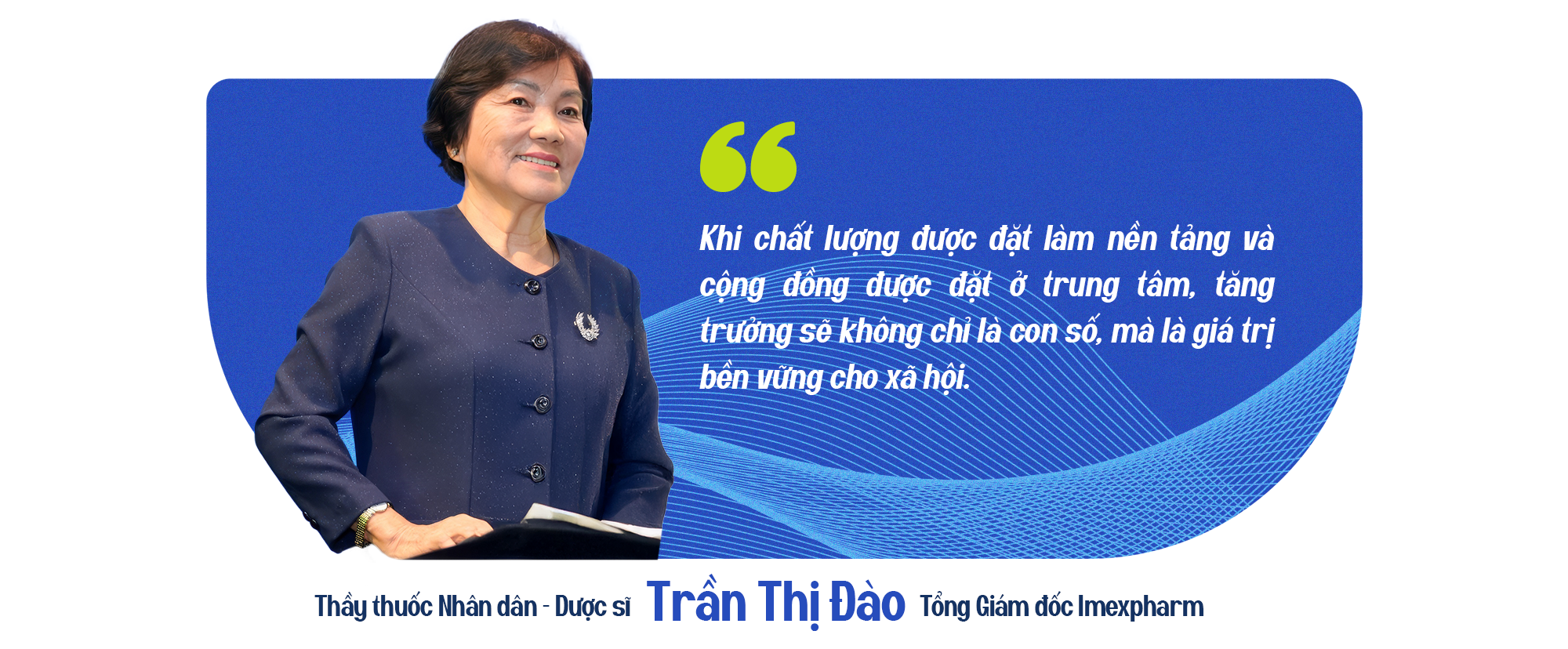 Thầy thuốc Nhân dân, Dược sĩ Trần Thị Đào, Tổng Giám đốc Imexpharm chia sẻ: "Để có thể tăng trưởng bền vững, các mục tiêu kinh doanh của doanh nghiệp phải song hành với lợi ích của cộng đồng và định hướng chung của quốc gia. Khi Việt Nam đặt quyết tâm nâng cao năng lực tự chủ dược phẩm, đó không chỉ là chiến lược ngành, mà còn là lời nhắc nhở về trách nhiệm của mỗi doanh nghiệp nội địa.