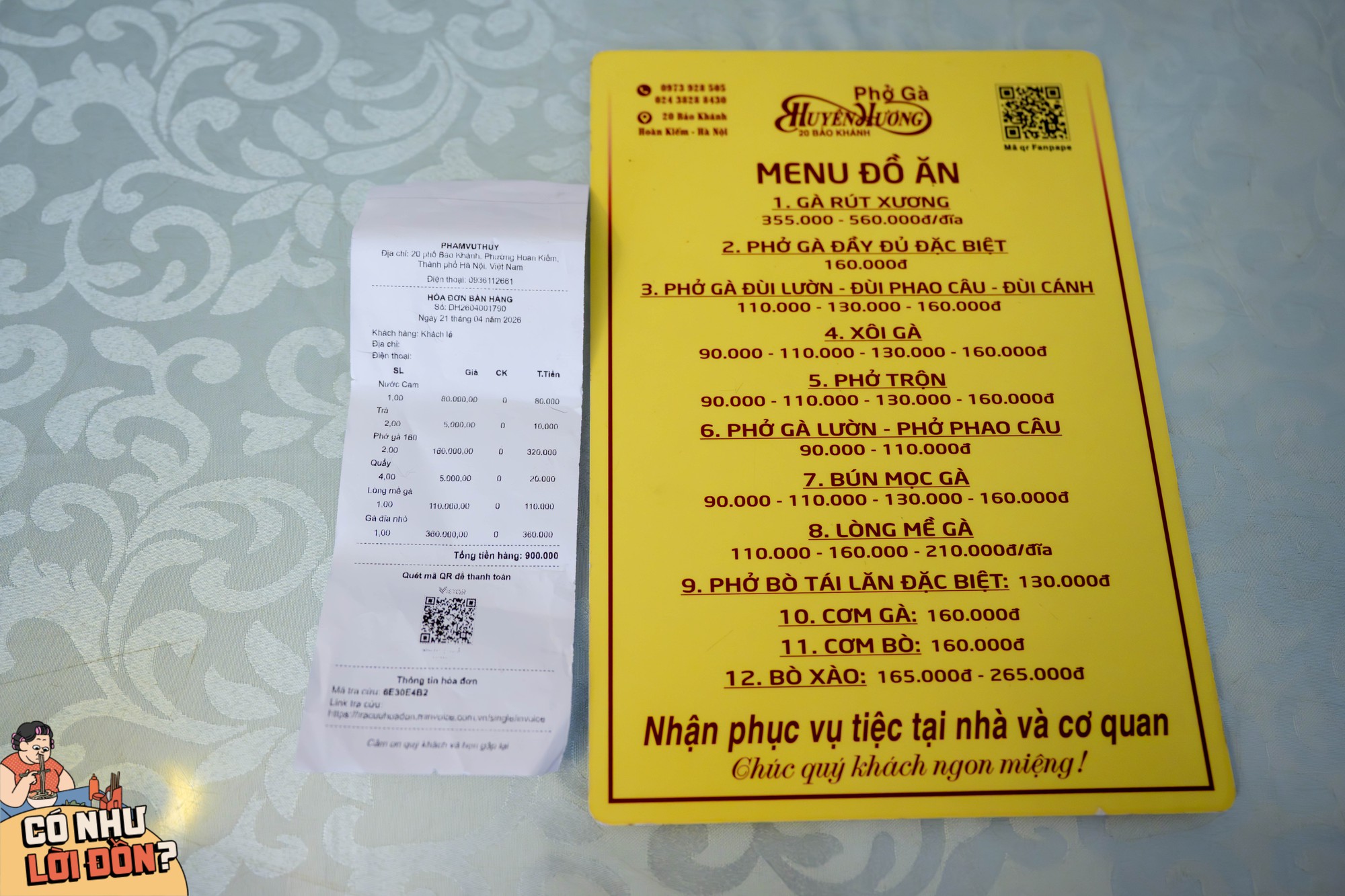 Hoá đơn cho phần ăn bao gồm 2 bát phở gà đặc biệt, 1 đĩa gà nhỏ, 1 phần lòng mề trứng non, 1 ly nước cam, 2 trà đá và 4 chiếc quẩy là 900.000 đồng. Menu cũng niêm yết giá rõ ràng