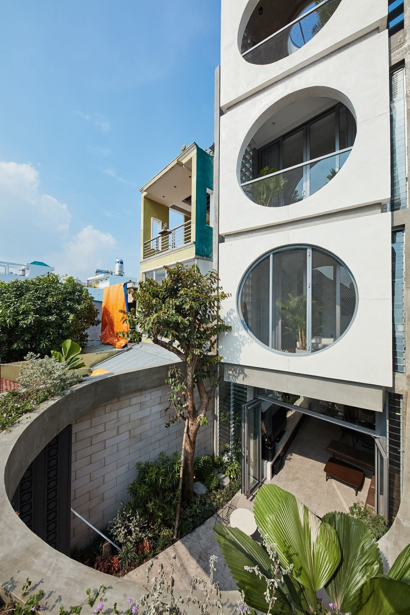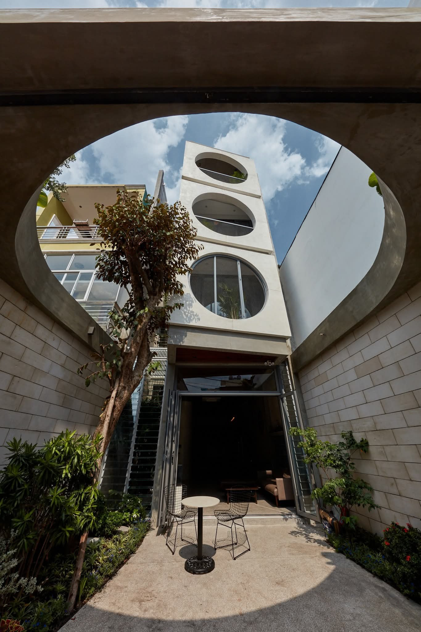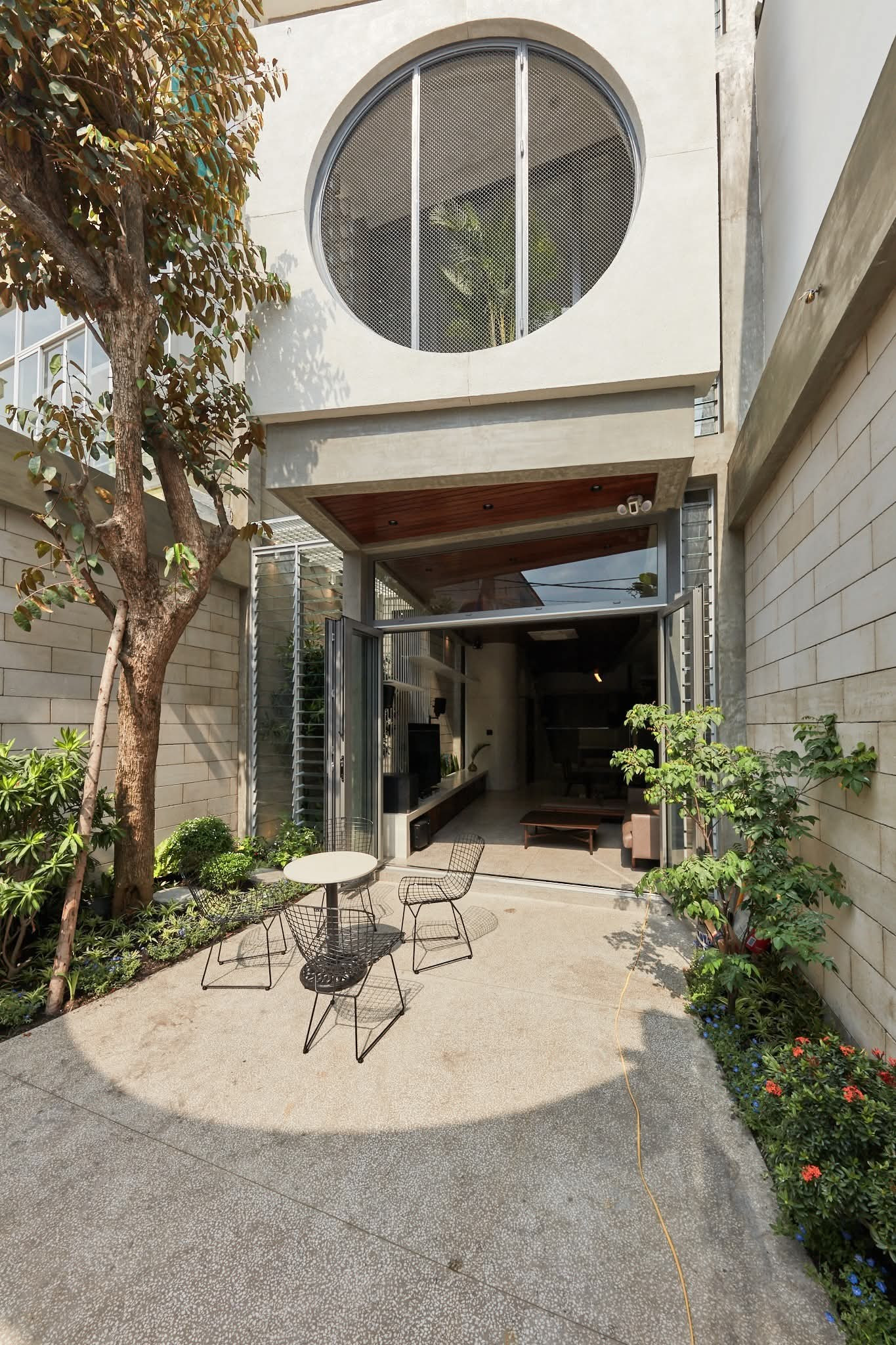 Dự án được thiết kế khá táo bạo khi co cụm khối ở, chừa hai biên khe sáng thông thoáng hai bên và xoay mặt tiền khối nhà về hướng có lợi hơn để thoải mái lấy sáng cho từng ngóc ngách của ngôi nhà.