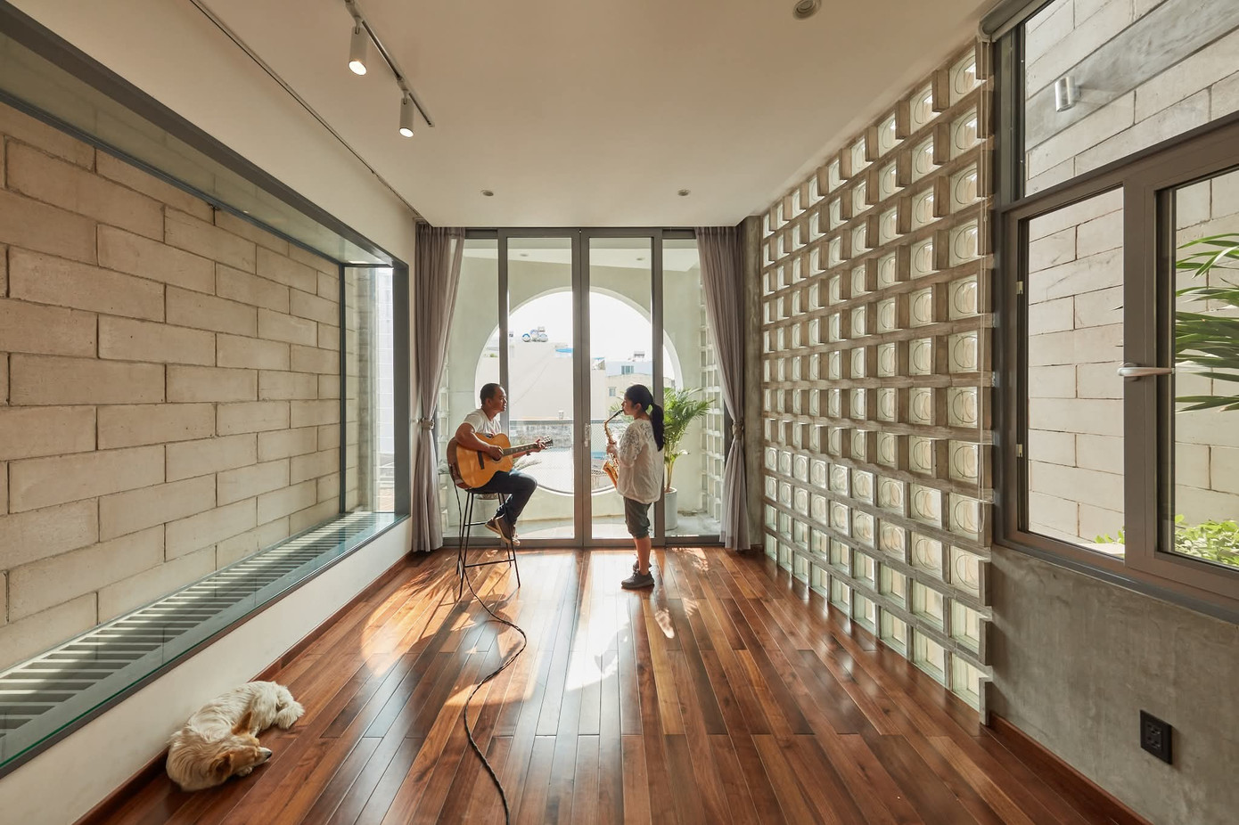 Ngôi nhà được lấy cảm hứng từ đàn guitar, có mặt tiền ấn tượng với các phần khoét hình học chạy dọc khắp mặt tiền, vừa là điểm nhấn vừa là cách lấy sáng và thông khí cho không gian bên trong.