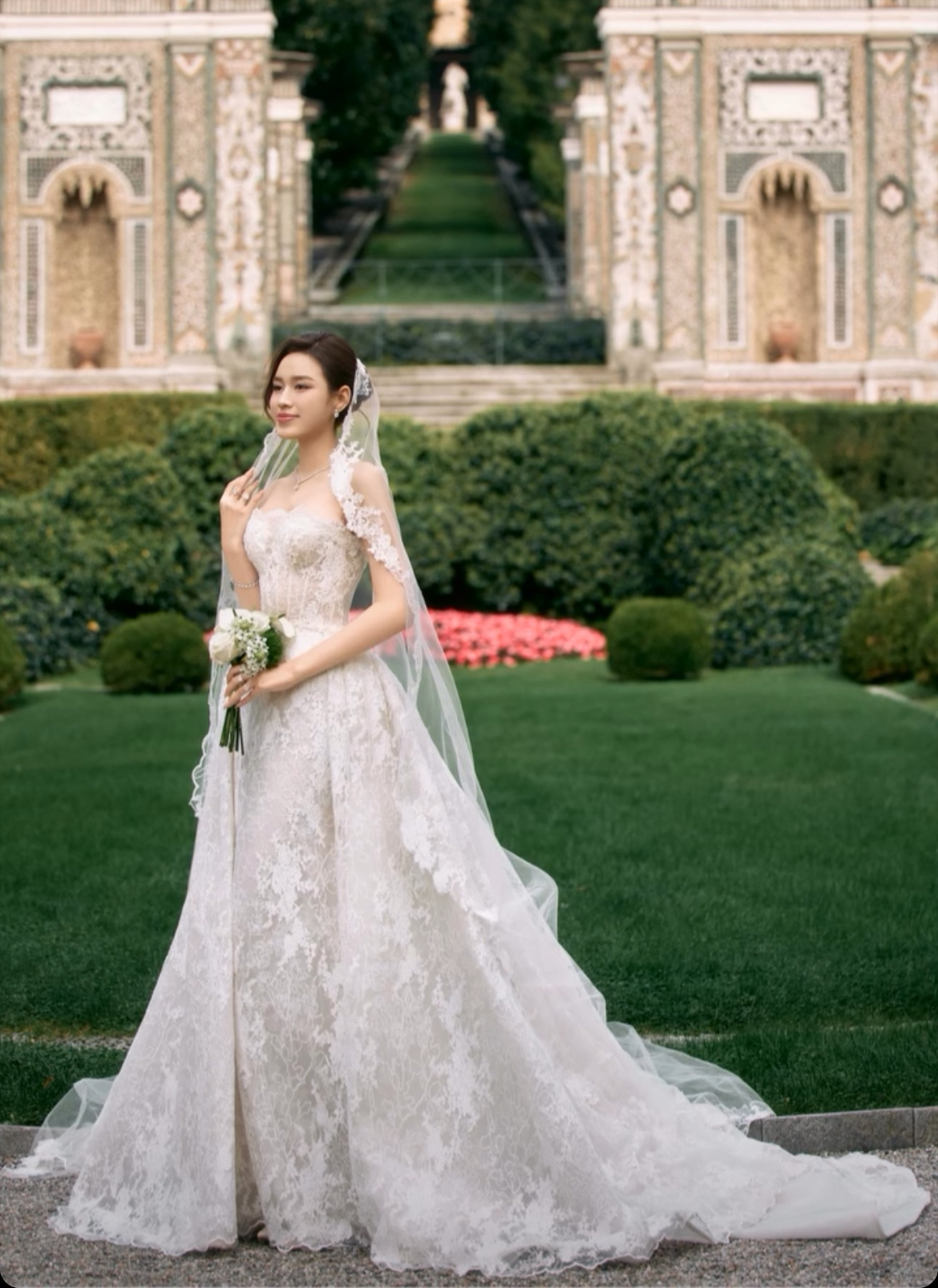 Mới đây, nhiếp ảnh gia thực hiện bộ ảnh cưới của Đỗ Hà và Việt Vương tại châu Âu bất ngờ chia sẻ thêm loạt hình ảnh chưa từng được công bố trước đó. Trong bộ ảnh, Đỗ Hà diện váy cưới ren trắng tinh tế, thiết kế ôm dáng kết hợp phần đuôi dài mềm mại, tôn lên vẻ đẹp thanh lịch và nữ tính của nàng hậu. Mái tóc búi gọn cùng lớp voan dài giúp tổng thể hình ảnh mang hơi hướng cổ điển, giống như một nàng công chúa trong khung cảnh châu Âu cổ kính. Bên cạnh đó, doanh nhân Việt Vương xuất hiện với bộ tuxedo đen lịch lãm. Cả hai thể hiện nhiều khoảnh khắc tình tứ như nắm tay dạo bước trong khu vườn, trao ánh nhìn đầy tình cảm hay ôm nhau dưới lớp voan cưới. Không gian kiến trúc cổ điển cùng khu vườn xanh mướt càng làm nổi bật vẻ sang trọng và lãng mạn.