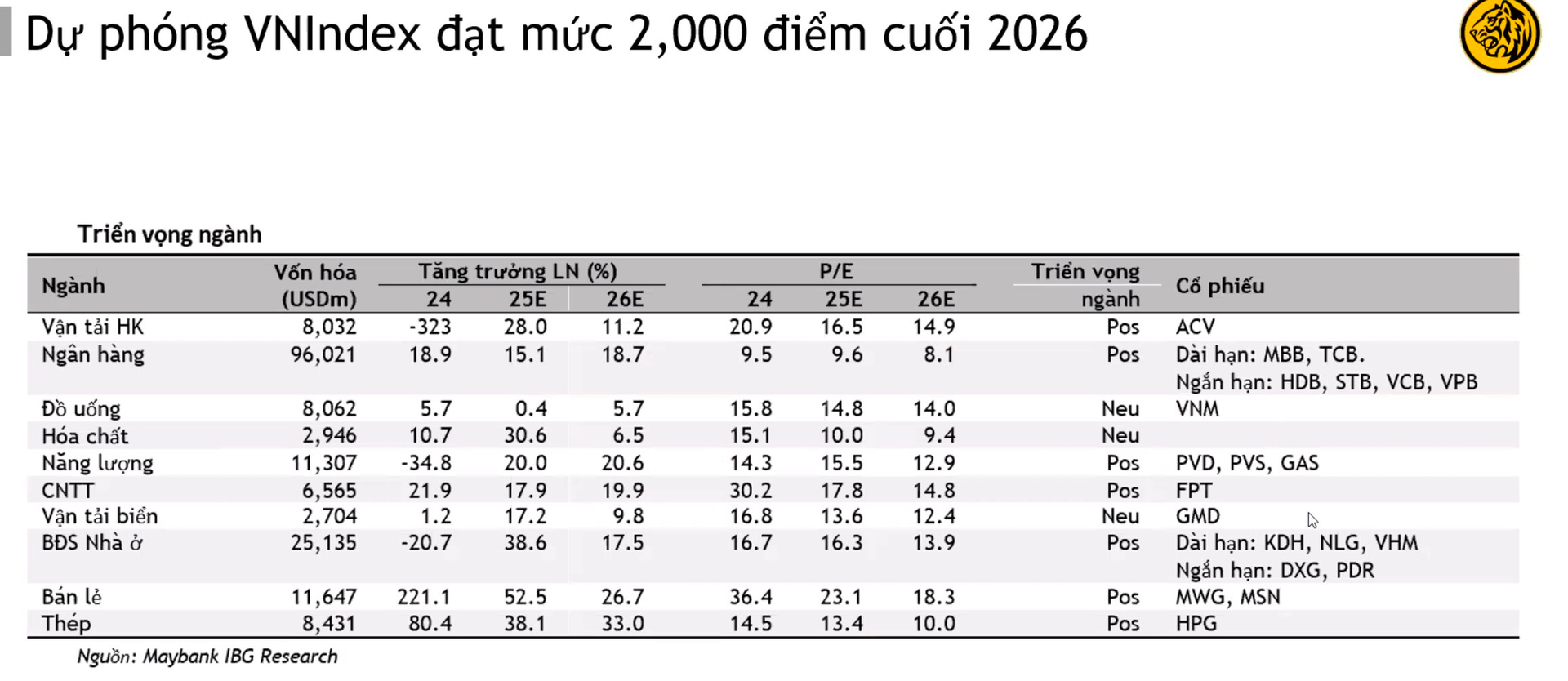Với bất động sản nhà ở , Maybank chọn lọc cơ hội ở một số doanh nghiệp cụ thể thay vì toàn ngành, trong đó nhấn mạnh Vinhomes và Nam Long. Ngành bán lẻ không được kỳ vọng là động lực tăng trưởng chính của nền kinh tế năm 2026, song các doanh nghiệp đầu ngành như MWG, PNJ, Masan có thể tiếp tục mở rộng thị phần và cải thiện lợi nhuận nhờ lợi thế quy mô và năng lực triển khai.
