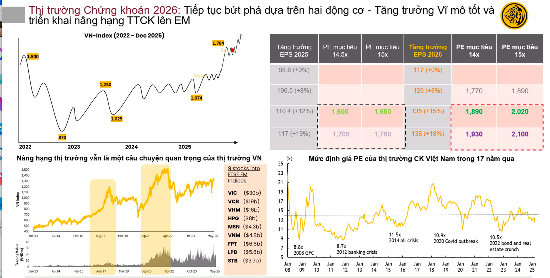 Nếu loại trừ nhóm Vingroup (bao gồm Vingroup, Vinhomes, Vincom Retail và Vinpearl), định giá thị trường vẫn thấp hơn mức trung bình 5 năm, được đánh giá là hợp lý và chưa tạo ra rủi ro đáng lo ngại. Mốc 2.000 điểm tương ứng với mức định giá P/E khoảng 14–14,5 lần, tiệm cận trung bình 5 năm của thị trường.