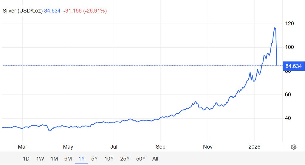Giá bạc thế giới đã chứng kiến mức giảm sâu chưa từng có trong phiên thứ 6 (30/1), hạ xuống dưới 85 USD một ounce. Trong phiên, giá có thời điểm xuống 75 USD. Đây cũng là phiên mất giá mạnh nhất lịch sử của bạc, theo hãng dữ liệu tài chính LSEG.