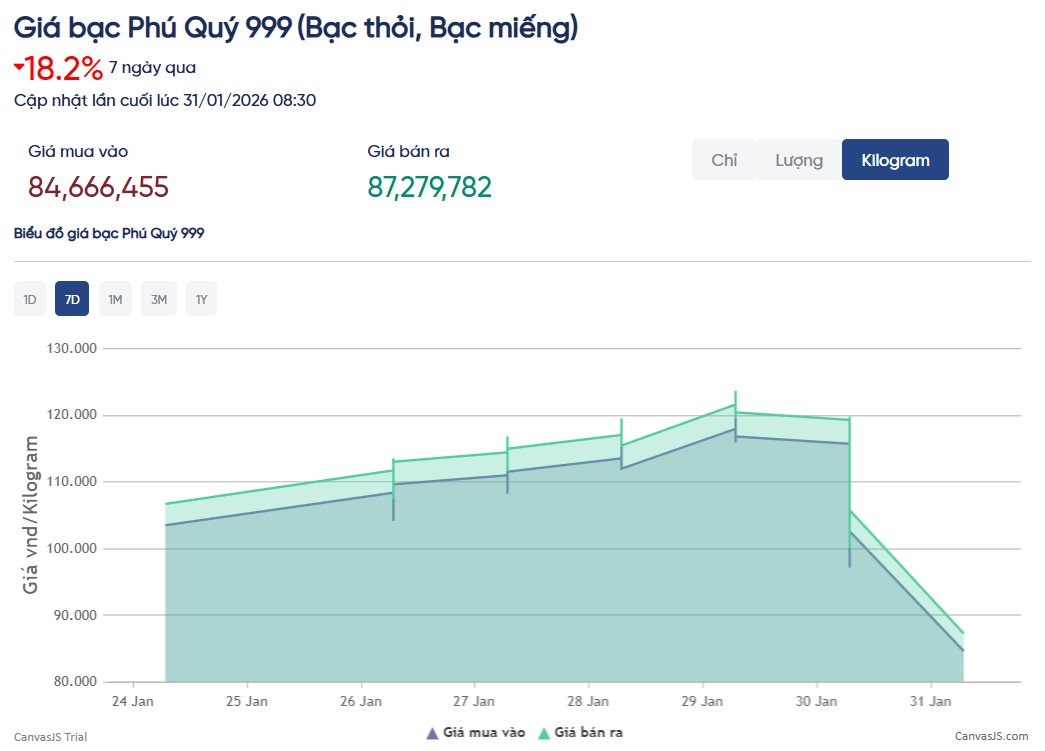 Tại thị trường trong nước, giá bạc thỏi cũng không nằm ngoài xu hướng. Theo dữ liệu từ Tập đoàn Vàng bạc Đá quý Phú Quý, bạc 999 1 kg niêm yết ở mức 84,666 triệu đồng/lượng (mua vào) và 87,279 triệu đồng/lượng (bán ra), giảm mạnh hơn 34 triệu đồng/kg (mua vào) và 36 triệu đồng/kg (bán ra) so với đỉnh hôm 29/1.