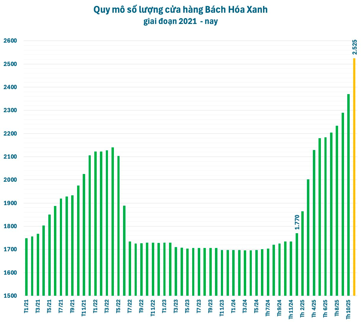 Theo cập nhật trên website bachhoaxanh.com, chuỗi bán lẻ thực phẩm và hàng tiêu dùng Bách Hóa Xanh (BHX) hiện có đến 2.525 cửa hàng, con số kỷ lục kể từ khi hoạt động. Chỉ trong vòng một tháng rưỡi kể từ cuối tháng 10, BHX đã mở thêm 155 cửa hàng, chủ yếu tại khu vực tỉnh Ninh Bình, Hưng Yên.