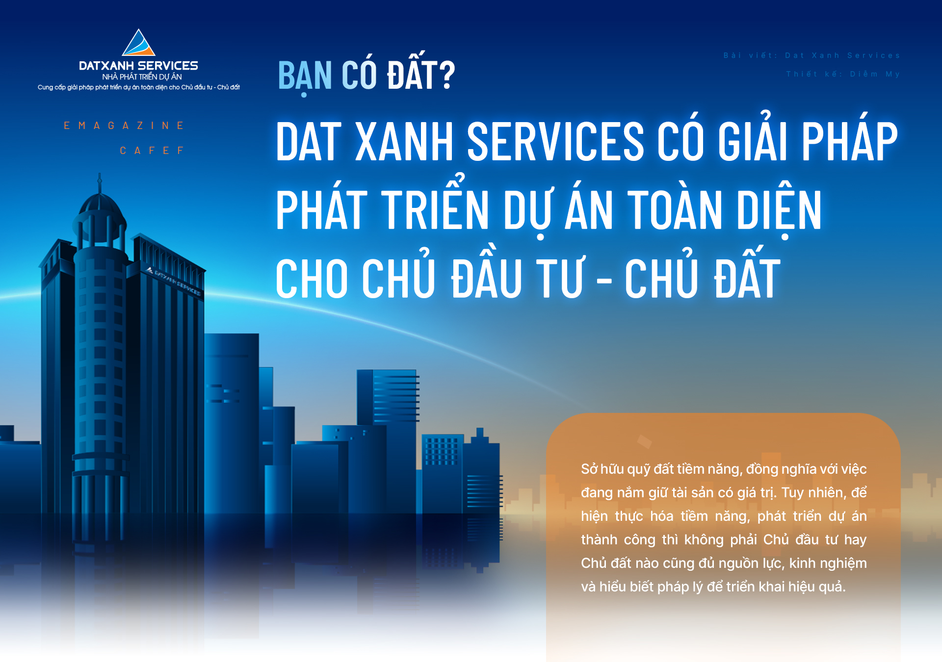 Bằng năng lực và kinh nghiệm đã được chứng minh qua hàng trăm dự án phát triển thành công, Dat Xanh Services - một điểm đến cho mọi nhu cầu phát triển dự án, giúp chuyển hóa các quỹ đất thành những dự án có giá trị cao, cung cấp giải pháp phát triển dự án toàn diện, giúp tối ưu hóa lợi nhuận và xây dựng thương hiệu uy tín cho Chủ đầu tư, Chủ đất.
