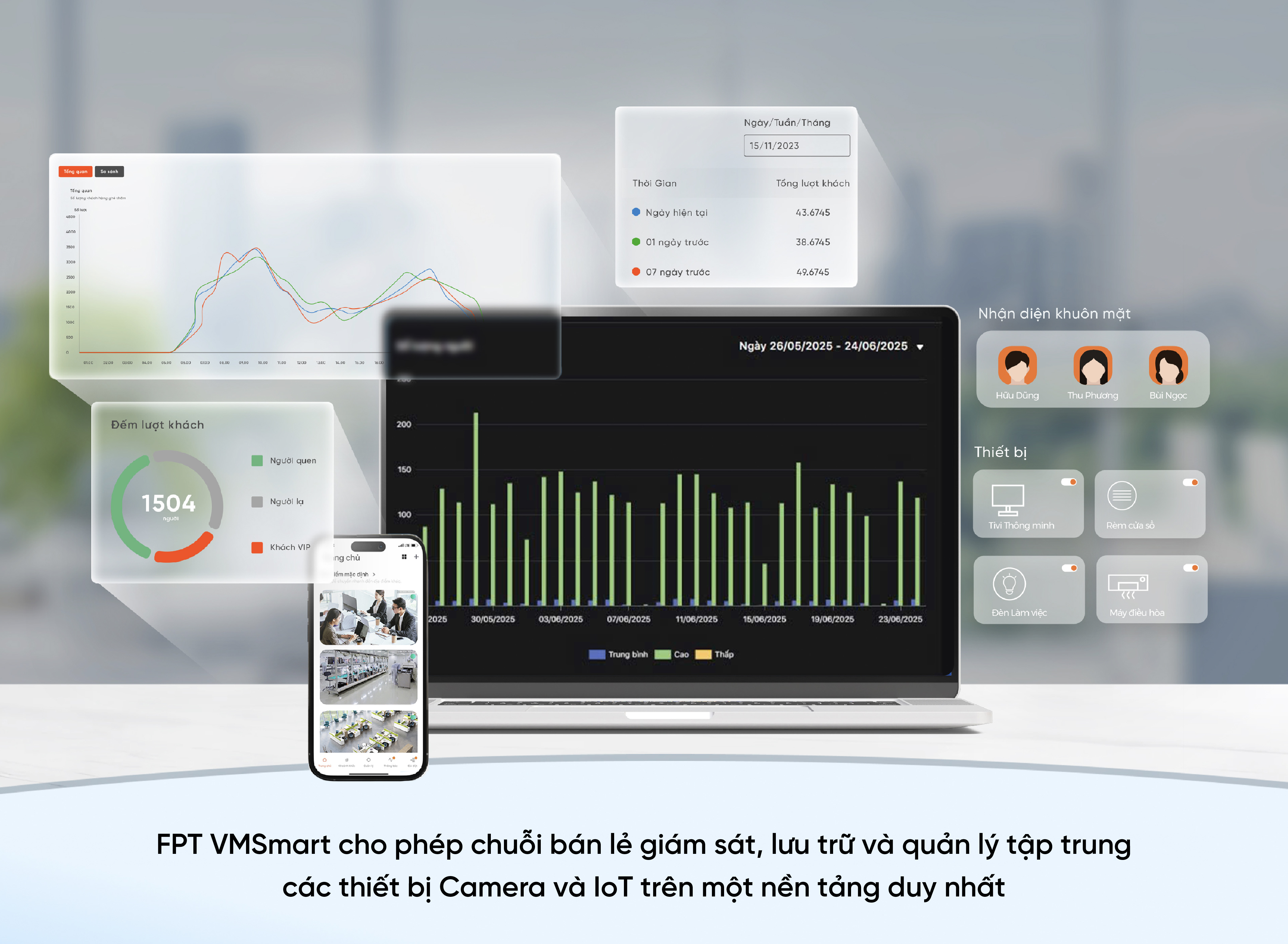 Tất cả dữ liệu từ camera đều được kết nối và phân tích tập trung trên nền tảng quản trị FPT VMSmart, cho phép chủ doanh nghiệp theo dõi mọi chi nhánh từ xa, so sánh hiệu suất, điều chỉnh nhân sự và kiểm soát toàn bộ hoạt động vận hành chỉ qua một giao diện duy nhất. Sử dụng cơ chế lưu trữ tập trung, đồng bộ dữ liệu video từ nhiều chi nhánh lên hệ thống cloud, giúp truy xuất nhanh, linh hoạt, doanh nghiệp không phải đầu tư thiết bị lưu trữ riêng giúp giảm chi phí. Dữ liệu từ các chi nhánh được hệ thống tổng hợp và phân tích sẵn dưới dạng dashboard trực quan, giúp nhà quản lý dễ dàng so sánh hiệu quả vận hành giữa các cửa hàng. Giải quyết các bài toán về việc đưa quyết định dựa trên cảm tính của doanh nghiệp. Nhờ đó, doanh nghiệp có thể đưa ra các điều chỉnh linh hoạt theo đặc thù từng điểm bán – từ cách bố trí sản phẩm, phân bổ nhân sự, triển khai chương trình khuyến mãi đến tối ưu không gian trưng bày.