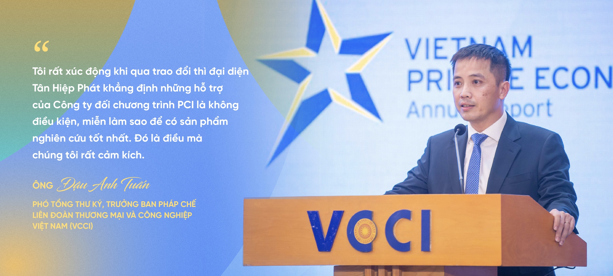 "Tôi đặc biệt tự hào về việc những chương trình có ý nghĩa lớn với cộng đồng doanh nghiệp và đất nước giờ đây có sự hỗ trợ và đồng hành từ doanh nghiệp tư nhân trong nước chứ không cần đến nước ngoài nữa. Tôi rất xúc động khi qua trao đổi thì đại diện Tân Hiệp Phát khẳng định những hỗ trợ của Công ty đối chương trình PCI là không điều kiện, miễn làm sao để có sản phẩm nghiên cứu tốt nhất. Đó là điều mà chúng tôi rất cảm kích." - ông Đậu Anh Tuấn bộc bạch.