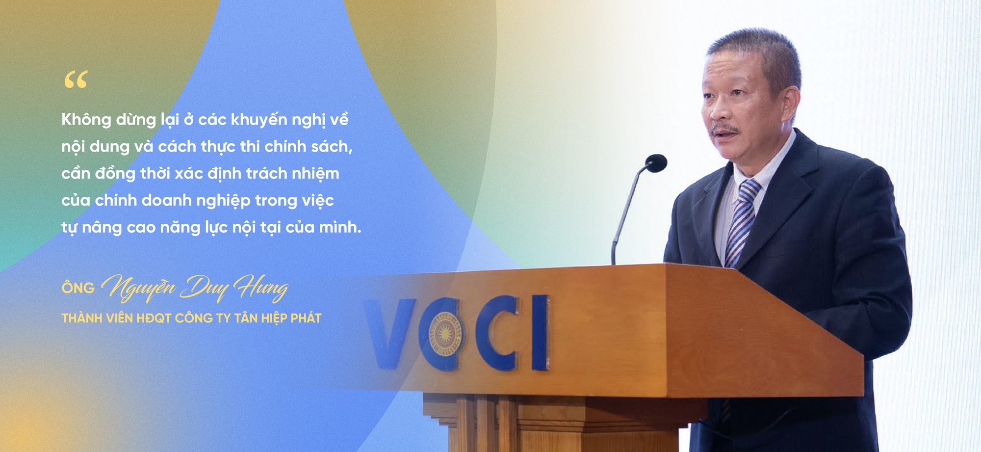 "Không dừng lại ở các khuyến nghị về nội dung và cách thực thi chính sách, cần đồng thời xác định trách nhiệm của chính doanh nghiệp trong việc tự nâng cao năng lực nội tại của mình. Do bản năng sinh tồn và có ý chí, mục tiêu lớn, nhiều doanh nghiệp tư nhân đã vượt qua khó khăn và đã đóng góp, giữ vị thế quan trọng trong một số ngành nghề của nền kinh tế’- ông Nguyễn Duy Hưng, đại diện Tân Hiệp Phát khẳng định.