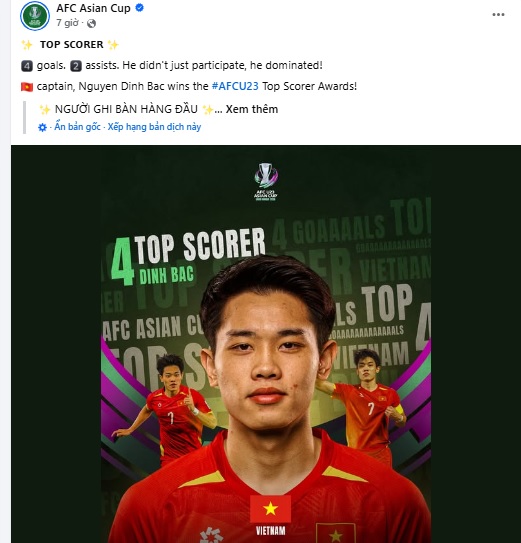 Trang của AFC đăng hình ảnh Đình Bắc ăn mừng kèm theo dòng trạng thái: “Top ghi bàn: 4 bàn thắng, 2 kiến tạo. Anh ấy không chỉ tham dự, anh ấy đã thống trị.
