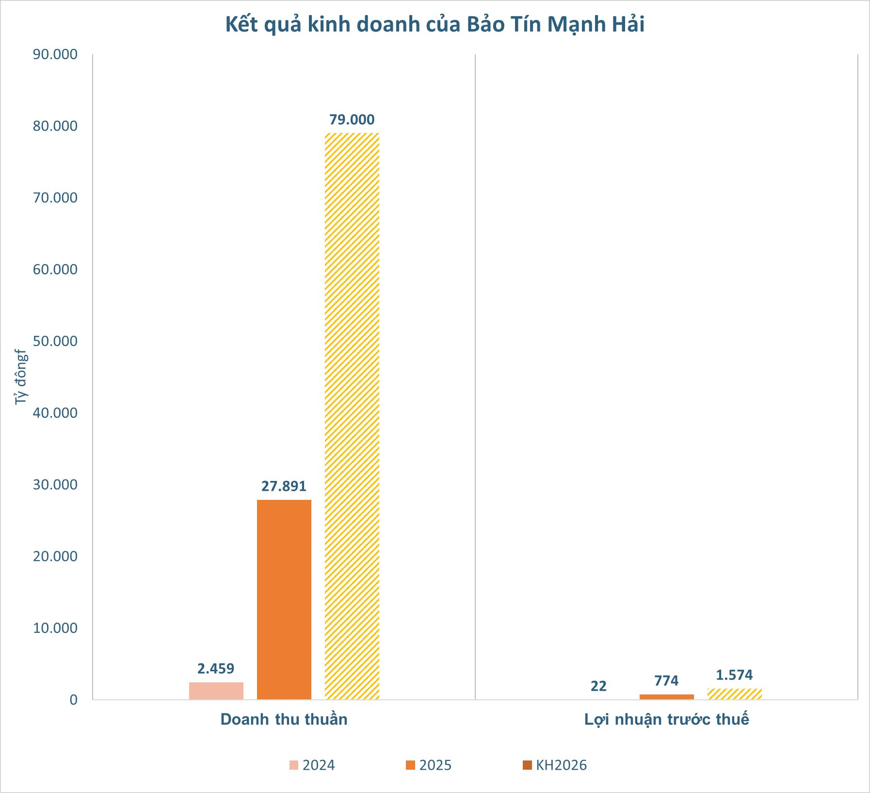 Trong bối cảnh kinh tế vĩ mô được đánh giá thuận lợi với dự báo tăng trưởng GDP Việt Nam đạt 6,3% trong năm 2026, lạm phát toàn cầu hạ nhiệt và nhu cầu tích trữ vàng duy trì xu hướng tích cực, Bảo Tín Mạnh Hải đặt mục tiêu tăng trưởng mạnh mẽ trong năm tới. Cụ thể, doanh thu thuần năm 2026 dự kiến đạt hơn 74.000 tỷ đồng, tăng 165% so với năm 2025, trong khi lợi nhuận sau thuế kỳ vọng đạt hơn 1.574 tỷ đồng, tăng 103%.