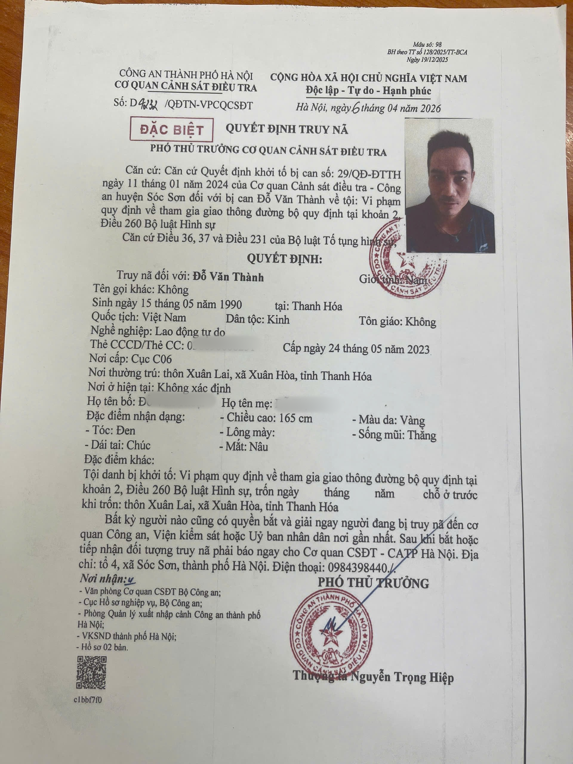 Quyết định truy nã đặc biệt Đỗ Văn Thành - Ảnh: Công an Hà Nội