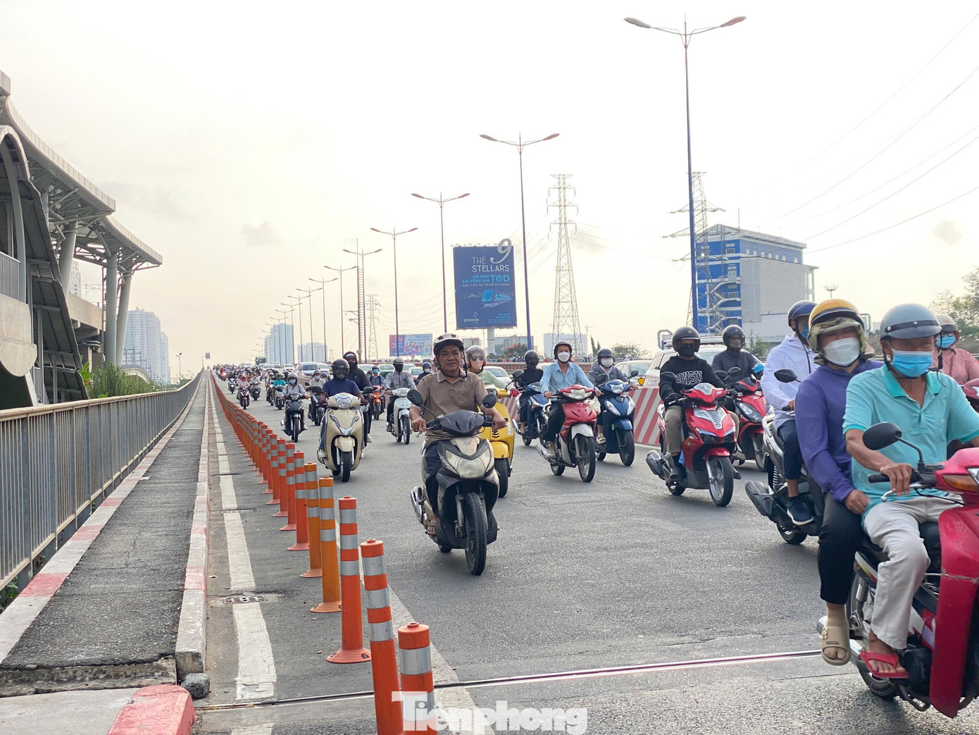 Trên cầu Sài Gòn (hướng từ TP Thủ Đức cũ vào trung tâm TPHCM), dòng xe di chuyển ổn định.