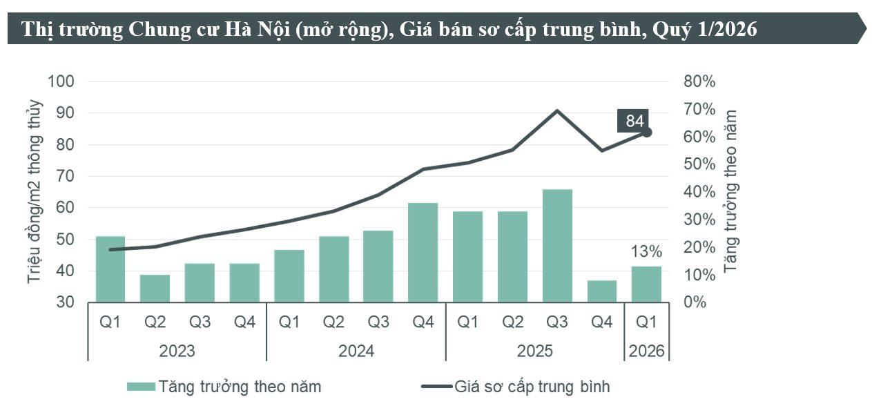 Nguồn: BP. Nghiên cứu, CBRE, Quý 1/2026.Ghi chú: Giá sơ cấp được khảo sát tại khu vực Hà Nội mở rộng bao gồm nguồn cung từ các đại đô thị Ecopark Văn Giang, Vinhomes Ocean Park 2 và 3, Sunshine Legend City và Alluvia City ở Văn Giang (Hưng Yên).