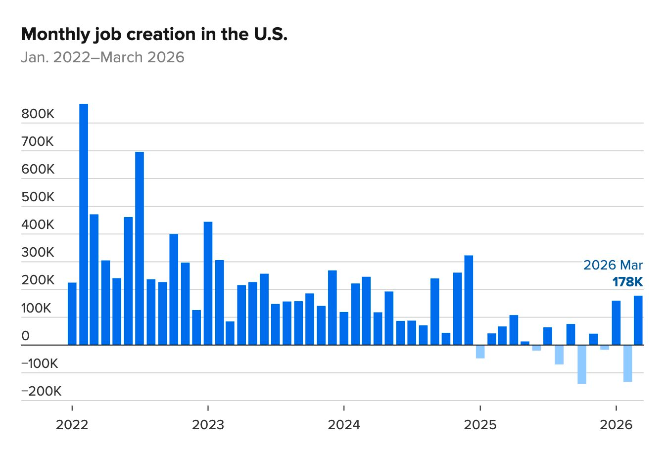 Theo Cục Thống kê Lao động Mỹ (BLS), số việc làm phi nông nghiệp tăng 178.000 trong tháng 3, đảo chiều so với mức giảm 133.000 của tháng 2 và vượt xa dự báo 59.000 của Dow Jones. Số liệu tháng 2 được điều chỉnh giảm thêm 41.000, trong khi tháng 1 được điều chỉnh tăng 34.000 lên 160.000, đưa mức tăng trung bình ba tháng lên khoảng 68.000 việc làm.