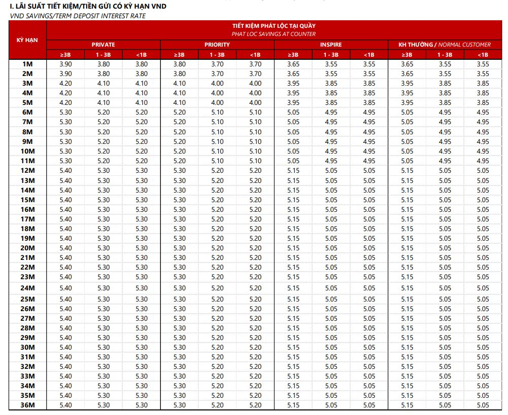 Đối với kỳ hạn dài (12 - 36 tháng), lãi suất cao nhất giảm từ 5,8%/năm xuống 5,4%/năm (áp dụng cho khách hàng Private).