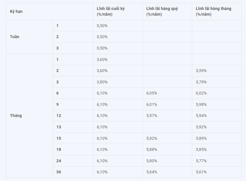 Với nhóm tiền gửi từ 500 triệu đồng đến dưới 2 tỷ đồng, lãi suất tiết kiệm trực tuyến được áp dụng ở mức 4,5%/năm cho kỳ hạn 1 – 2 tháng; 4,6%/năm cho kỳ hạn 3 tháng; 4,7%/năm cho kỳ hạn 4 – 5 tháng và 5,8%/năm đối với các kỳ hạn từ 6 – 36 tháng.