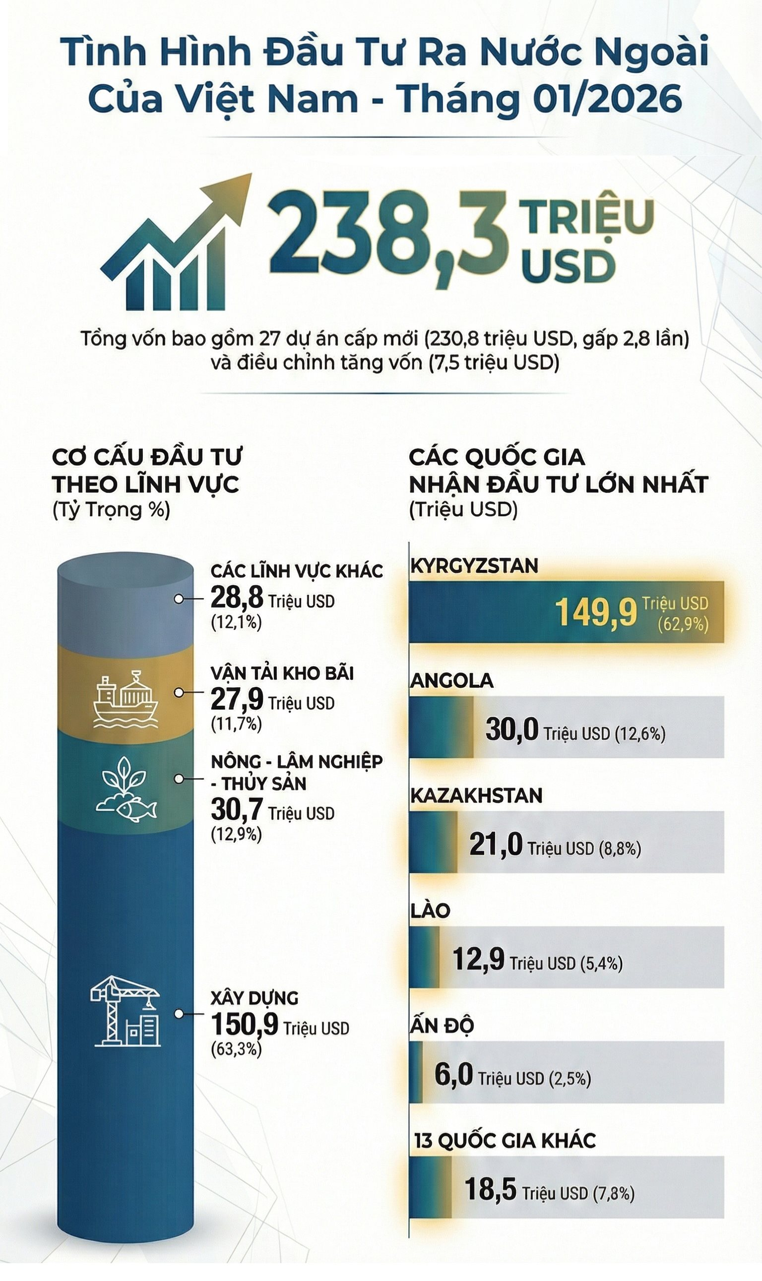 Trong tháng 1/2026, có 18 quốc gia và vùng lãnh thổ nhận đầu tư của Việt Nam. Trong đó, Kyrgyzstan là nước dẫn đầu với 149,9 triệu USD, chiếm 62,9% tổng vốn đầu tư; Angola 30,0 triệu USD, chiếm 12,6%; Kazakhstan 21,0 triệu USD, chiếm 8,8%; Lào 12,9 triệu USD, chiếm 5,4%; Ấn Độ 6,0 triệu USD, chiếm 2,5%.
