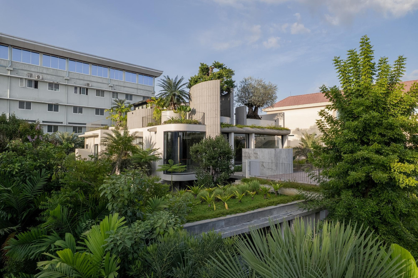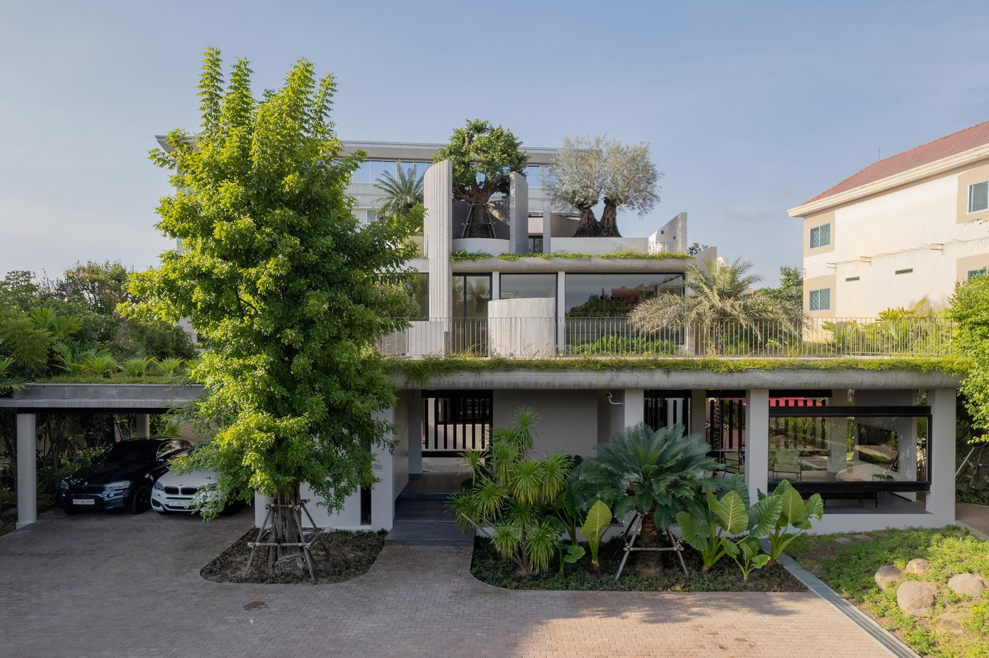 Hai khối nhà được kết nối bằng lối đi có mái che dạng pergola, nơi cây xanh đổ bóng xuống tường và nền sân, hình thành vùng đệm mát mẻ khi di chuyển. Nhìn từ trên cao, công trình như được “giấu mình” trong lớp cây nhiệt đới, với các khối vuông – cong đan xen, giảm tác động thị giác và giữ cho tổng thể công trình luôn nhẹ nhàng, hài hòa.